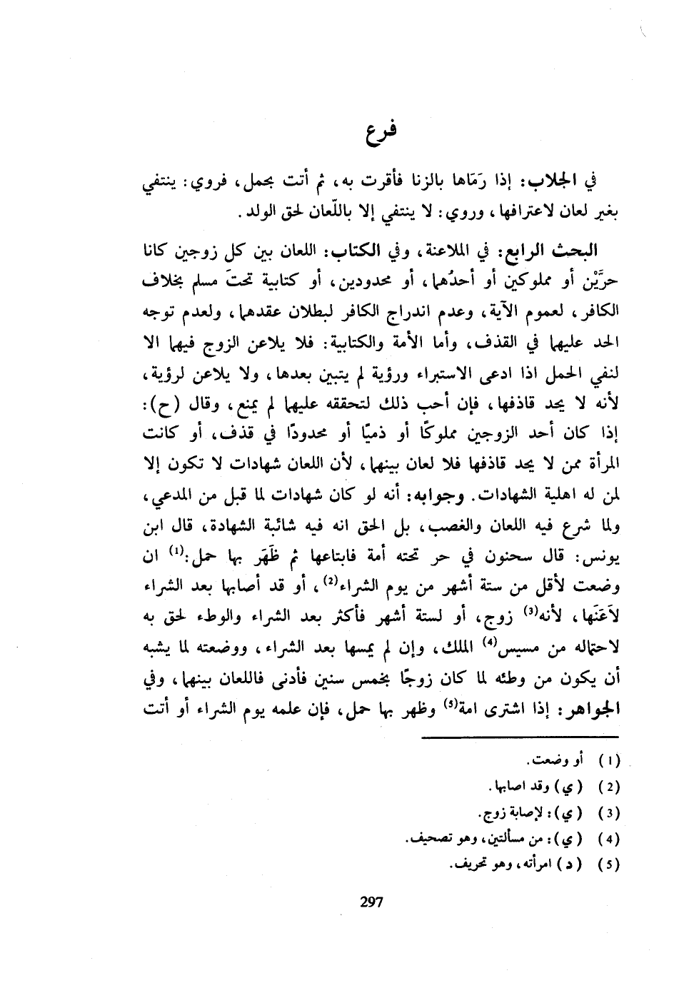 فِي الْجُلَّابِ إِذَا رَمَاهَا بِالزِّنَا فَأَقَرَّتْ بِهِ ثُمَّ أَتَتْ بِحَمْلٍ فَرُوِيَ يَنْتَفِي بِغَيْرِ لِعَانٍ لِاعْتِرَافِهَا وَرُوِيَ لَا يَنْتَفِي إِلَّا بِاللِّعَانِ لِحَقِّ الْوَلَدِ الْبَحْثُ الرَّابِعُ فِي الْمُلَاعَنَةِ وَفِي الْكِتَابِ اللِّعَانُ بَيْنَ كُلِّ زَوْجَيْنِ كَانَا حُرَّيْنِ أَوْ مَمْلُوكَيْنَ أَوْ أَحَدُهُمَا أَوْ مَحْدُودَيْنِ أَوْ كِتَابِيَّةً تَحْتَ مُسْلِمٍ بِخِلَافِ الْكَافِرِ لِعُمُومِ الْآيَةِ وَعَدَمِ انْدِرَاجِ الْكَافِرِ لِبُطْلَانِ عَقْدِهِمَا وَلِعَدَمِ تَوَجُّهِ الْحَدِّ عَلَيْهِمَا فِي الْقَذْفِ وَأَمَّا الْأَمَةُ وَالْكِتَابِيَّةُ فَلَا يُلَاعَنُ الزَّوْجُ فِيهِمَا إِلَّا لِنَفْيِ الْحَمْلِ إِذا ادّعى الِاسْتِبْرَاء ورؤية لم يتَبَيَّن بَعْدَهَا وَلَا يُلَاعَنْ لِرُؤْيَةٍ لِأَنَّهُ لَا يُحَدُّ قَاذِفُهُا فَإِنْ أَحَبَّ ذَلِكَ لِتَحَقُّقِهِ عَلَيْهِمَا لَمْ يُمْنَعْ وَقَالَ ح إِذَا كَانَ أَحَدُ الزَّوْجَيْنِ مَمْلُوكًا أَوْ ذِمِّيًّا أَوْ مَحْدُودًا فِي قَذْفٍ أَوْ كَانَتِ الْمَرْأَةُ مِمَّنْ لَا يُحَدُّ قَاذِفُهُا فَلَا لعان بَينهمَا لِأَن اللّعان شَهَادَات لَا تكون إِلَّا لمن لَهُ أَهْلِيَّة الشَّهَادَات وَجَوَابُهُ أَنَّهُ لَوْ كَانَ شَهَادَاتٍ لَمَا قُبِلَ مِنَ الْمُدَّعِي وَلَمَا شُرِعَ فِيهِ اللِّعَانُ وَالْغَصْبُ بل الْحق أَنه فِيهِ شَائِبَةَ الشَّهَادَةِ قَالَ ابْنُ يُونُسَ قَالَ سَحْنُونٌ فِي حُرٍّ تَحْتَهُ أَمَةٌ فَابْتَاعَهَا ثُمَّ ظَهَرَ بِهَا حَمْلٌ إِنْ وَضَعَتْ لِأَقَلَّ مِنْ سِتَّةِ أَشْهُرٍ مِنْ يَوْمِ الشِّرَاءِ أَوْ قَدْ أَصَابَهَا بَعْدَ الشِّرَاءِ لَاعَنَهَا لِأَنَّهُ زَوْجٌ أَوْ لسِتَّة أشهر فَأكْثر بعد الشِّرَاء وَالْوَطْء لَحِقَ بِهِ لِاحْتِمَالِهِ مِنْ مَسِيسِ الْمِلْكِ وَإِنْ لَمْ يَمَسَّهَا بَعْدَ الشِّرَاءِ وَوَضَعَتْهُ لِمَا يُشْبِهُ أَنْ يَكُونَ مِنْ وَطْئِهِ لَمَّا كَانَ زَوْجًا بِخمْس سِنِين فأدنى فَاللِّعَانُ بَيْنَهُمَا وَفِي الْجَوَاهِرِ إِذَا اشْتَرَى أَمَةً وَظَهَرَ بِهَا حَمْلٌ فَإِنْ عَلِمَهُ يَوْمَ الشِّرَاءِ أَو أَتَت