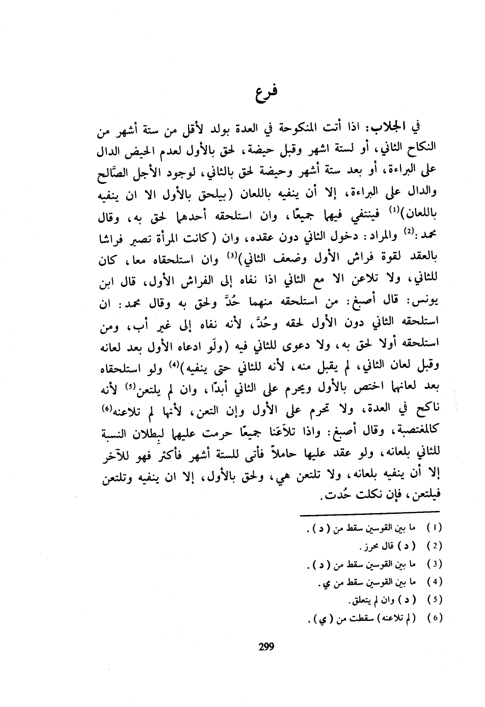 فِي الْجُلَّابِ إِذَا أَتَتِ الْمَنْكُوحَةُ فِي الْعِدَّةِ بِوَلَدٍ لِأَقَلَّ مِنْ سِتَّةِ أَشْهُرٍ مِنَ النِّكَاحِ الثَّانِي أَوْ لِسِتَّةِ أَشْهُرٍ وَقَبْلَ حَيْضَةٍ لَحِقَ بِالْأَوَّلِ لِعَدَمِ الْحَيْضِ الدَّالِّ عَلَى الْبَرَاءَةِ أَوْ بَعْدَ سِتَّةِ أَشْهُرٍ وَحَيْضَةٍ لَحِقَ بِالثَّانِي لِوُجُودِ الْأَجَلِ الصَّالِحِ وَالدَّالِّ عَلَى الْبَرَاءَةِ إِلَّا أَن يَنْفِيه بِاللّعانِ بيلحق بِالْأَوَّلِ إِلَّا أَنْ يَنْفِيَهُ بِاللِّعَانِ فَيَنْتَفِيَ فِيهِمَا جَمِيعًا وَإِن اسْتَلْحقهُ أَحدهمَا لحق بِهِ وَقَالَ مُحَمَّد وَالْمُرَادُ دُخُولُ الثَّانِي دُونَ عَقْدِهِ وَإِنْ كَانَتِ الْمَرْأَةُ تَصِيرُ فِرَاشًا بِالْعَقْدِ لِقُوَّةِ فِرَاشِ الْأَوَّلِ وَضَعْفِ الثَّانِي وَإِنِ اسْتَلْحَقَاهُ مَعًا كَانَ لِلثَّانِي وَلَا تُلَاعَنُ إِلَّا مَعَ الثَّانِي إِذَا نَفَاهُ إِلَى الْفِرَاشِ الْأَوَّلِ قَالَ ابْنُ يُونُسَ قَالَ أصبغ من اسْتَلْحقهُ مِنْهُمَا حد وَلحق بِهِ وَقَالَ مُحَمَّدٌ إِنِ اسْتَلْحَقَهُ الثَّانِي دُونَ الْأَوَّلِ لحقه وحد لِأَنَّهُ نَفَاهُ إِلَى غَيْرِ أَبٍ وَمَنِ اسْتَلْحَقَهُ أَوَّلًا لَحِقَ بِهِ وَلَا دَعْوَى لِلثَّانِي فِيهِ وَلَوِ ادَّعَاهُ الْأَوَّلُ بَعْدَ لِعَانِهِ وَقَبْلَ لِعَانِ الثَّانِي لَمْ يُقْبَلْ مِنْهُ لِأَنَّهُ لِلثَّانِي حَتَّى يَنْفِيَهُ وَلَوِ اسْتَلْحَقَاهُ بَعْدَ لِعَانِهِمَا اخْتُصَّ بِالْأَوَّلِ وَيُحَرَّمُ عَلَى الثَّانِي أَبَدًا وَإِنْ لَمْ يَلْتَعِنْ لِأَنَّهُ نَاكِحٌ فِي الْعِدَّةِ وَلَا تَحْرُمُ عَلَى الأول وَإِن التعن لِأَنَّهَا لم تلاعنه كالمغتصبة وَقَالَ أصبغ وَإِذا تَلَاعَنَا جَمِيعًا حُرِّمَتْ عَلَيْهِمَا لِبُطْلَانِ النِّسْبَةِ لِلثَّانِي بلعانه وَلَو عقد عَلَيْهَا حَامِلا فَأتى للستة أَشْهُرٍ فَأَكْثَرَ فَهُوَ لِلْآخَرِ إِلَّا أَنْ يَنْفِيَهُ بِلِعَانِهِ وَلَا تَلْتَعِنُ هِيَ وَلَحِقَ بِالْأَوَّلِ إِلَّا أَنْ يَنْفِيَهُ وَتَلْتَعِنُ فَيَلْتَعِنُ فَإِنْ نَكَلَتْ حُدَّتْ