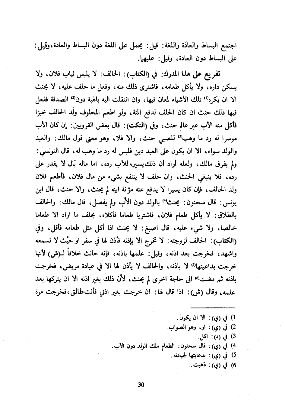 اجْتَمَعَ الْبِسَاطُ وَالْعَادَةُ وَاللُّغَةُ قِيلَ يُحْمَلُ عَلَى اللُّغَةِ دُونَ الْبِسَاطِ وَالْعَادَةِ وَقِيلَ عَلَى الْبِسَاطِ دُونَ الْعَادَةِ وَقِيلَ عَلَيْهِمَا تَفْرِيعٌ عَلَى هَذَا الْمَدْرَكِ فِي الْكِتَابِ الْحَالِفُ لَا يَلْبَسُ ثِيَابَ فُلَانٍ وَلَا يَسْكُنُ دَارَهُ وَلَا يَأْكُلُ طَعَامَهُ فَاشْتَرَى ذَلِكَ مِنْهُ وَفَعَلَ مَا حَلَفَ عَلَيْهِ لَا يَحْنَثُ إِلَّا أَنْ يَكْرَهَ تِلْكَ الْأَشْيَاءِ لِمَعَانٍ فِيهَا وَإِنِ انْتَقَلَتْ إِلَيْهِ بِالْهِبَةِ دُونَ الصَّدَقَةِ فَفَعَلَ فِيهَا ذَلِكَ حَنِثَ إِنْ كَانَ الْحلف لدفع الْمِنَّة وَلَو أطْعم الْمَحْلُوف وَلَدَ الْحَالِفِ خُبْزًا فَأَكَلَ مِنْهُ الْأَبُ غَيْرُ عَالِمٍ حَنِثَ وَفِي النُّكَتِ قَالَ بَعْضُ الْقَرَوِيِّينَ إِنْ كَانَ الْأَبُ مُوسِرًا لَهُ رَدُّ مَا وهب للصَّبِيّ حَنِثَ وَإِلَّا فَلَا وَهُوَ مَعْنَى قَوْلِ مَالِكٍ وَالْعَبْدُ وَالْوَلَدُ سَوَاءٌ إِلَّا أَنْ يَكُونَ عَلَى الْعَبْدِ دَيْنٌ فَلَيْسَ لَهُ رَدُّ مَا وُهبَ لَهُ قَالَ التُّونِسِيُّ وَلَمْ يُفَرِّقْ مَالِكٌ وَلَعَلَّهُ أَرَادَ أَنَّ ذَلِكَ يَسِيرٌ لِلْأَبِ رَدُّهُ أَمَّا مَاله بَال لَا يَقْدِرُ عَلَى رَدِّهِ فَلَا يَنْبَغِي الْحِنْثُ وَإِنْ حَلَفَ لَا يَنْتَفِعُ بِشَيْءٍ مِنْ مَالِ فُلَانٍ فَأَطْعَمَ فُلَانٌ وَلَدَ الْحَالِفِ فَإِنْ كَانَ يَسِيرًا لَا يَدْفَعُ عَنْهُ مُؤْنَةَ ابْنِهِ لَمْ يَحْنَثْ وَإِلَّا حَنِثَ قَالَ ابْنُ يُونُسَ قَالَ سَحْنُونٌ يَحْنَثُ بِالْوَلَدِ دُونَ الْأَبِ وَلَمْ يُفَصِّلْ قَالَ مَالِكٌ وَالْحَالِفُ بِالطَّلَاقِ لَا يَأْكُلُ طَعَامَ فُلَانٍ فَاشْتَرَيَا طَعَامًا فَأَكَلَاهُ يَحْلِفُ مَا أَرَادَ إِلَّا طَعَامًا خَالِصًا وَلَا شَيْءَ عَلَيْهِ قَالَ أَصْبَغُ لَا يَحْنَثُ إِذَا أَكَلَ مِثْلَ طَعَامِهِ فَأَقَلَّ وَفِي الْكِتَابِ الْحَالِفُ لِزَوْجَتِهِ لَا تَخْرُجُ إِلَّا بِإِذْنِهِ فَأَذِنَ لَهَا فِي سَفَرٍ أَوْ حَيْثُ لَا تَسْمَعُهُ وَأَشْهَدَ فَخَرَجَتْ بَعْدَ إِذْنِهِ وَقيل علمهَا بِإِذْنِهِ فَإِنَّهُ حانث خلافًا ل ش لِأَنَّهَا خرجت بداعيتها لَا بِإِذْنِهِ وَالْحَالِفُ لَا يَأْذَنُ لَهَا إِلَّا فِي عِيَادَةِ مَرِيضٍ فَخَرَجَتْ بِإِذْنِهِ ثُمَّ مَضَتْ إِلَى حَاجَةٍ أُخْرَى لَمْ يَحْنَثْ لِأَنَّ ذَلِكَ بِغَيْرِ إِذْنِهِ إِلَّا أَنْ يَتْرُكَهَا بَعْدَ عِلْمِهِ وَقَالَ ش إِذَا قَالَ لَهَا إِنْ خَرَجْتِ بِغَيْرِ إِذْنِي فَأَنْتِ طَالِقٌ فَخَرَجَتْ مَرَّةً