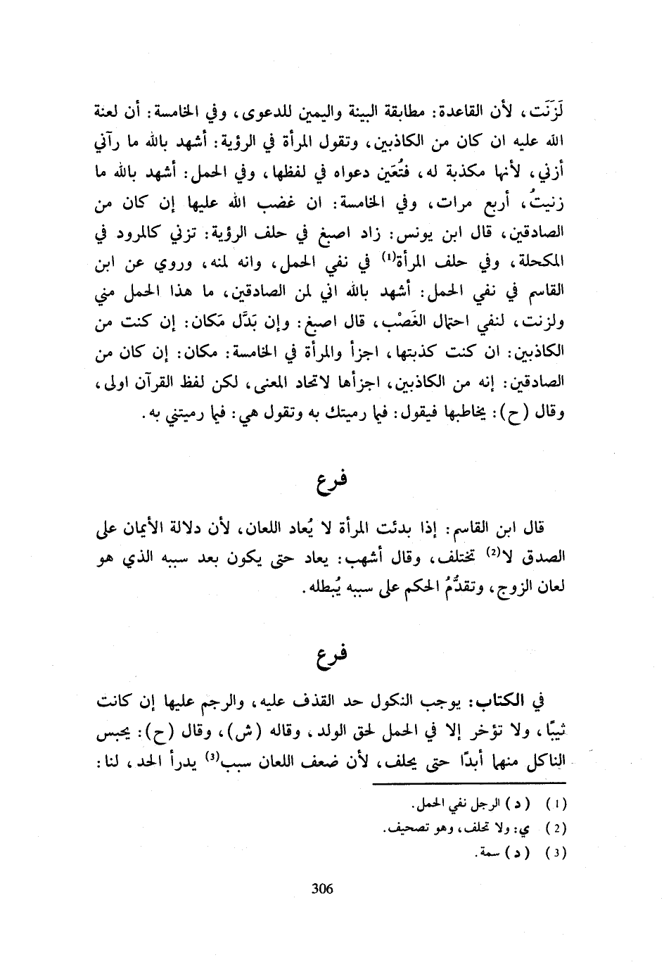 لَزَنَتْ لِأَنَّ الْقَاعِدَةَ مُطَابَقَةُ الْبَيِّنَةِ وَالْيَمِينِ لِلدَّعْوَى وَفِي الْخَامِسَةِ أَنَّ لَعْنَةَ اللَّهِ عَلَيْهِ إِنْ كَانَ مِنَ الْكَاذِبِينَ وَتَقُولُ الْمَرْأَةُ فِي الرُّؤْيَةِ أَشْهَدُ بِاللَّهِ مَا رَآنِي أَزْنِي لِأَنَّهَا مُكَذِّبَةٌ لَهُ فَتُعَيِّنُ دَعْوَاهُ فِي لَفْظِهَا وَفِي الْحَمْلِ أشهد بِاللَّه مَا زَنَيْت أَربع مَرَّات وَفِي الْخَامِسَةِ أَنَّ غَضَبَ اللَّهِ عَلَيْهَا إِنْ كَانَ مِنَ الصَّادِقِينَ قَالَ ابْنُ يُونُسَ زَادَ أَصْبَغُ فِي حَلِفِ الرُّؤْيَةِ تَزْنِي كَالْمِرْوَدِ فِي الْمُكْحُلَةِ وَفِي حَلِفِ الْمَرْأَةِ فِي نَفْيِ الْحَمْلِ وَإِنَّهُ لَمِنْهُ وَرُوِيَ عَنِ ابْنِ الْقَاسِمِ فِي نَفْيِ الْحَمْلِ أَشْهَدُ بِاللَّهِ إِنِّي لَمِنَ الصَّادِقِينَ مَا هَذَا الْحَمْلُ مِنِّي وَلَزَنَتْ لِنَفْيِ احْتِمَالِ الْغَصْبِ قَالَ أَصْبَغُ وَإِنْ بَدَّلَ مَكَانَ إِنْ كنت من الْكَاذِبين إِن كنت كذبتها اجزأ وَالْمَرْأَةُ فِي الْخَامِسَةِ مَكَانَ إِنْ كَانَ مِنَ الصَّادِقين إِنَّه من الْكَاذِبين اجزأها لِاتِّحَاد الْمَعْنَى لَكِنَّ لَفْظَ الْقُرْآنِ أَوْلَى وَقَالَ ح يُخَاطِبُهَا فَيَقُولُ فِيمَا رَمَيْتُكِ بِهِ وَتَقُولُ هِيَ فِيمَا رَمَيْتَنِي بِهِ