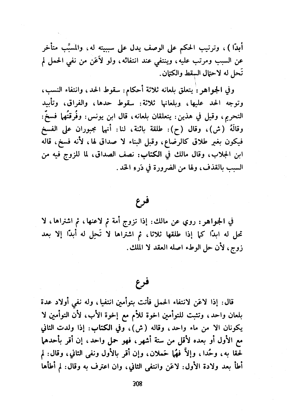أَبَدًا وَتَرْتِيبُ الْحُكْمِ عَلَى الْوَصْفِ يَدُلُّ عَلَى سَبَبِيَّتِهِ لَهُ وَالْمُسَبَّبُ مُتَأَخِّرٌ عَنِ السَّبَبِ وَمُرَتَّبٌ عَلَيْهِ وَيَنْتَفِي عِنْدَ انْتِفَائِهِ وَلَوْ لَاعَنَ مِنْ نَفْيِ الْحَمْلِ لَمْ تَحِلَّ لَهُ لِاحْتِمَالِ السَّقْطِ وَالْكِتْمَانِ وَفِي الْجَوَاهِرِ يَتَعَلَّقُ بِلِعَانِهِ ثَلَاثَةُ أَحْكَامٍ سُقُوطُ الْحَدِّ وَانْتِفَاءُ النَّسَبِ وَتَوَجُّهُ الْحَدِّ عَلَيْهَا وبلعانها ثَلَاثَة سُقُوطُ حَدِّهَا وَالْفِرَاقُ وَتَأْبِيدُ التَّحْرِيمِ وَقِيلَ فِي هَذَيْنِ يَتَعَلَّقَانِ بِلِعَانِهِ قَالَ ابْنُ يُونُسَ وَفُرْقَتُهُمَا فَسْخٌ وَقَالَهُ ش وَقَالَ ح طَلْقَةٌ بَائِنَةٌ لَنَا أَنَّهُمَا مَجْبُورَانِ عَلَى الْفَسْخِ فَيَكُونُ بِغَيْرِ طَلَاقٍ كَالرَّضَاعِ وَقَبْلَ الْبِنَاءِ لَا صَدَاقَ لَهَا لِأَنَّهُ فَسْخٌ قَالَهُ ابْنُ الْجَلَّابِ وَقَالَ مَالِكٌ فِي الْكِتَابِ نِصْفُ الصَّدَاقِ لِمَا لِلزَّوْجِ فِيهِ من السَّبَب بِالْقَذْفِ وَلَهَا مِنَ الضَّرُورَةِ فِي دَرْءِ الْحَدِّ