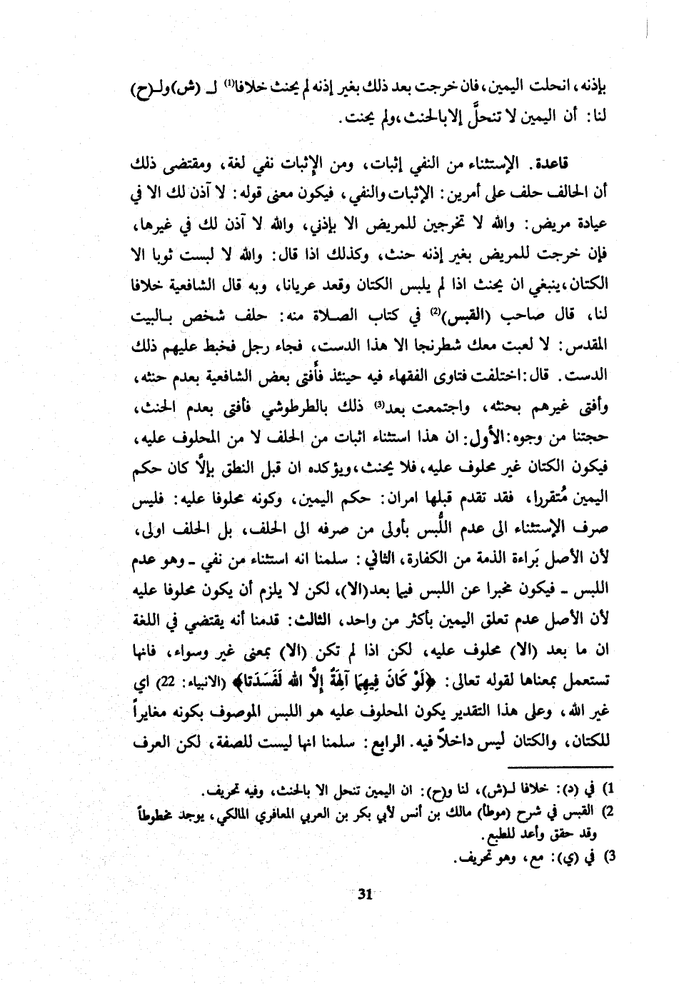 بِإِذْنِهِ انْحَلَّتِ الْيَمِينُ فَإِنْ خَرَجَتْ بَعْدَ ذَلِكَ بِغَيْر إِذْنه لم يَحْنَث خلافًا ل ش ول ح لنا أَن الْيَمين لَا تحل إِلَّا بِالْحِنْثِ وَلَمْ يَحْنَثْ قَاعِدَةٌ الِاسْتِثْنَاءُ مِنَ النَّفْيِ إِثْبَاتٌ وَمِنَ الْإِثْبَاتِ نَفْيٌ لُغَةً وَمُقْتَضَى ذَلِكَ أَنَّ الْحَالِفَ حَلَفَ عَلَى أَمْرَيْنِ الْإِثْبَاتِ وَالنَّفْيِ فَيَكُونُ مَعْنَى قَوْلِهِ لَا آذَنُ لَكِ إِلَّا فِي عِيَادَةِ مَرِيضٍ وَاللَّهِ لَا تَخْرُجِينَ لِلْمَرِيضِ إِلَّا بِإِذْنِي وَاللَّهِ لَا آذَنُ لَكِ فِي غَيرهَا فَإِن خرجت لمريض بِغَيْرِ إِذْنِهِ حَنِثَ وَكَذَلِكَ إِذَا قَالَ وَاللَّهِ لَا لَبِسْتُ ثَوْبًا إِلَّا الْكَتَّانَ يَنْبَغِي أَنْ يَحْنَثَ إِذَا لَمْ يَلْبَسِ الْكَتَّانَ وَقَعَدَ عُرْيَانًا وَبِهِ قَالَ الشَّافِعِيَّةُ خِلَافًا لَنَا قَالَ صَاحِبُ الْقَبَسِ فِي كِتَابِ الصَّلَاةِ مِنْهُ حَلَفَ شَخْصٌ بِالْبَيْتِ الْمُقَدَّسِ لَا لَعِبْتُ مَعَكَ شَطْرَنْجًا إِلَّا هَذَا الدَّسْتَ فَجَاءَ رَجُلٌ فَخَبَطَ عَلَيْهِمْ ذَلِكَ الدَّسْتَ قَالَ اخْتَلَفَتْ فَتَاوَى الْفُقَهَاءِ فِيهِ حِينَئِذٍ فَأَفْتَى بَعْضُ الشَّافِعِيَّةِ بِعَدَمِ حِنْثِهِ وَأَفْتَى غَيْرُهُمْ بِحِنْثِهِ وَاجْتَمَعْتُ بَعْدَ ذَلِكَ بِالطُّرْطُوشِيِّ فَأَفْتَى بِعَدَمِ الْحِنْثِ حُجَّتُنَا مِنْ وُجُوهٍ الْأَوَّلُ إِنَّ هَذَا اسْتِثْنَاءُ إِثْبَاتٍ مِنَ الْحَلِفِ لَا مِنَ الْمَحْلُوفِ عَلَيْهِ فَيَكُونُ الْكَتَّانُ غَيْرَ مَحْلُوفٍ عَلَيْهِ فَلَا يَحْنَثُ وَيُؤَكِّدُهُ أَنَّ قَبْلَ النُّطْقِ بإِلَّا كَانَ حُكْمُ الْيَمِينِ مُتَقَرِّرًا فَقَدْ تَقَدَّمَ قَبْلَهَا أَمْرَانِ حُكْمُ الْيَمِينِ وَكَوْنُهُ مَحْلُوفًا عَلَيْهِ فَلَيْسَ صَرْفُ الِاسْتِثْنَاءِ إِلَى عَدَمِ اللُّبْسِ بِأَوْلَى مِنْ صَرْفِهِ إِلَى الْحَلِفِ بَلِ الْحَلِفُ أَوْلَى لِأَنَّ الْأَصْلَ بَرَاءَةُ الذِّمَّةِ مِنَ الْكَفَّارَةِ الثَّانِي سَلَّمْنَا أَنَّهُ اسْتِثْنَاءٌ مِنْ نَفْيٍ وَهُوَ عَدَمُ اللُّبْسِ فَيَكُونُ مُخْبِرًا عَنِ اللُّبْسِ فِيمَا بَعْدَ إِلَّا لَكِنْ لَا يَلْزَمُ أَنْ يَكُونَ مَحْلُوفًا عَلَيْهِ لِأَنَّ الْأَصْلَ عَدَمُ تَعَلُّقِ الْيَمِينِ بِأَكْثَرَ مِنْ وَاحِدٍ الثَّالِثُ قَدَّمْنَا أَنَّهُ يَقْتَضِي فِي اللُّغَةِ أَنَّ مَا بعد إِلَّا محلوف عَلَيْهِ لكا إِذا لم لَكِن إِلَّا بِمَعْنى غير وَسَوَاء فَإِنَّهَا تُسْتَعْمَلُ بِمَعْنَاهَا لِقَوْلِهِ تَعَالَى {لَوْ كَانَ فِيهِمَا آلِهَةٌ إِلا اللَّهُ لَفَسَدَتَا} الْأَنْبِيَاء 22 أَيْ غَيْرُ اللَّهِ وَعَلَى هَذَا التَّقْدِيرِ يَكُونُ الْمَحْلُوفُ عَلَيْهِ هُوَ اللُّبْسُ الْمَوْصُوفُ بِكَوْنِهِ مُغَايِرًا لِلْكَتَّانِ وَالْكَتَّانُ لَيْسَ دَاخِلًا فِيهِ الرَّابِعُ سَلَّمْنَا أَنَّهَا لَيست لصفة لَكِن الْعرف
