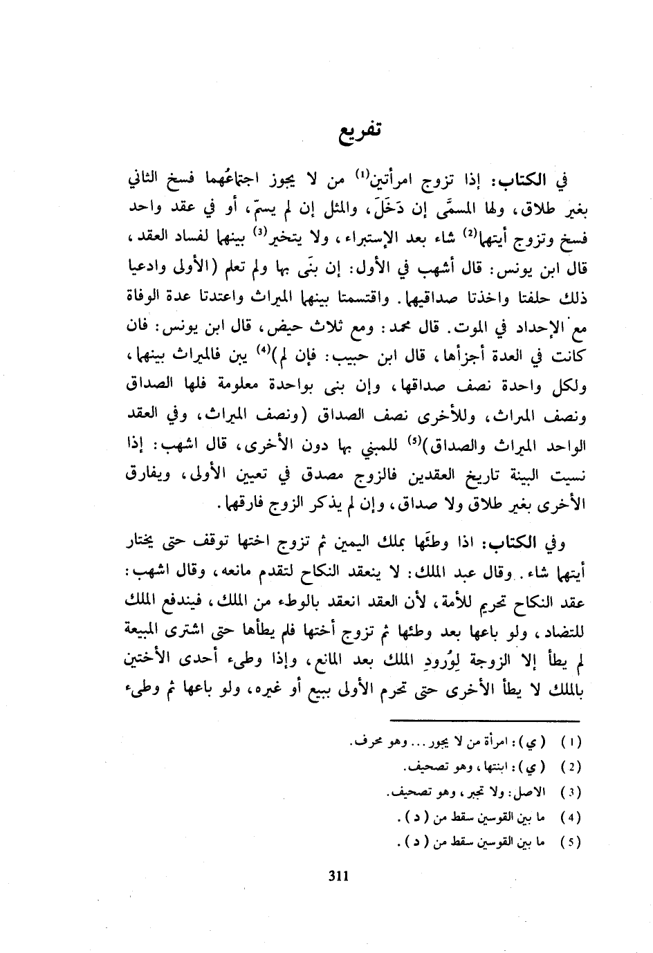 فِي الْكتاب إِذا تزوج امْرَأتَيْنِ من لَا يَجُوزُ اجْتِمَاعُهُمَا فُسِخَ الثَّانِي بِغَيْرِ طَلَاقٍ وَلَهَا الْمُسَمَّى إِنْ دَخَلَ وَالْمِثْلُ إِنْ لَمْ يُسَمِّ أَوْ فِي عَقْدٍ وَاحِدٍ فُسِخَ وَتَزَوَّجَ أَيَّتهمَا شَاءَ بَعْدَ الِاسْتِبْرَاءِ وَلَا يَتَخَيَّرُ بَيْنَهُمَا لِفَسَادِ الْعَقْدِ قَالَ ابْنُ يُونُسَ قَالَ أَشْهَبُ فِي الْأَوَّلِ إِنْ بَنَى بِهَا وَلَمْ تَعْلَمِ الْأُولَى وَادَّعَيَا ذَلِكَ حَلَفَتَا وَأَخَذَتَا صَدَاقَيْهِمَا وَاقْتَسَمَتَا بَيْنَهُمَا الْمِيرَاثَ وَاعْتَدَّتَا عِدَّةَ الْوَفَاةِ مَعَ الْإِحْدَادِ فِي الْمَوْتِ قَالَ مُحَمَّدٌ وَمَعَ ثَلَاثِ حِيَضٍ قَالَ ابْن يُونُس فَإِن كَانَت فِي الْعِدَّةِ أَجْزَأَهَا قَالَ ابْنُ حَبِيبٍ فَإِنْ لم يبن فَالْمِيرَاثُ بَيْنَهُمَا وَلِكُلِّ وَاحِدَةٍ نِصْفُ صَدَاقِهَا وَإِنْ بَنَى بِوَاحِدَةٍ مَعْلُومَةٍ فَلَهَا الصَّدَاقُ وَنِصْفُ الْمِيرَاثِ وَلِلْأُخْرَى نِصْفُ الصَّدَاقِ وَنِصْفُ الْمِيرَاثِ وَفِي الْعَقْدِ الْوَاحِدِ الْمِيرَاثُ وَالصَّدَاقُ لِلْمَبْنِيِّ بِهَا دُونَ الْأُخْرَى قَالَ أَشْهَبُ إِذَا نَسِيَتِ الْبَيِّنَةُ تَارِيخَ الْعَقْدَيْنِ فَالزَّوْجُ مُصَدَّقٌ فِي تَعْيِينِ الْأُولَى وَيُفَارِقُ الْأُخْرَى بِغَيْرِ طَلَاقٍ وَلَا صَدَاقٍ وَإِنْ لَمْ يَذْكُرِ الزَّوْجُ فَارَقَهُمَا وَفِي الْكِتَابِ إِذَا وَطِئَهَا بِمِلْكِ الْيَمِينِ ثُمَّ تَزَوَّجَ أُخْتَهَا تَوَقَّفَ حَتَّى يَخْتَارَ أَيَّتُهُمَا شَاءَ وَقَالَ عَبْدُ الْمَلِكِ لَا يَنْعَقِدُ النِّكَاحُ لِتَقَدُّمِ مَانِعِهِ وَقَالَ أَشْهَبُ عَقْدُ النِّكَاحِ تَحْرِيمٌ لِلْأَمَةِ لِأَنَّ الْعَقْدَ انْعَقَدَ بِالْوَطْءِ مِنَ الْمِلْكِ فَيَنْدَفِعُ الْمِلْكُ لِلتَّضَادِّ وَلَوْ بَاعَهَا بَعْدَ وَطْئِهَا ثُمَّ تَزَوَّجَ أُخْتَهَا فَلَمْ يَطَأْهَا حَتَّى اشْتَرَى الْمَبِيعَةَ لَمْ يَطَأْ إِلَّا الزَّوْجَةَ لِوُرُودِ الْمِلْكِ بَعْدَ الْمَانِعِ وَإِذَا وَطِئَ إِحْدَى الْأُخْتَيْنِ بِالْمِلْكِ لَا يَطَأُ الْأُخْرَى حَتَّى تَحْرُمَ الْأُولَى بِبَيْعٍ أَوْ غَيْرِهِ وَلَوْ بَاعَهَا ثُمَّ وَطِئَ