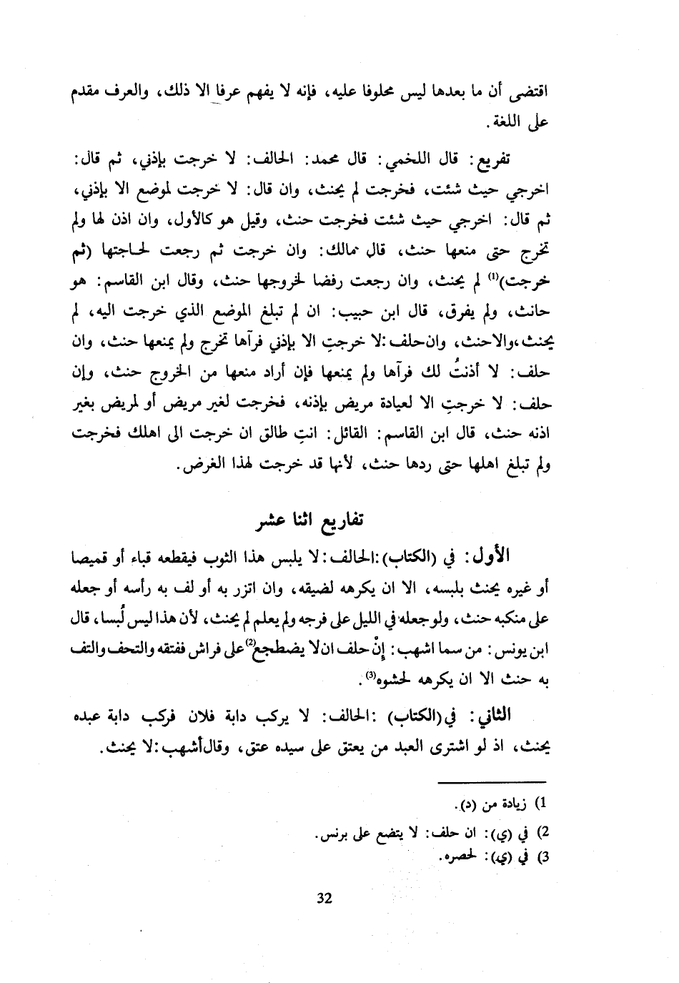 اقْتَضَى أَنَّ مَا بَعْدَهَا لَيْسَ مَحْلُوفًا عَلَيْهِ فَإِنَّهُ لَا يُفْهَمُ عُرْفًا إِلَّا ذَلِكَ وَالْعُرْفُ مُقَدَّمٌ عَلَى اللُّغَةِ تَفْرِيعٌ قَالَ اللَّخْمِيُّ قَالَ مُحَمَّدٌ الْحَالِفُ لَا خَرَجْتِ بِإِذْنِي ثُمَّ قَالَ اخْرُجِي حَيْثُ شِئْتِ فَخَرَجَتْ لَمْ يَحْنَثْ وَإِنْ قَالَ لَا خَرَجْتِ لِمَوْضِعٍ إِلَّا بِإِذْنِي ثُمَّ قَالَ اخْرُجِي حَيْثُ شِئْتِ فَخَرَجَتْ حَنِثَ وَقِيلَ هُوَ كَالْأَوَّلِ وَإِنْ أَذِنَ لَهَا وَلَمْ تَخْرُجْ حَتَّى مَنَعَهَا حَنِثَ قَالَ مَالِكٌ وَإِنْ خَرَجَتْ ثُمَّ رَجَعَتْ لِحَاجَتِهَا ثُمَّ خَرَجَتْ لَمْ يَحْنَثْ وَإِنْ رَجَعَتْ رَفْضًا لِخُرُوجِهَا حَنِثَ وَقَالَ ابْنُ الْقَاسِمِ هُوَ حَانِثٌ وَلَمْ يُفَرِّقْ قَالَ ابْنُ حَبِيبٍ إِنْ لَمْ تَبْلُغِ الْمَوْضِعَ الَّذِي خَرَجَتْ إِلَيْهِ لم يَحْنَث والأحنث وَإِنْ حَلَفَ لَا خَرَجْتِ إِلَّا بِإِذْنِي فَرَآهَا تَخْرُجُ وَلَمْ يَمْنَعْهَا حَنِثَ وَإِنْ حَلَفَ لَا أَذِنت لَك فرآها وَلم يمْنَعهَا فَإِن أَرَادَ منعهَا مِنَ الْخُرُوجِ حَنِثَ وَإِنْ حَلَفَ لَا خَرَجَتْ إِلَّا لِعِيَادَةِ مَرِيضٍ بِإِذْنِهِ فَخَرَجَتْ لِغَيْرِ مَرِيضٍ أَوْ لِمَرِيضٍ بِغَيْرِ إِذْنِهِ حَنِثَ قَالَ ابْنُ الْقَاسِمِ الْقَائِلُ أَنْتِ طَالِقٌ إِنْ خَرَجْتِ إِلَى أَهْلِكِ فَخَرَجَتْ وَلَمْ تَبْلُغْ أَهْلَهَا حَتَّى رَدَّهَا حَنِثَ لِأَنَّهَا قَدْ خَرَجَتْ لِهَذَا الْغَرَضِ