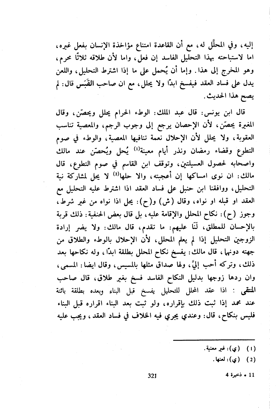 إِلَيْهِ وَفِي الْمُحَلَّلِ لَهُ مَعَ أَنَّ الْقَاعِدَةَ امْتِنَاعُ مُؤَاخَذَةِ الْإِنْسَانِ بِفِعْلِ غَيْرِهِ إِمَّا لِاسْتِبَاحَتِهِ بِهَذَا التَّحْلِيلِ الْفَاسِدِ إِنْ فَعَلَ وَإِمَّا لِأَنَّ طَلَاقه ثَلَاثًا محرم وَهُوَ الْمخْرج إِلَى هَذَا وَإِمَّا أَنْ يُحْمَلَ عَلَى مَا إِذَا اشْتَرَطَ التَّحْلِيلَ وَاللَّعْنُ يَدُلُّ عَلَى فَسَادِ الْعَقْدِ فَيُفْسَخُ أَبَدًا وَلَا يُحَلَّلُ مَعَ أَنَّ صَاحِبَ الْقَبَسِ قَالَ لَمْ يَصِحَّ هَذَا الْحَدِيثُ قَالَ ابْنُ يُونُسَ قَالَ عَبْدُ الْمَلِكِ الْوَطْءُ الْحَرَامُ يُحَلِّلُ وَيُحَصِّنُ وَقَالَ الْمُغِيرَةُ يُحَصِّنُ لِأَنَّ الْإِحْصَانَ يَرْجِعُ إِلَى وُجُوبِ الرَّجْمِ وَالْمَعْصِيَةُ تُنَاسِبُ الْعقُوبَة وَلَا يحلل لِأَنَّ الْإِحْلَالَ نِعْمَةٌ تُنَافِيهَا الْمَعْصِيَةُ وَالْوَطْءُ فِي صَوْمِ التَّطَوُّعِ وَقَضَاءِ رَمَضَانَ وَنَذْرِ أَيَّامٍ مُعَيَّنَةٍ يُحِلُّ وَيُحَصِّنُ عِنْدَ مَالِكٍ وَأَصْحَابِهِ لِحُصُولِ الْعُسَيْلَتَيْنِ وَتَوَقَّفَ ابْنُ الْقَاسِمِ فِي صَوْمِ التَّطَوُّعِ قَالَ مَالِكٌ إِنْ نَوَى إِمْسَاكَهَا إِنْ أَعْجَبَتْهُ وَإِلَّا حلهَا لَا يحل لِمُشَارَكَةِ نِيَّةِ التَّحْلِيلِ وَوَافَقْنَا ابْنَ حَنْبَلٍ عَلَى فَسَادِ الْعَقْدِ إِذَا اشْتَرَطَ عَلَيْهِ التَّحْلِيلَ مَعَ الْعَقْدِ أَوْ قَبْلَهُ أَوْ نَوَاهُ وَقَالَ ش وح يَحِلُّ إِذَا نَوَاهُ مِنْ غَيْرِ شَرْطٍ وَجَوَّزَ ح نِكَاحَ الْمُحَلِّلِ وَالْإِقَامَةَ عَلَيْهِ بَلْ قَالَ بَعْضُ الْحَنَفِيَّةِ ذَلِكَ قُرْبَةٌ بِالْإِحْسَانِ لِلْمُطَلِّقِ لَنَا عَلَيْهِمْ مَا تَقَدَّمَ قَالَ مَالِكٌ وَلَا يَضُرُّ إِرَادَةُ الزَّوْجَيْنِ التَّحْلِيلَ إِذَا لَمْ يَعْلَمِ الْمُحَلِّلُ لِأَنَّ الْإِحْلَالَ بِالْوَطْءِ وَالطَّلَاقِ مِنْ جِهَتِهِ دُونَهُمَا قَالَ مَالِكٌ يُفْسَخُ نِكَاحُ الْمُحَلِّلِ بِطَلْقَةٍ أَبَدًا وَلَهُ نِكَاحُهَا بَعْدَ ذَلِكَ وَتَرْكُهُ أَحَبُّ إِلَيَّ وَلَهَا صَدَاقُ مِثْلِهَا بِالْمَسِيسِ وَقَالَ أَيْضًا الْمُسَمَّى وَإِن ردهَا زَوجهَا بِدَلِيل النِّكَاح الْفَاسِد فسخ بِغَيْرِ طَلَاقٍ قَالَ صَاحِبُ الْمُنْتَقَى إِذَا عَقَدَ الْمُحَلِّلُ لِلتَّحْلِيلِ يُفْسَخُ قَبْلَ الْبِنَاءِ وَبَعْدَهُ بِطَلْقَةٍ بَائِنَةٍ عِنْدَ مُحَمَّدٍ إِذَا ثَبَتَ ذَلِكَ بِإِقْرَارِهِ وَلَوْ ثَبَتَ بَعْدَ الْبِنَاءِ إِقْرَارُهُ قَبْلَ الْبِنَاءِ فَلَيْسَ بِنِكَاحٍ قَالَ وَعِنْدِي يَجْرِي فِيهِ الْخِلَافُ فِي فَسَادِ الْعَقْدِ وَيَجِبُ عَلَيْهِ