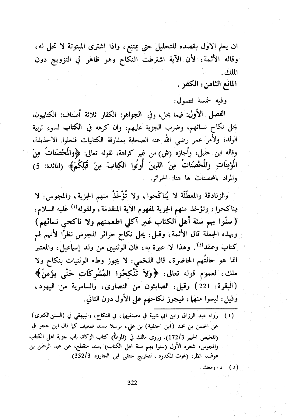 الْفَصْلُ الْأَوَّلُ فِيمَا يَحِلُّ وَفِي الْجَوَاهِر الْكفَّار ثَلَاثَةُ أَصْنَافٍ الْكِتَابِيُّونَ يَحِلُّ نِكَاحُ نِسَائِهِمْ وَضَرْبُ الْجِزْيَةِ عَلَيْهِمْ وَإِنْ كَرِهَهُ فِي الْكِتَابِ لِسُوءِ تَرْبِيَةِ الْوَلَدِ وَلِأَمْرِ عُمَرَ رَضِيَ اللَّهُ عَنْهُ الصَّحَابَةَ بِمُفَارَقَةِ الْكِتَابِيَّاتِ فَفَعَلُوا إِلَّا حُذَيْفَةَ وَقَالَهُ ابْنُ حَنْبَلٍ وَأَجَازَهُ ش مِنْ غَيْرِ كَرَاهَةٍ لِقَوْلِهِ تَعَالَى {وَالْمُحْصَنَاتُ مِنَ الْمُؤْمِنَاتِ وَالْمُحْصَنَاتُ مِنَ الَّذِينَ أُوتُوا الْكِتَابَ مِنْ قَبْلِكُمْ} الْمَائِدَة 5 وَالْمُرَادُ بالمحصنات هَا هُنَا الْحَرَائِر والزنادقة والمعطلة لَا يناكحوا وَلَا تُؤْخَذ مِنْهُم الْجِزْيَة وَالْمَجُوس لَا يناكحوا وَتُؤْخَذُ مِنْهُمُ الْجِزْيَةُ لِمَفْهُومِ الْآيَةِ الْمُتَقَدِّمَةِ وَلِقَوْلِهِ عَلَيْهِ السَّلَامُ سُنُّوا بِهِمْ سُنَّةَ أَهْلِ الْكِتَابِ غَيْرَ آكِلِي أَطْعِمَتِهِمْ وَلَا نَاكِحِي نِسَائِهِمْ وَبِهَذِهِ الْجُمْلَةِ قَالَ الْأَئِمَّةُ وَقِيلَ يَحِلُّ نِكَاحُ حَرَائِرِ الْمَجُوس نظرا لأَنهم لَهُم كتاب وَعقد وَهَذَا لَا عِبْرَةَ بِهِ فَإِنَّ الْوَثَنِيِّينَ مِنْ وَلَدِ إِسْمَاعِيلَ وَالْمُعْتَبَرُ إِنَّمَا هُوَ حَالَتُهُمُ الْحَاضِرَةُ قَالَ اللَّخْمِيُّ لَا يَجُوزُ وَطْءُ الْوَثَنِيَّاتِ بِنِكَاحٍ وَلَا مِلْكٍ لِعُمُومِ قَوْله تَعَالَى {وَلا تَنْكِحُوا الْمُشْرِكَاتِ حَتَّى يُؤْمِنَّ} الْبَقَرَة 221 وَقِيلَ الصَّابِئُونَ مِنَ النَّصَارَى والسامرية من الْيَهُود وَقيل لَيْسُوا مِنْهُمَا فَيَجُوزَ نِكَاحُهُمْ عَلَى الْأَوَّلِ دُونَ الثَّانِي