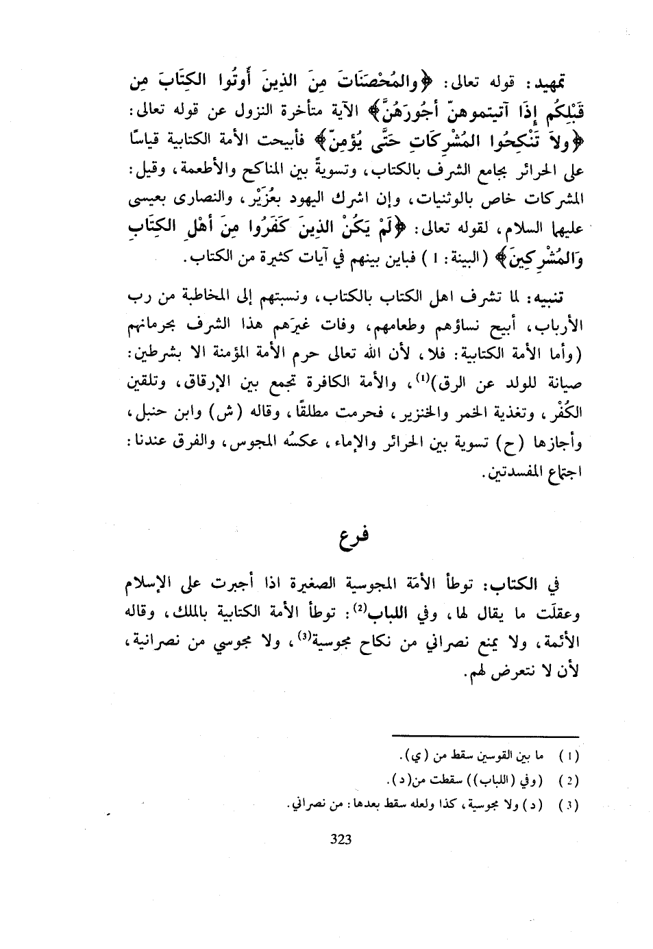 تَمْهِيدٌ قَوْله تَعَالَى {وَالْمُحْصَنَاتُ مِنَ الَّذِينَ أُوتُوا الْكتاب من قبلكُمْ إِذا آتَيْتُمُوهُنَّ أُجُورهنَّ} الْآيَةُ مُتَأَخِّرَةُ النُّزُولِ عَنْ قَوْله تَعَالَى {وَلا تنْكِحُوا المشركات حَتَّى يُؤمن} فأبيحت الْأَمَةُ الْكِتَابِيَّةُ قِيَاسًا عَلَى الْحَرَائِرِ بِجَامِعِ الشَّرَفِ بِالْكتاب وتسوية بَيْنَ الْمَنَاكِحِ وَالْأَطْعِمَةِ وَقِيلَ الْمُشْرِكَاتُ خَاصٌّ بِالْوَثَنِيَّاتِ وَإِنْ أَشْرَكَ الْيَهُودُ بِعُزَيْرٍ وَالنَّصَارَى بِعِيسَى عَلَيْهِمَا السَّلَامُ لِقَوْلِهِ تَعَالَى {لَمْ يَكُنِ الَّذِينَ كَفَرُوا مِنْ أَهْلِ الْكِتَابِ وَالْمُشْرِكِينَ} الْبَيِّنَة 1 فَبَايَنَ بَيْنَهُمْ فِي آيَاتٍ كَثِيرَةٍ مِنَ الْكِتَابِ تَنْبِيهٌ لَمَّا تَشَرَّفَ أَهْلُ الْكِتَابِ بِالْكِتَابِ وَنِسْبَتِهِمْ إِلَى الْمُخَاطَبَةِ مِنْ رَبِّ الْأَرْبَابِ أُبِيحَ نِسَاؤُهُمْ وَطَعَامُهُمْ وَفَاتَ غَيرهم هَذَا الشّرف بحرمانهم وَأَمَّا الْأَمَةُ الْكِتَابِيَّةُ فَلَا لِأَنَّ اللَّهَ تَعَالَى حَرَّمَ الْأَمَةَ الْمُؤْمِنَةَ إِلَّا بِشَرْطَيْنِ صِيَانَةٌ لِلْوَلَدِ عَنِ الرِّقِّ وَالْأَمَةُ الْكَافِرَةُ تَجْمَعُ بَيْنَ الْإِرْقَاقِ وَتَلْقِينِ الْكُفْرِ وَتَغْذِيَةِ الْخَمْرِ وَالْخِنْزِيرِ فَحُرِّمَتْ مُطْلَقًا وَقَالَهُ ش وَابْنُ حَنْبَلٍ وَأَجَازَهَا ح تَسْوِيَةً بَيْنَ الْحَرَائِرِ وَالْإِمَاءِ عَكْسُهُ الْمَجُوسُ وَالْفَرْقُ عِنْدَنَا اجْتِمَاعُ الْمَفْسَدَتَيْنِ