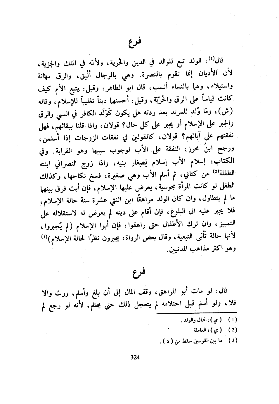 قَالَ الْوَلَدُ تَبَعٌ لِلْوَالِدِ فِي الدِّينِ وَالْحُرِّيَّةِ وَلِأُمِّهِ فِي الْمِلْكِ وَالْجِزْيَةِ لِأَنَّ الْأَدْيَانَ إِنَّمَا تقوم بالنصرة وَهِي بِالرِّجَالِ أليق وَالرّق مَهَانَةٌ وَاسْتِيلَاءٌ وَهُمَا بِالنِّسَاءِ أَنْسَبُ قَالَ أَبُو الطَّاهِرِ وَقِيلَ يَتْبَعُ الْأُمَّ كَيْفَ كَانَتْ قِيَاسًا عَلَى الرِّقِّ وَالْحُرِّيَّةِ وَقِيلَ أَحْسَنَهُمَا دِينًا تَغْلِيبًا للأسلام وَقَالَهُ ش وَمَا ولد لِلْمُرْتَدِّ بَعْدَ رِدَّتِهِ هَلْ يَكُونُ كَوَلَدِ الْكَافِرِ فِي السَّبْيِ وَالرِّقِّ وَالْجَبْرِ عَلَى الْإِسْلَامِ أَوْ يُجْبَرُ عَلَى كُلِّ حَالٍ قَوْلَانِ وَإِذَا قُلْنَا بِبَقَائِهِمْ فَهَلْ نَفَقَتُهُمْ عَلَى آبَائِهِمْ قَوْلَانِ كَالْقَوْلَيْنِ فِي نَفَقَاتِ الزَّوْجَاتِ إِذَا أَسْلَمْنَ وَرَجَّحَ ابْنُ مُحْرِزٍ النَّفَقَةَ عَلَى الْأَبِ لِوُجُوبِ سَبَبِهَا وَهُوَ الْقَرَابَةُ وَفِي الْكِتَابِ إِسْلَامُ الْأَبِ إِسْلَامٌ لِصِغَارِ بَنِيهِ وَإِذَا زَوَّجَ النَّصْرَانِيُّ ابْنَتَهُ الطِّفْلَةَ مِنْ كِتَابِيٍّ ثُمَّ أَسْلَمَ الْأَبُ وَهِيَ صَغِيرَةٌ فُسِخَ نِكَاحُهَا وَكَذَلِكَ الطِّفْلُ لَوْ كَانَتِ الْمَرْأَةُ مَجُوسِيَّةً يُعْرَضُ عَلَيْهَا الْإِسْلَامُ فَإِنْ أَبَتْ فُرِّقَ بَيْنَهُمَا مَا لَمْ يَتَطَاوَلْ وَإِنْ كَانَ الْوَلَدُ مُرَاهِقًا ابْنَ اثْنَتَيْ عَشْرَةَ سَنَةً حَالَةَ الْإِسْلَامِ فَلَا يُجْبَرْ عَلَيْهِ إِلَى الْبُلُوغِ فَإِنْ أَقَامَ عَلَى دِينِهِ لَمْ يُعْرَضْ لَهُ لِاسْتِقْلَالِهِ عَلَى التَّمْيِيزِ وَإِنْ تُرِكَ الْأَطْفَالُ حَتَّى رَاهَقُوا فَإِنْ أَبَوُا الْإِسْلَامَ لَمْ يُجْبَرُوا لِأَنَّهَا حَالَةٌ تَأْبَى التَّبَعِيَّةَ وَقَالَ بَعْضُ الرُّوَاةِ يُجْبَرُونَ نَظَرًا لِحَالَةِ الْإِسْلَامِ وَهُوَ أَكْثَرُ مَذَاهِبِ الْمَدَنِيِّينَ