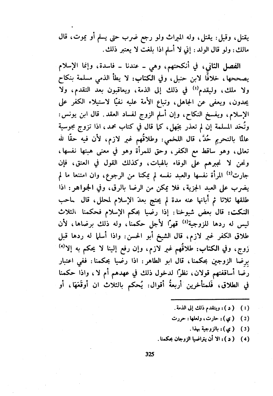 يقتل وَقيل يُقْتَلْ وَلَهُ الْمِيرَاثُ وَلَوْ رَجَعَ ضُرِبَ حَتَّى يُسْلِمَ أَوْ يَمُوتَ قَالَ مَالِكٌ وَلَوْ قَالَ الْوَلَدُ إِنِّي لَا أُسْلِمُ إِذَا بَلَغْتُ لَا يعْتَبر ذَلِك الْفَصْلُ الثَّانِيُ فِي أَنْكِحَتِهِمْ وَهِيَ عِنْدَنَا فَاسِدَةٌ وَإِنَّمَا الْإِسْلَامُ يُصَحِّحُهَا خِلَافًا لِابْنِ حَنْبَلٍ وَفِي الْكِتَابِ لَا يَطَأُ الذِّمِّيُّ مُسْلِمَةً بِنِكَاحٍ وَلَا ملك وليقدم فِي ذَلِكَ إِلَى الذِّمَّةِ وَيُعَاقَبُونَ بَعْدَ التَّقَدُّمِ وَلَا يُحَدُّونَ وَيُعْفَى عَنِ الْجَاهِلِ وَتُبَاعُ الْأَمَةُ عَلَيْهِ نَفْيًا لِاسْتِيلَاءِ الْكُفْرِ عَلَى الْإِسْلَامِ وَيُفْسَخُ النِّكَاحُ وَإِنْ أَسْلَمَ الزَّوْجُ لِفَسَادِ الْعَقْدِ قَالَ ابْنُ يُونُسَ وَتُحَدُّ الْمُسْلِمَةُ إِنْ لَمْ تُعْذَرْ بِجَهْلٍ كَمَا قَالَ فِي كِتَابِ مُحَمَّدٍ إِذَا تَزَوَّجَ مَجُوسِيَّةً عَالِمًا بِالتَّحْرِيمِ حُدَّ قَالَ اللَّخْمِيُّ وَطَلَاقُهُمْ غَيْرُ لَازِمٍ لِأَنَّ فِيهِ حَقًّا لِلَّهِ تَعَالَى وَهُوَ سَاقِط مَعَ الْكفْر وَحقّ للْمَرْأَة وَهُوَ فِي مَعْنَى هِبَتِهَا نَفْسَهَا وَنَحْنُ لَا نُجْبِرُهُمْ عَلَى الْوَفَاءِ بِالْهِبَاتِ وَكَذَلِكَ الْقَوْلُ فِي الْعِتْقِ فَإِنْ جَارَتِ الْمَرْأَةُ نَفْسَهَا وَالْعَبْدُ نَفْسَهُ لم يمكنا من الرُّجُوع وَإِن امْتَنَعَا مَا لَمْ يُضْرَبْ عَلَى الْعَبْدِ الْجِزْيَةُ فَلَا يُمَكَّنْ مِنَ الرِّضَا بِالرِّقِّ وَفِي الْجَوَاهِرِ إِذَا طَلَّقَهَا ثَلَاثًا ثُمَّ أَبَانَهَا عَنْهُ مُدَّةً لَمْ يَحْتَجْ بَعْدَ الْإِسْلَامِ لِمُحَلِّلٍ قَالَ صَاحِبُ النُّكَتِ قَالَ بَعْضُ شُيُوخِنَا إِذَا رَضِيا بِحكم الْإِسْلَام فحكمنا الثَّلَاث لَيْسَ لَهُ رَدُّهَا لِلزَّوْجِيَّةِ قَهْرًا لِأَجْلِ حُكْمِنَا وَلَهُ ذَلِكَ بِرِضَاهَا لِأَنَّ طَلَاقَ الْكُفْرِ غَيْرُ لَازِمٍ قَالَ الشَّيْخُ أَبُو الْحَسَنِ وَإِذَا أَسْلَمَا لَهُ رَدَّهَا قَبْلَ زَوْجٍ وَفِي الْكِتَابِ طَلَاقُهُمْ غير لَازم وَإِن رفع إِلَيْنَا لَا يحكم بِهِ إِلَّا بِرِضا الزَّوْجَيْنِ بِحُكْمِنَا قَالَ أَبُو الطَّاهِرِ إِذَا رَضِيَا بِحُكْمِنَا فَفِي اعْتِبَار رضَا أَسَاقِفَتِهِمْ قَوْلَانِ نَظَرًا لِدُخُولِ ذَلِكَ فِي عَهْدِهِمْ أم لَا وَإِذا حكمنَا فِي الطَّلَاق فلمتأخرين أَرْبَعَةُ أَقْوَالٍ يُحْكَمُ بِالثَّلَاثِ إِنْ أَوْقَعَهَا أَوْ