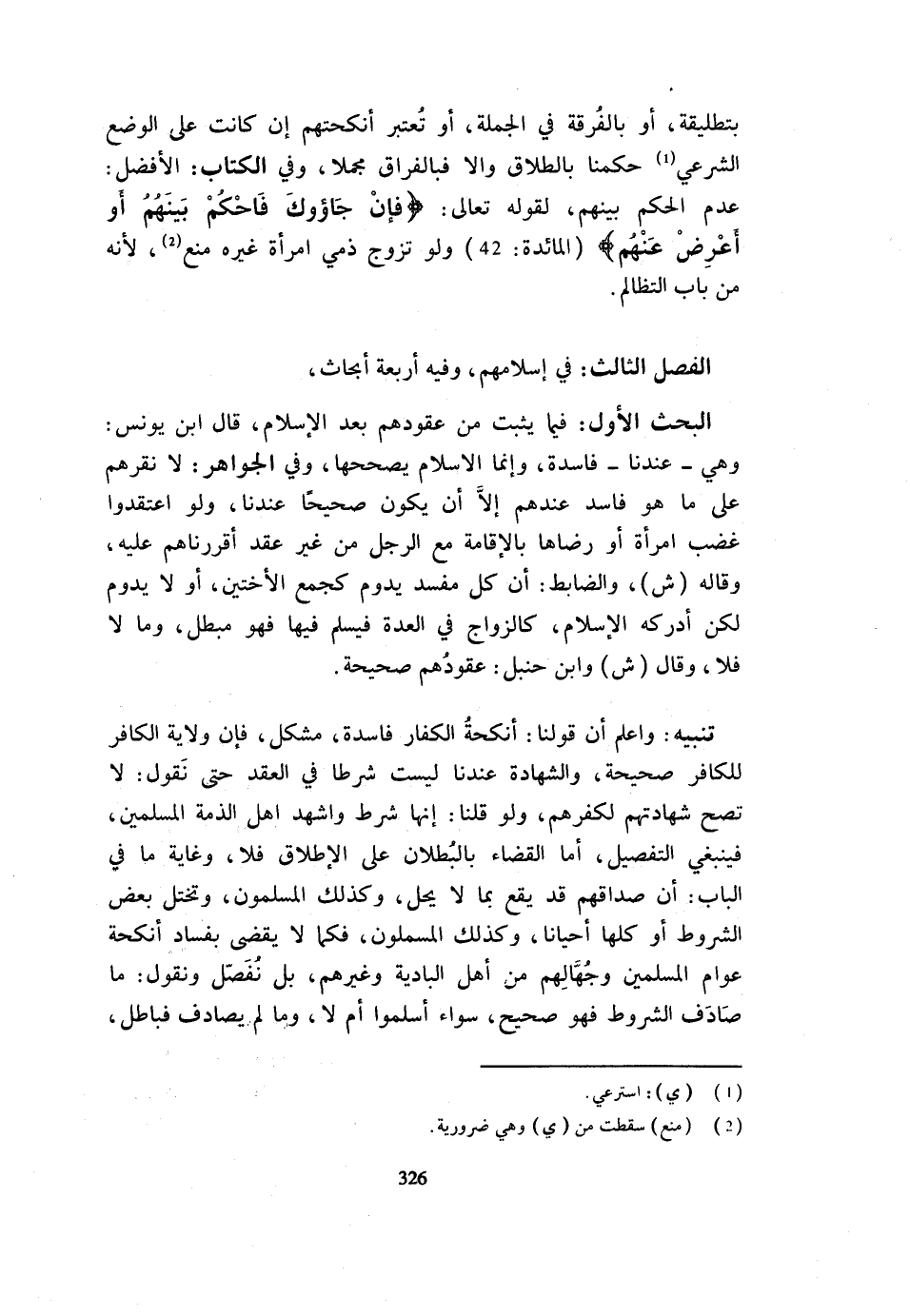 بِتَطْلِيقَةٍ أَوْ بِالْفُرْقَةِ فِي الْجُمْلَةِ أَوْ تُعْتَبَرُ أَنْكِحَتُهُمْ إِنْ كَانَتْ عَلَى الْوَضْعِ الشَّرْعِيِّ حَكَمْنَا بِالطَّلَاق وَإِلَّا فبالفراق مُجْمَلًا وَفِي الْكِتَابِ الْأَفْضَلُ عَدَمُ الْحُكْمِ بَيْنَهُمْ لقَوْله تَعَالَى {فَإِن جاؤوك فَاحْكُمْ بَيْنَهُمْ أَوْ أَعْرِضْ عَنْهُمْ} الْمَائِدَة 42 وَلَوْ تَزَوَّجَ ذِمِّيٌّ امْرَأَةَ غَيْرِهِ مُنِعَ لِأَنَّهُ مِنْ بَاب التظالم الْفَصْلُ الثَّالِثُ فِي إِسْلَامِهِمْ وَفِيهِ أَرْبَعَةُ أَبْحَاثٍ الْبَحْثُ الْأَوَّلُ فِيمَا يَثْبُتُ مِنْ عُقُودِهِمْ بَعْدَ الْإِسْلَامِ قَالَ ابْنُ يُونُسَ وَهِيَ عِنْدَنَا فَاسِدَةٌ وَإِنَّمَا الْإِسْلَامُ يُصَحِّحُهَا وَفِي الْجَوَاهِرِ لَا نُقِرُّهُمْ عَلَى مَا هُوَ فَاسِدٌ عِنْدَهُمْ إِلَّا أَنْ يكون صَحِيحا عندنَا وَلَو اعتقدوا غضب امْرَأَة أَوْ رِضَاهَا بِالْإِقَامَةِ مَعَ الرَّجُلِ مِنْ غَيْرِ عَقْدٍ أَقْرَرْنَاهُمْ عَلَيْهِ وَقَالَهُ ش وَالضَّابِطُ أَنَّ كُلَّ مُفْسِدٍ يَدُومُ كَجَمْعِ الْأُخْتَيْنِ أَوْ لَا يَدُومُ لَكِنْ أَدْرَكَهُ الْإِسْلَامُ كَالزَّوَاجِ فِي الْعِدَّةِ فَيسلم فِيهَا فَهُوَ مُبْطل وَمَا لَا فَلَا وَقَالَ ش وَابْنُ حَنْبَلٍ عُقُودُهُمْ صَحِيحَةٌ تَنْبِيهٌ وَاعْلَمْ أَنَّ قَوْلَنَا أَنْكِحَةُ الْكُفَّارِ فَاسِدَةٌ مُشْكِلٌ فَإِنَّ وِلَايَةَ الْكَافِرِ لِلْكَافِرِ صَحِيحَةٌ وَالشَّهَادَةُ عِنْدَنَا لَيْسَتْ شَرْطًا فِي الْعَقْدِ حَتَّى نَقُولَ لَا تَصِحُّ شَهَادَتُهُمْ لِكُفْرِهِمْ وَلَوْ قُلْنَا إِنَّهَا شَرْطٌ وَأَشْهَدَ أَهْلُ الذِّمَّةِ الْمُسْلِمِينَ فَيَنْبَغِي التَّفْصِيلُ أَمَّا الْقَضَاءُ بِالْبُطْلَانِ عَلَى الْإِطْلَاقِ فَلَا وَغَايَةُ مَا فِي الْبَابِ أَنَّ صَدَاقَهُمْ قَدْ يَقَعُ بِمَا لَا يَحِلُّ وَكَذَلِكَ الْمُسْلِمُونَ وَتَخْتَلُّ بَعْضُ الشُّرُوطِ أَوْ كُلُّهَا أَحْيَانًا وَكَذَلِكَ الْمُسْلِمُونَ فَكَمَا لَا يُقْضَى بِفَسَادِ أَنْكِحَةِ عَوَامِّ الْمُسْلِمِينَ وَجُهَّالِهِمْ مِنْ أَهْلِ الْبَادِيَةِ وَغَيْرِهِمْ بَلْ نُفَصِّلُ وَنَقُولُ مَا صَادَفَ الشُّرُوطَ فَهُوَ صَحِيحٌ سَوَاءٌ أَسْلَمُوا أَمْ لَا وَمَا لَمْ يُصَادِفْ فَبَاطِل