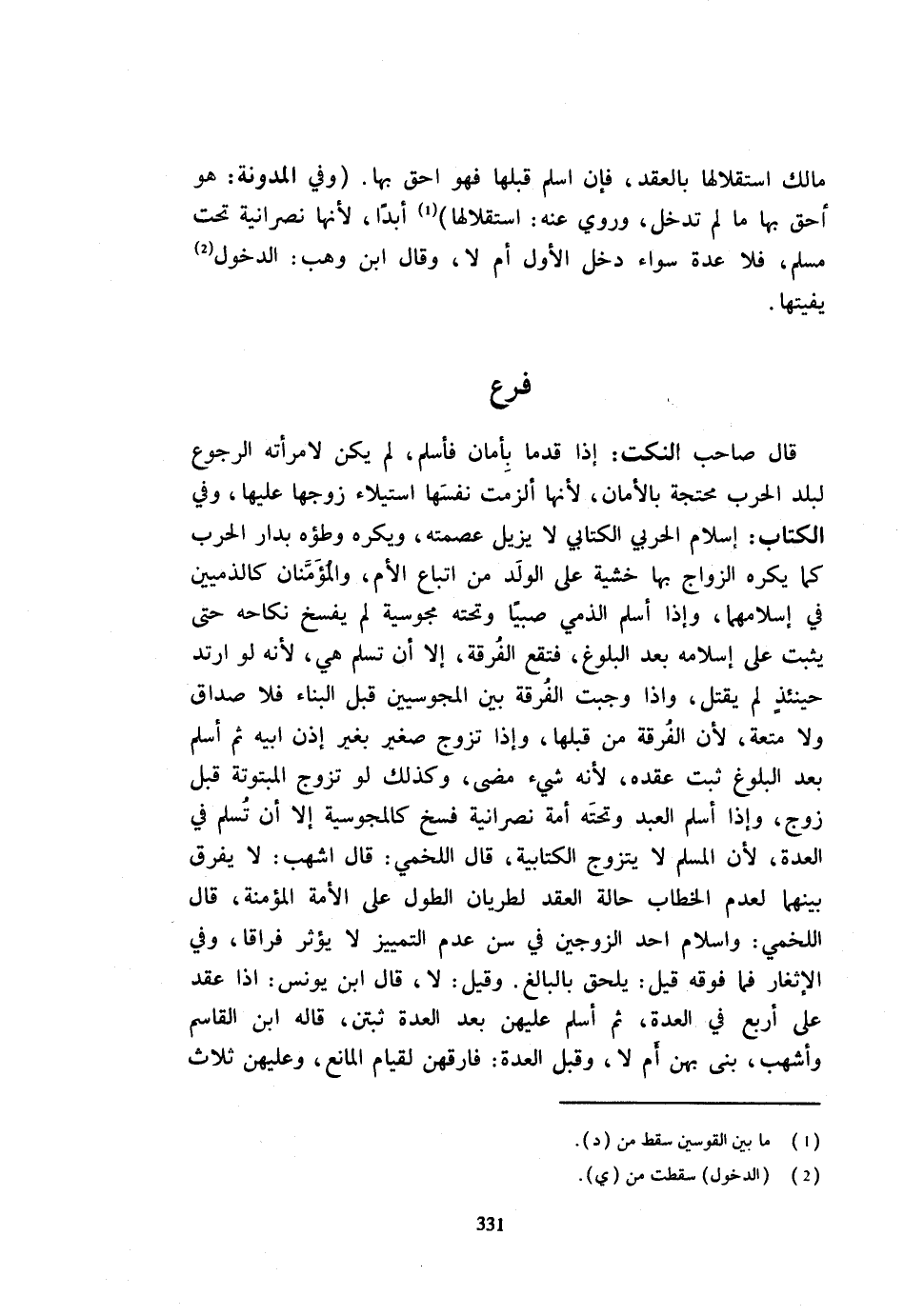قَالَ صَاحِبُ النُّكَتِ إِذَا قَدِمَا بِأَمَانٍ فَأَسْلَمَ لَمْ يَكُنْ لِامْرَأَتِهِ الرُّجُوعُ لِبَلَدِ الْحَرْبِ مُحْتَجَّةً بِالْأَمَانِ لِأَنَّهَا أَلْزَمَتْ نَفْسَهَا اسْتِيلَاءَ زَوْجِهَا عَلَيْهَا وَفِي الْكِتَابِ إِسْلَامُ الْحَرْبِيِّ الْكِتَابِيِّ لَا يُزِيلُ عِصْمَتَهُ وَيُكْرَهُ وَطْؤُهُ بِدَارِ الْحَرْبِ كَمَا يُكْرَهُ الزَّوَاجُ بِهَا خَشْيَةً عَلَى الْوَلَدِ مِنِ اتِّبَاعِ الْأُمِّ وَالْمُؤْمِنَانِ كَالذِّمِّيَّيْنِ فِي إِسْلَامِهِمَا وَإِذَا أَسْلَمَ الذِّمِّيُّ صَبِيًّا وَتَحْتَهُ مَجُوسِيَّةٌ لَمْ يفْسخ نِكَاحه حَتَّى يثبت على إِسْلَامُهُ بَعْدَ الْبُلُوغِ فَتَقَعَ الْفُرْقَةُ إِلَّا أَنْ تُسْلِمَ هِيَ لِأَنَّهُ لَوِ ارْتَدَّ حِينَئِذٍ لَمْ يُقْتَلْ وَإِذَا وَجَبَتِ الْفُرْقَةُ بَيْنَ الْمَجُوسِيَّيْنِ قَبْلَ الْبِنَاءِ فَلَا صَدَاقَ وَلَا مُتْعَةَ لِأَنَّ الْفُرْقَةَ مِنْ قِبَلِهَا وَإِذَا تَزَوَّجَ صَغِيرٌ بِغَيْرِ إِذْنِ أَبِيهِ ثُمَّ أَسْلَمَ بَعْدَ الْبُلُوغِ ثَبَتَ عَقْدُهُ لِأَنَّهُ شَيْءٌ مَضَى وَكَذَلِكَ لَوْ تَزَوَّجَ الْمَبْتُوتَةَ قبل زوج وَإِذا أسلم العَبْد وَتَحْته أَمَةٌ نَصْرَانِيَّةٌ فُسِخَ كَالْمَجُوسِيَّةِ إِلَّا أَنْ تُسْلِمَ فِي الْعِدَّةِ لِأَنَّ الْمُسْلِمَ لَا يَتَزَوَّجُ الْكِتَابِيَّةَ قَالَ اللَّخْمِيُّ قَالَ أَشْهَبُ لَا يُفَرَّقُ بَيْنَهُمَا لعدم الْخطاب حَالَة العقدلطريان الطَّوْلِ عَلَى الْأَمَةِ الْمُؤْمِنَةِ قَالَ اللَّخْمِيُّ وَإِسْلَامُ أَحَدِ الزَّوْجَيْنِ فِي سِنِّ عَدَمِ التَّمْيِيزِ لَا يُؤَثِّرُ فِرَاقًا وَفِي الْإِثْغَارِ فَمَا فَوْقَهُ قِيلَ يَلْحَقُ بِالْبَالِغِ وَقِيلَ لَا قَالَ ابْنُ يُونُسَ إِذَا عَقَدَ عَلَى أَرْبَعٍ فِي الْعِدَّةِ ثُمَّ أَسْلَمَ عَلَيْهِنَّ بَعْدَ الْعِدَّةِ ثَبَتْنَ قَالَهُ ابْنُ الْقَاسِمِ وَأَشْهَبُ بَنَى بِهِنَّ أَمْ لَا وَقَبْلَ الْعِدَّةِ فَارَقَهُنَّ لِقِيَامِ الْمَانِعِ وَعَلَيْهِنَّ ثَلَاثُ
