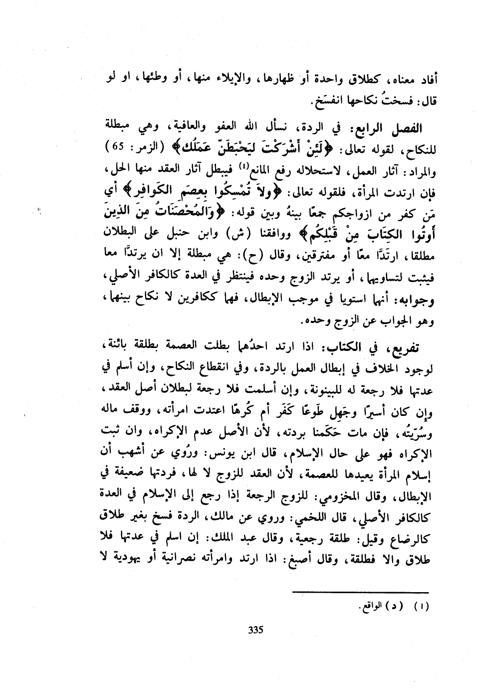 أَفَادَ مَعْنَاهُ كَطَلَاقِ وَاحِدَةٍ أَوْ ظِهَارِهَا وَالْإِيلَاءِ مِنْهَا أَوْ وَطْئِهَا أَوْ لَوْ قَالَ فَسَخْتُ نِكَاحهَا انْفَسَخ الْفَصْل الرَّابِع فِي الرِّدَّة نسْأَل الله الْعَفو والعافية وَهِيَ مُبْطِلَةٌ لِلنِّكَاحِ لِقَوْلِهِ تَعَالَى {لَئِنْ أَشْرَكْتَ لَيَحْبَطَنَّ عَمَلُكَ} الزمر 65 وَالْمُرَادُ آثَارُ الْعَمَلِ لِاسْتِحْلَالِهِ رَفْعَ الْمَانِعِ فَيَبْطُلُ آثَارُ الْعَقْدِ مِنْهَا الْحَلُّ فَإِنِ ارْتَدَّتِ الْمَرْأَةُ فَلِقَوْلِهِ تَعَالَى {وَلا تُمْسِكُوا بعصم الكوافر} أَيْ مَنْ كَفَرَ مِنْ أَزْوَاجِكُمْ جَمْعًا بَيْنَهُ وَبَيْنَ قَوْلِهِ {وَالْمُحْصَنَاتُ مِنَ الَّذِينَ أُوتُوا الْكِتَابَ من قبلكُمْ} وَوَافَقَنَا ش وَابْنُ حَنْبَلٍ عَلَى الْبُطْلَانِ مُطْلَقًا ارْتَدَّا مَعًا أَوْ مُفْتَرِقَيْنَ وَقَالَ ح هِيَ مُبْطَلَةٌ إِلَّا أَنْ يَرْتَدَّا مَعًا فَيَثْبُتَ لِتَسَاوِيهِمَا أَوْ يَرْتَدَّ الزَّوْجُ وَحْدَهُ فَيَنْتَظِرَ فِي الْعِدَّةِ كَالْكَافِرِ الْأَصْلِيِّ وَجَوَابُهُ أَنَّهُمَا اسْتَوَيَا فِي مُوجِبِ الْإِبْطَالِ فَهُمَا كَكَافِرَيْنِ لَا نِكَاحَ بَيْنَهُمَا وَهُوَ الْجَوَابُ عَنِ الزَّوْجِ وَحْدَهُ تَفْرِيعٌ فِي الْكِتَابِ إِذَا ارْتَدَّ أَحَدُهُمَا بَطَلَتِ الْعِصْمَةُ بِطَلْقَةٍ بَائِنَةٍ لِوُجُودِ الْخِلَافِ فِي إِبْطَالِ الْعَمَلِ بِالرِّدَّةِ وَفِي انْقِطَاعِ النِّكَاحِ وَإِنْ أَسْلَمَ فِي عِدَّتِهَا فَلَا رَجْعَةَ لَهُ لِلْبَيْنُونَةِ وَإِنْ أَسْلَمَتْ فَلَا رَجْعَةَ لِبُطْلَانِ أَصْلِ الْعَقْدِ وَإِنْ كَانَ أَسِيرًا وَجَهِلَ طَوْعًا كَفَرَ أَمْ كُرْهًا اعْتَدَتِ امْرَأَتُهُ وَوَقَفَ مَالُهُ وَسُرِّيَّتُهُ فَإِنْ مَاتَ حَكَمْنَا بِرِدَّتِهِ لِأَنَّ الْأَصْلَ عَدَمُ الْإِكْرَاهِ وَإِنْ ثَبَتَ الْإِكْرَاهُ فَهُوَ عَلَى حَالِ الْإِسْلَامِ قَالَ ابْنُ يُونُسَ وَرُوِيَ عَنْ أَشْهَبَ أَنَّ إِسْلَامَ الْمَرْأَةِ يُعِيدُهَا لِلْعِصْمَةِ لِأَنَّ الْعَقْدَ لِلزَّوْجِ لَا لَهَا فَرِدَّتُهَا ضَعِيفَةٌ فِي الْإِبْطَالِ وَقَالَ الْمَخْزُومِيُّ لِلزَّوْجِ الرَّجْعَةُ إِذَا رَجَعَ إِلَى الْإِسْلَامِ فِي الْعِدَّةِ كَالْكَافِرِ الْأَصْلِيِّ قَالَ اللَّخْمِيُّ وَرُوِيَ عَنْ مَالِكٍ الرِّدَّةُ فَسْخٌ بِغَيْرِ طَلَاقٍ كَالرَّضَاعِ وَقِيلَ طَلْقَةٌ رَجْعِيَّةٌ وَقَالَ عَبْدُ الْمَلِكِ إِنْ أَسْلَمَ فِي عِدَّتِهَا فَلَا طَلَاقَ وَإِلَّا فَطَلْقَةٌ وَقَالَ أَصْبَغُ إِذَا ارْتَدَّ وَامْرَأَتُهُ نَصْرَانِيَّةٌ أَوْ يَهُودِيَّةٌ لَا