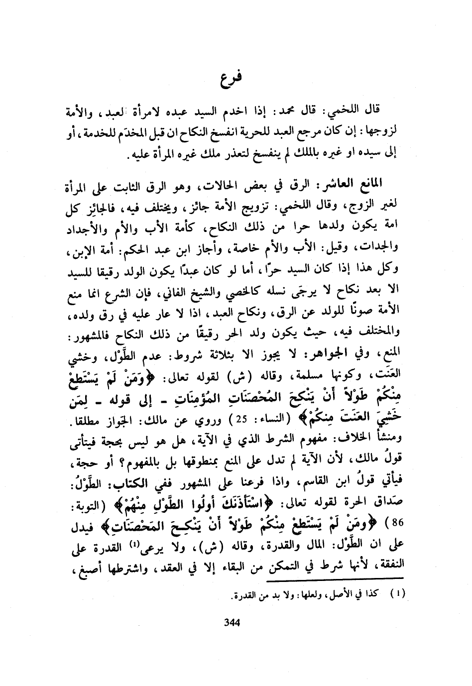 قَالَ اللَّخْمِيُّ قَالَ مُحَمَّدٌ إِذَا أَخْدَمَ السَّيِّد عَبده لامْرَأَته لعبد وَالْأَمَةَ لِزَوْجِهَا إِنْ كَانَ مَرْجِعُ الْعَبْدِ لِلْحُرِّيَّةِ انْفَسَخَ النِّكَاحُ إِنْ قَبِلَ الْمُخْدَمُ لِلْخِدْمَةِ أَوْ إِلَى سَيّده أَو غير بِالْمِلْكِ لَمْ يَنْفَسِخْ لِتَعَذُّرِ مِلْكِ غَيْرِهِ الْمَرْأَةَ عَلَيْهِ الْمَانِعُ الْعَاشِرُ الرِّقُّ فِي بَعْضِ الْحَالَاتِ وَهُوَ الرِّقُّ الثَّابِتُ عَلَى الْمَرْأَةِ لِغَيْرِ الزَّوْجِ وَقَالَ اللَّخْمِيّ تَزْوِيج الْأمة جَائِز وَيخْتَلف فِيهِ فَالْجَائِزُ كُلُّ أَمَةٍ يَكُونُ وَلَدُهَا حُرًّا مِنْ ذَلِكَ النِّكَاحِ كَأَمَةِ الْأَبِ وَالْأُمِّ وَالْأَجْدَادِ وَالْجَدَّاتِ وَقِيلَ الْأَبُ وَالْأُمُّ خَاصَّةً وَأَجَازَ ابْنُ عَبْدِ الْحَكَمِ أَمَةَ الِابْنِ وَكُلُّ هَذَا إِذَا كَانَ السَّيِّدُ حُرًّا أَمَّا لَوْ كَانَ عَبْدًا يكون الْوَلَد رَقِيقا للسَّيِّد إِلَّا بعد نِكَاح لَا يُرْجَى نَسْلُهُ كَالْخَصِيِّ وَالشَّيْخِ الْفَانِي فَإِنَّ الشَّرْعَ إِنَّمَا مَنَعَ الْأَمَةَ صَوْنًا لِلْوَلَدِ عَنِ الرّقّ وَنِكَاح العَبْد إِذا لَا عَارَ عَلَيْهِ فِي رِقِّ وَلَدِهُ وَالْمُخْتَلَفُ فِيهِ حَيْثُ يَكُونُ وَلَدُ الْحُرِّ رَقِيقًا مِنْ ذَلِكَ النِّكَاحِ فَالْمَشْهُورُ الْمَنْعُ وَفِي الْجَوَاهِرِ لَا يَجُوزُ إِلَّا بِثَلَاثَةِ شُرُوطٍ عَدَمِ الطَّوْلِ وَخَشْيِ الْعَنَتِ وَكَوْنِهَا مَسْلِمَةً وَقَالَهُ ش لِقَوْلِهِ تَعَالَى {وَمَنْ لَمْ يَسْتَطِعْ مِنْكُمْ طَوْلا أَنْ يَنْكِحَ الْمُحْصنَات الْمُؤْمِنَات إِلَى قَوْلِهِ لِمَنْ خَشِيَ الْعَنَتَ مِنْكُمْ} النِّسَاء 25 وَرُوِيَ عَن مَالك الْجَوَاز مُطلقًا ومنشأ الْخِلَافِ مَفْهُومُ الشَّرْطِ الَّذِي فِي الْآيَةِ هَلْ هُوَ لَيْسَ بِحُجَّةٍ فَيَتَأَتَّى قَوْلُ مَالِكٍ لِأَنَّ الْآيَةَ لَمْ تَدُلَّ عَلَى الْمَنْعِ بِمَنْطُوقِهَا بَلْ بِالْمَفْهُومِ أَوْ حُجَّةً فَيَأْتِي قَوْلُ ابْنِ الْقَاسِمِ وَإِذَا فَرَّعْنَا عَلَى الْمَشْهُورِ فَفِي الْكِتَابِ الطَّوْلُ صدَاق الْحرَّة لقَوْله تَعَالَى {استأذنك أولُوا الطَّوْلِ مِنْهُمْ} التَّوْبَة 86 {وَمَنْ لَمْ يَسْتَطِعْ مِنْكُمْ طولا أَن ينْكح الْمُحْصنَات} فَيَدُلُّ عَلَى أَنَّ الطَّوْلَ الْمَالُ وَالْقُدْرَةُ وَقَالَهُ ش وَلَا يرْعَى الْقُدْرَةَ عَلَى النَّفَقَةِ لِأَنَّهَا شَرْطٌ فِي التَّمَكُّنِ مِنَ الْبَقَاءِ إِلَّا فِي الْعَقْدِ وَاشْتَرَطَهَا أَصْبَغُ