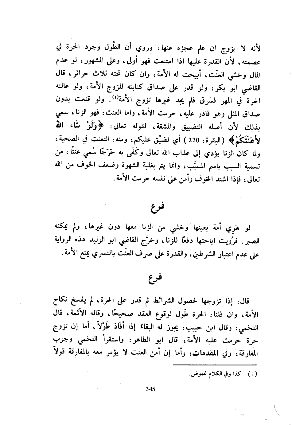 لِأَنَّهُ لَا يُزَوَّجُ إِنْ عُلِمَ عَجْزُهُ عَنْهَا وَرُوِيَ أَنَّ الطَّوْلَ وُجُودُ الْحُرَّةِ فِي عِصْمَتِهِ لِأَنَّ الْقُدْرَةَ عَلَيْهَا إِذَا امْتَنَعَتْ فَهُوَ أَوْلَى وَعَلَى الْمَشْهُورِ لَوْ عَدِمَ الْمَالَ وَخَشِيَ الْعَنَتَ أُبِيحَتْ لَهُ الْأَمَةُ وَإِنْ كَانَ تَحْتَهُ ثَلَاثُ حَرَائِرَ قَالَ الْقَاضِي أَبُو بَكْرٍ وَلَوْ قَدَرَ على صدَاق كِتَابَته للزَّوْج الْأَمَةَ وَلَوْ عَالَتْهُ الْحُرَّةُ فِي الْمَهْرِ فَسُرِقَ فَلَمْ يَجِدْ غَيْرَهَا تَزَوَّجَ الْأَمَةَ وَلَوْ قَنِعَتْ بِدُونِ صَدَاقِ الْمِثْلِ وَهُوَ قَادِرٌ عَلَيْهِ حُرِّمَتِ الْأَمَةُ وَأَمَّا الْعَنَتُ فَهُوَ الزِّنَا سُمِّيَ بِذَلِكَ لِأَن أَصله التَّضْيِيق وَالْمَشَقَّة لِقَوْلِهِ تَعَالَى {وَلَوْ شَاءَ اللَّهُ لأَعْنَتَكُمْ} الْبَقَرَة 220 أَي لضيق عَلَيْكُمْ وَمِنْهُ التَّعَنُّتُ فِي الصُّحْبَةِ وَلَمَّا كَانَ الزِّنَا يُؤَدِّي إِلَى عَذَابِ اللَّهِ تَعَالَى وَكَفَى بِهِ جرحا سُمِّيَ عَنَتًا مِنْ تَسْمِيَةِ السَّبَبِ بِاسْمِ الْمُسَبَّبِ وَإِنَّمَا يَتِمُّ بِغَلَبَةِ الشَّهْوَةِ وَضَعْفِ الْخَوْفِ مِنَ اللَّهِ تَعَالَى فَإِذَا اشْتَدَّ الْخَوْفُ وَأَمِنَ عَلَى نَفْسِهِ حُرِّمَتِ الْأَمَةُ