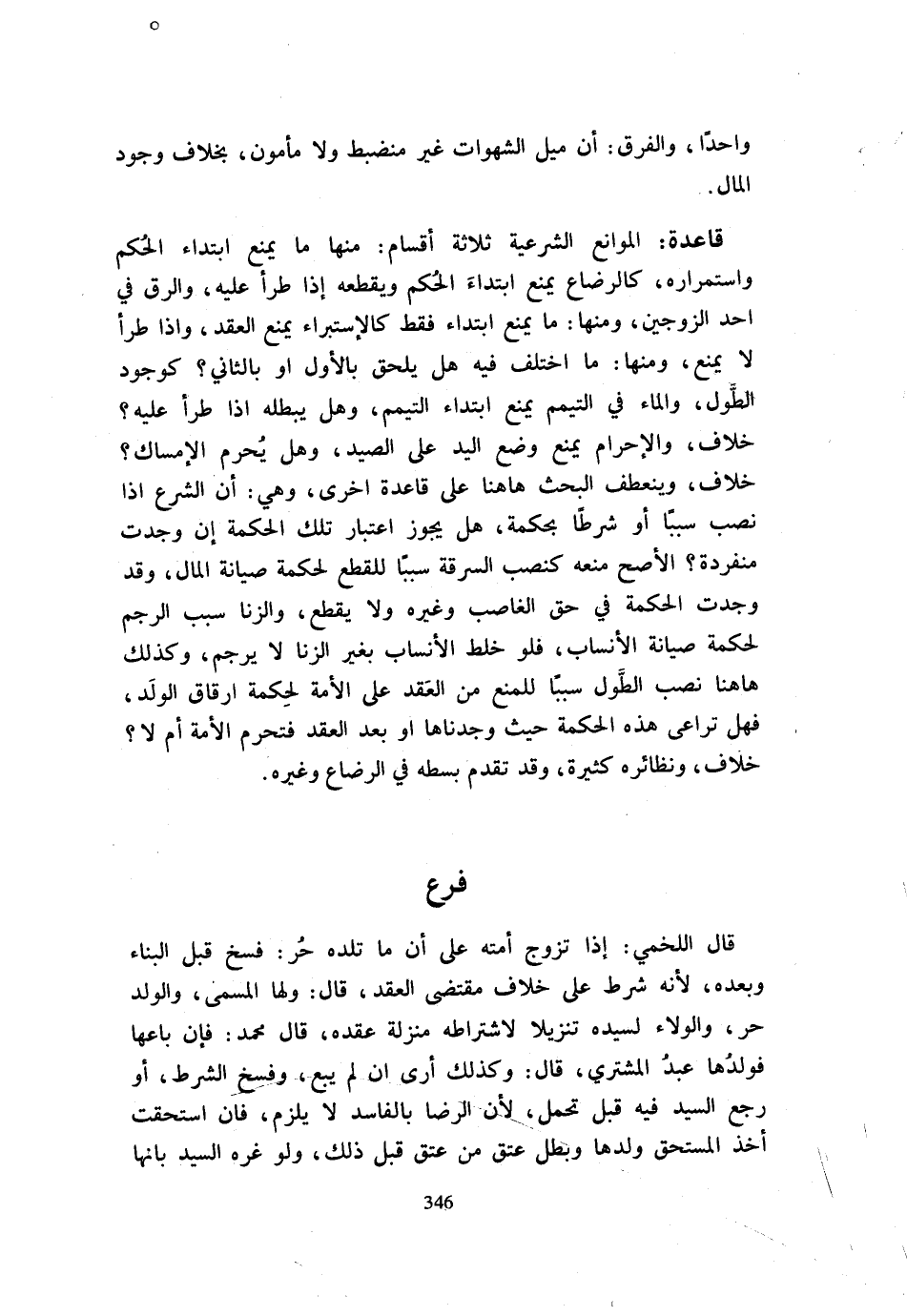 وَاحِدًا وَالْفَرْقُ أَنَّ مَيْلَ الشَّهَوَاتِ غَيْرُ مُنْضَبِطٍ وَلَا مَأْمُونٍ بِخِلَافِ وُجُودِ الْمَالِ قَاعِدَةٌ الْمَوَانِعُ الشَّرْعِيَّةُ ثَلَاثَةِ أَقْسَامٍ مِنْهَا مَا يَمْنَعُ ابْتِدَاءَ الْحُكْمِ وَاسْتِمْرَارَهُ كَالرَّضَاعِ يَمْنَعُ ابْتِدَاءَ الْحُكْمِ وَيَقْطَعُهُ إِذَا طَرَأَ عَلَيْهِ وَالرِّقِّ فِي أَحَدِ الزَّوْجَيْنِ وَمِنْهَا مَا يَمْنَعُ ابْتِدَاءً فَقَطْ كَالِاسْتِبْرَاءِ يَمْنَعُ الْعَقْدَ وَإِذَا طَرَأَ لَا يَمْنَعُ وَمِنْهَا مَا اخْتُلِفَ فِيهِ هَلْ يَلْحَقُ بِالْأَوَّلِ أَوْ بِالثَّانِي كَوُجُودِ الطَّوْلِ وَالْمَاءُ فِي التَّيَمُّمِ يَمْنَعُ ابْتِدَاءَ التَّيَمُّمِ وَهَلْ يُبْطِلُهُ إِذَا طَرَأَ عَلَيْهِ خِلَافٌ وَالْإِحْرَامُ يَمْنَعُ وَضْعَ الْيَدِ عَلَى الصَّيْدِ وَهَلْ يحرم الْإِمْسَاك خلاف وينعطف الْبَحْث هَا هُنَا عَلَى قَاعِدَةٍ أُخْرَى وَهِيَ أَنَّ الشَّرْعَ إِذا نصب سَببا أَو شرطا بِحكمِهِ هَلْ يَجُوزُ اعْتِبَارُ تِلْكَ الْحِكْمَةِ إِنْ وُجِدَتْ مُنْفَرِدَةً الْأَصَحُّ مَنْعُهُ كَنَصْبِ السَّرِقَةِ سَبَبًا لِلْقَطْعِ لِحِكْمَةِ صِيَانَةِ الْمَالِ وَقَدْ وُجِدَتِ الْحِكْمَةُ فِي حَقِّ الْغَاصِبِ وَغَيْرِهِ وَلَا يُقْطَعُ وَالزِّنَا سَبَبُ الرَّجْمِ لِحِكْمَةِ صِيَانَةِ الْأَنْسَابِ فَلَوْ خَلَطَ الْأَنْسَابَ بِغَيْر الزِّنَا لَا يرْجم وَكَذَلِكَ هَا هُنَا نَصْبُ الطَّوْلِ سَبَبًا لِلْمَنْعِ مِنَ الْعَقْدِ عَلَى الْأَمَةِ لِحِكْمَةِ إِرْقَاقِ الْوَلَدِ فَهَلْ تُرَاعَى هَذِهِ الْحِكْمَة حَيْثُ وجدنَا أَوْ بَعْدَ الْعَقْدِ فَتُحَرَّمَ الْأَمَةُ أَمْ لَا خِلَافٌ وَنَظَائِرُهُ كَثِيرَةٌ وَقَدْ تَقَدَّمَ بَسْطُهُ فِي الرَّضَاعِ وَغَيْرِهِ