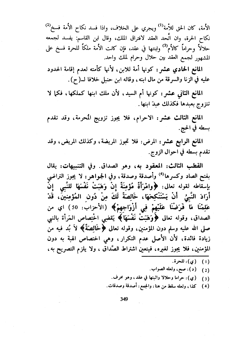 الْأَمَةِ كَانَ الْحَقُّ لِلْأَمَةِ وَيَجْرِي عَلَى الْخِلَافِ وَإِذا أفسد نِكَاح الْأمة فسخ نِكَاحُ الْحُرَّةِ وَإِنِ اتَّحَدَ الْعَقْدُ لِافْتِرَاقِ الْمِلْكِ وَقَالَ ابْنُ الْقَاسِمِ يَفْسُدُ لِجَمْعِهِ حَلَالًا وَحَرَامًا كَالْأُمِّ وَابْنَتِهَا فِي عَقْدٍ فَإِنْ كَانَتِ الْأَمَةُ مِلْكًا لِلْحُرَّةِ فُسِخَ عَلَى الْمَشْهُورِ لِجَمْعِ الْعَقْدِ بَين حَلَال وَحرَام لملك وَاحِد الْمَانِعُ الْحَادِي عَشَرَ كَوْنُهَا أَمَةً لِلِابْنِ لِأَنَّهَا كَأَمَتِهِ لِعَدَمِ إِقَامَةِ الْحُدُودِ عَلَيْهِ فِي الزِّنَا وَالسَّرِقَةِ مِنْ مَالِ ابْنِهِ وَقَالَهُ ابْنُ حَنْبَلٍ خِلَافًا لِ ح الْمَانِعُ الثَّانِي عَشَرَ كَوْنُهَا أُمَّ السَّيِّدِ لِأَنَّ مِلْكَ ابْنِهَا كَمِلْكِهَا فَكَمَا لَا تَتَزَوَّجُ بِعَبْدِهَا فَكَذَلِكَ عَبَدُ ابْنِهَا الْمَانِعُ الثَّالِثَ عَشَرَ الْإِحْرَامُ فَلَا يَجُوزُ تَزْوِيجُ الْمُحْرِمَةِ وَقَدْ تَقَدَّمَ بَسْطُهُ فِي الْحَجِّ الْمَانِعُ الرَّابِعَ عَشَرَ الْمَرَضُ فَلَا تَجُوزُ الْمَرِيضَةُ وَكَذَلِكَ الْمَرِيضُ وَقَدْ تَقَدَّمَ بَسْطُهُ فِي أَحْوَالِ الزَّوْجِ الْقُطْبُ الثَّالِثُ الْمَعْقُودُ بِهِ وَهُوَ الصَّدَاقُ وَفِي التَّنْبِيهَاتِ يُقَالُ بِفَتْحِ الصَّادِ وَكَسْرِهَا وَأَصْدَقَهُ وَصَدَقَةُ وَفِي الْجَوَاهِرِ لَا يَجُوزُ التَّرَاضِي بِإِسْقَاطِهِ لِقَوْلِهِ تَعَالَى ( {وَامْرَأَةً مُؤْمِنَةً إِنْ وَهَبَتْ نَفْسَهَا لِلنَّبِيِّ إِنْ أَرَادَ النَّبِيُّ أَنْ يَسْتَنْكِحَهَا خَالِصَةً لَكَ مِنْ دُونِ الْمُؤْمِنِينَ قَدْ عَلِمْنَا مَا فَرَضْنَا عَلَيْهِمْ فِي أَزْوَاجِهِمْ} الْأَحْزَاب 50 أَيْ مِنَ الصَّدَاقِ وقَوْله تَعَالَى ( {وهبت نَفسهَا} يَقْضِي اخْتِصَاصَ الْمَرْأَةِ بِالنَّبِيِّ - صَلَّى اللَّهُ عَلَيْهِ وَسَلَّم َ - دون الْمُؤمنِينَ وَقَوله تَعَالَى {خَالِصَة} لَا بُدَّ فِيهِ مِنْ زِيَادَةِ فَائِدَةٍ لِأَنَّ الْأَصْلَ عَدَمُ التَّكْرَارِ وَهِيَ اخْتِصَاصُ الْهِبَةِ بِهِ دون الْمُؤمنِينَ فَلَا يجوز لِغَيْرِهِ فَيَتَعَيَّنُ اشْتِرَاطُ الصَّدَاقِ وَلَا يَلْزَمُ التَّصْرِيحُ بِهِ