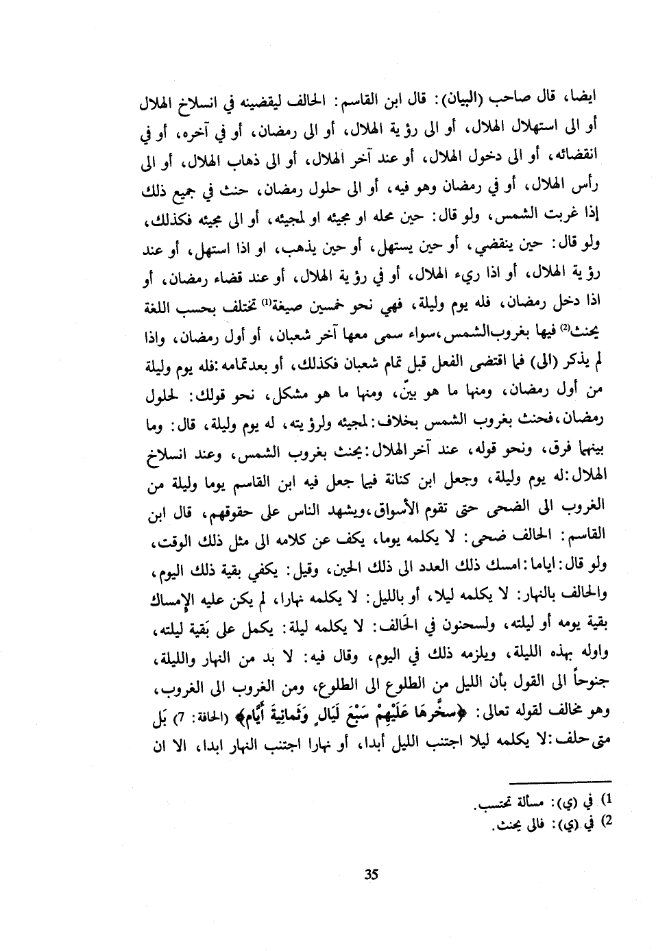 أَيْضًا قَالَ صَاحِبُ الْبَيَانِ قَالَ ابْنُ الْقَاسِمِ الْحَالِفُ لَيَقْضِيَنَّهُ فِي انْسِلَاخِ الْهِلَالِ أَوْ إِلَى اسْتِهْلَالِ الْهِلَالِ أَوْ إِلَى رُؤْيَةِ الْهِلَالِ أَوْ إِلَى رَمَضَانَ أَوْ فِي آخِرِهِ أَوْ فِي انْقِضَائِهِ أَوْ إِلَى دُخُولِ الْهِلَالِ أَوْ عِنْدَ آخِرِ الْهِلَالِ أَوْ إِلَى ذَهَابِ الْهِلَالِ أَوْ إِلَى رَأْسِ الْهِلَالِ أَوْ فِي رَمَضَانَ وَهُوَ فِيهِ أَوْ إِلَى حُلُولِ رَمَضَانَ حَنِثَ فِي جَمِيعِ ذَلِكَ إِذَا غَرَبَتِ الشَّمْسُ وَلَوْ قَالَ حِينَ مَحَلِّهِ أَوْ مَجِيئِهِ أَوْ لِمَجِيئِهِ أَوْ إِلَى مَجِيئِهِ فَكَذَلِكَ وَلَوْ قَالَ حِينَ يَنْقَضِي أَوْ حِينَ يَسْتَهِلُّ أَوْ حِينَ يَذْهَبُ أَوْ إِذَا اسْتَهَلَّ أَوْ عِنْدَ رُؤْيَةِ الْهِلَالِ أَوْ إِذَا رِيءَ الْهِلَالُ أَوْ فِي رُؤْيَةِ الْهِلَالِ أَوْ عِنْدَ قَضَاءِ رَمَضَانَ أَوْ إِذَا دَخَلَ رَمَضَانُ فَلَهُ يَوْمٌ وَلَيْلَةٌ فَهِيَ نَحْوُ خَمْسِينَ صِيغَةً تَخْتَلِفُ بِحَسَبِ اللُّغَةِ يَحْنَثُ فِيهَا بِغُرُوبِ الشَّمْسِ سَوَاءٌ سَمَّى مَعَهَا آخِرَ شَعْبَانَ أَوْ أَوَّلَ رَمَضَانَ وَإِذَا لَمْ يَذْكُرْ إِلَى فَمَا اقْتَضَى الْفِعْلُ قَبْلَ تَمَامِ شَعْبَانَ فَكَذَلِكَ أَوْ بَعْدَ تَمَامِهِ فَلَهُ يَوْمٌ وَلَيْلَةٌ مِنْ أَوَّلِ رَمَضَانَ وَمِنْهَا مَا هُوَ بَيِّنٌ وَمِنْهَا مَا هُوَ مُشْكِلٌ نَحْوَ قَوْلِكَ لِحُلُولِ رَمَضَانَ فَحَنِثَ بِغُرُوبِ الشَّمْسِ بِخِلَافِ لِمَجِيئِهِ وَلِرُؤْيَتِهِ لَهُ يَوْمٌ وَلَيْلَةٌ قَالَ وَمَا بَيْنَهُمَا فَرْقٌ وَنَحْوُ قَوْلِهِ عِنْدَ آخِرِ الْهِلَالِ يَحْنَثُ بِغُرُوبِ الشَّمْسِ وَعِنْدَ انْسِلَاخِ الْهِلَالِ لَهُ يَوْمٌ وَلَيْلَةٌ وَجَعَلَ ابْنُ كِنَانَةَ فِيمَا جَعَلَ فِيهِ ابْنُ الْقَاسِمِ يَوْمًا وَلَيْلَةً مِنَ الْغُرُوبِ إِلَى الضُّحَى حَتَّى تَقُومَ الْأَسْوَاقُ وَيَشْهَدَ النَّاسُ عَلَى حُقُوقِهِمْ قَالَ ابْنُ الْقَاسِمِ الْحَالِفُ ضُحًى لَا يُكَلِّمُهُ يَوْمًا يَكُفُّ عَنْ كَلَامِهِ إِلَى مِثْلِ ذَلِكَ الْوَقْتِ وَلَوْ قَالَ أَيَّامًا أَمْسَكَ ذَلِكَ الْعَدَدَ إِلَى ذَلِكَ الْحِينِ وَقِيلَ يَكْفِي بَقِيَّةَ ذَلِكَ الْيَوْمِ وَالْحَالِفُ بِالنَّهَارِ لَا يُكَلِّمُهُ لَيْلًا أَوْ بِاللَّيْلِ لَا يكلمهُ نَهَارا لم يكن عَلَيْهِ الْإِمْسَاك بَقِيَّة يَوْمِهِ أَوْ لَيْلَتِهِ وَلِسَحْنُونٍ فِي الْحَالِفِ لَا يُكَلِّمُهُ لَيْلَةً يُكْمِلُ عَلَى بَقِيَّةِ لَيْلَتِهِ وَأَوَّلُهُ بِهَذِهِ اللَّيْلَة وَيلْزمهُ ذَلِك فِي الْيَوْم وَال فِيهِ لَا بُدَّ مِنَ النَّهَارِ وَاللَّيْلَةِ جُنُوحًا إِلَى الْقَوْلِ بِأَنَّ اللَّيْلَ مِنَ الطُّلُوعِ إِلَى الطُّلُوعِ وَمِنَ الْغُرُوبِ إِلَى الْغُرُوبِ وَهُوَ مُخَالِفٌ لقَوْله تَعَالَى {سخرنا عَلَيْهِم سبع لَيَال وَثَمَانِية أَيَّام} الحافة 7 بَلْ مَتَى حَلَفَ لَا يُكَلِّمُهُ لَيْلًا اجْتَنَبَ اللَّيْلَ أَبَدًا أَوْ نَهَارًا اجْتَنَبَ النَّهَارَ أَبَدًا إِلَّا أَن