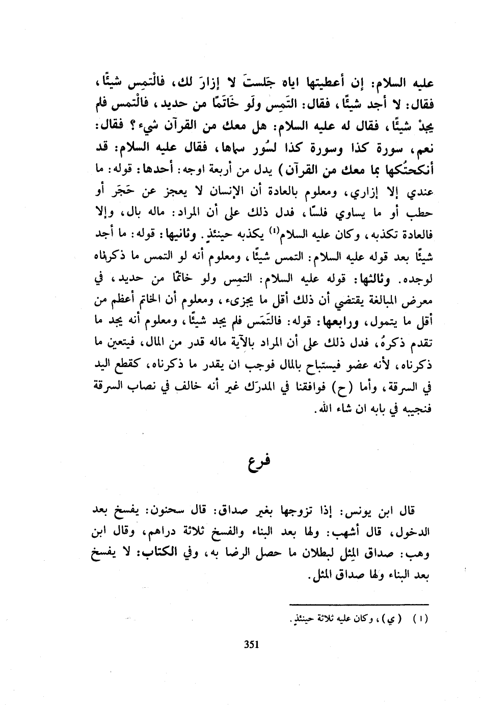 عَلَيْهِ السَّلَامُ إِنْ أَعْطَيْتَهَا إِيَّاهُ جَلَسْتَ لَا إِزَارَ لَكَ فَالْتَمِسْ شَيْئًا فَقَالَ لَا أَجِدُ شَيْئًا فَقَالَ الْتَمِسْ وَلَوْ خَاتَمًا مِنْ حَدِيدٍ فَالْتَمَسَ فَلَمْ يَجِدْ شَيْئًا فَقَالَ لَهُ عَلَيْهِ السَّلَامُ هَلْ مَعَكَ مِنَ الْقُرْآنِ شَيْءٌ فَقَالَ نَعَمْ سُورَةُ كَذَا وَسُورَةُ كَذَا لِسُوَرٍ سَمَّاهَا فَقَالَ عَلَيْهِ السَّلَامُ قَدْ أَنْكَحْتُكَهَا بِمَا مَعَكَ مِنَ الْقُرْآنِ يَدُلُّ مِنْ أَرْبَعَةِ أَوْجُهٍ أَحَدُهَا قَوْلُهُ مَا عِنْدِي إِلَّا إِزَارِي وَمَعْلُومٌ بِالْعَادَةِ أَنَّ الْإِنْسَانَ لَا يَعْجِزُ عَنْ حَجَرٍ أَوْ حَطَبٍ أَوْ مَا يُسَاوِي فَلْسًا فَدَلَّ ذَلِكَ على أَن المُرَاد مَاله بَالٌ وَإِلَّا فَالْعَادَةُ تُكَذِّبُهُ وَكَانَ عَلَيْهِ السَّلَامُ يكذبهُ حِينَئِذٍ وَثَانِيهمَا قَوْلُهُ مَا أَجِدُ شَيْئًا بَعْدَ قَوْلِهِ عَلَيْهِ السَّلَامُ الْتَمِسْ شَيْئًا وَمَعْلُومٌ أَنَّهُ لَوِ الْتَمَسَ مَا ذَكَرْنَاهُ لَوَجَدَهُ وَثَالِثُهَا قَوْلُهُ عَلَيْهِ السَّلَامُ الْتَمِسْ وَلَوْ خَاتَمًا مِنْ حَدِيدٍ فِي مَعْرِضِ الْمُبَالَغَةِ يَقْتَضِي أَنَّ ذَلِكَ أَقَلُّ مَا يُجَزِئُ وَمَعْلُومٌ أَنَّ الْخَاتَمَ أَعْظَمُ مِنْ أَقَلِّ مَا يتمول وَرَابِعهَا قَوْله فالتمس فَلم يجد شَيْئا وَمَعْلُوم أَنه يَجِد مَا تَقَدَّمَ ذِكْرُهُ فَدَلَّ ذَلِكَ عَلَى أَنَّ الْمُرَادَ بِالْآيَةِ مَا لَهُ قَدْرٌ مِنَ الْمَالِ فَيَتَعَيَّنُ مَا ذَكَرْنَاهُ لِأَنَّهُ عُضْوٌ فَيُسْتَبَاحُ بِالْمَالِ فَوَجَبَ أَنْ يُقَدَّرَ مَا ذَكَرْنَاهُ كَقَطْعِ الْيَدِ فِي السَّرِقَةِ وَأَمَّا ح فَوَافَقَنَا فِي الْمُدْرَكِ غَيْرَ أَنَّهُ خَالَفَ فِي نِصَابِ السَّرِقَةَ فَنُجِيبُهُ فِي بَابِهِ إِنْ شَاءَ اللَّهُ