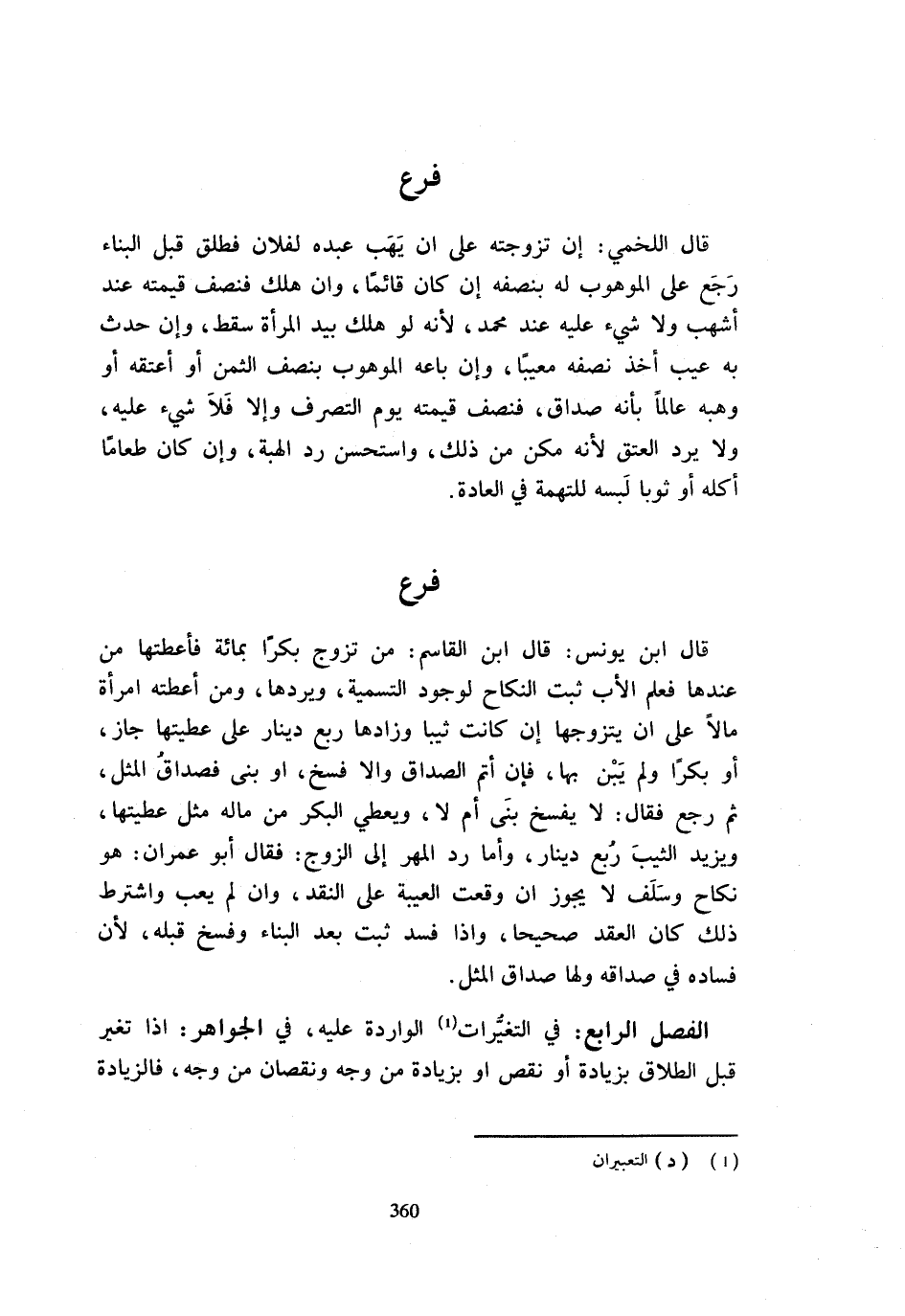 قَالَ ابْنُ يُونُسَ قَالَ ابْنُ الْقَاسِمُ من تزوج بكرا بِمِائَة فأعطتها مَنْ عِنْدَهَا فَعَلِمَ الْأَبُ ثَبَتَ النِّكَاحُ لِوُجُودِ التَّسْمِيَةِ وَيَرُدُّهَا وَمَنْ أَعْطَتْهُ امْرَأَةٌ مَالًا عَلَى أَنْ يَتَزَوَّجَهَا إِنْ كَانَتْ ثَيِّبًا وَزَادَهَا رُبُعَ دِينَارٍ عَلَى عَطِيَّتِهَا جَازَ أَوْ بِكْرًا وَلَمْ يَبْنِ بِهَا فَإِنْ أَتَمَّ الصَّدَاقَ وَإِلَّا فُسِخَ أَوْ بَنَى فَصَدَاقُ الْمِثْلِ ثُمَّ رَجَعَ فَقَالَ لَا يُفْسَخُ بَنَى أَمْ لَا وَيُعْطِي الْبِكْرَ مِنْ مَالِهِ مِثْلَ عَطِيَّتِهَا وَيَزِيدُ الثَّيِّبَ رُبُعُ دِينَارٍ وَأَمَّا رَدُّ الْمَهْرِ إِلَى الزَّوْجِ فَقَالَ أَبُو عِمْرَانَ هُوَ نِكَاحٌ وَسَلَفٌ لَا يَجُوزُ إِن وَقعت العيبة على النَّقْد وَإِن لم يعب وَاشْتَرَطَ ذَلِكَ كَانَ الْعَقْدُ صَحِيحًا وَإِذَا فَسَدَ ثَبَتَ بَعْدَ الْبِنَاءِ وَفُسِخَ قَبْلَهُ لِأَنَّ فَسَادَهُ فِي صَدَاقِهِ وَلَهَا صَدَاقُ الْمِثْلِ الْفَصْلُ الرَّابِعُ فِي التَّغَيُّرَاتِ الْوَارِدَةِ عَلَيْهِ فِي الْجَوَاهِرِ إِذَا تَغَيَّرَ قَبْلَ الطَّلَاقِ بِزِيَادَةٍ أَوْ نَقْصٍ أَوْ بِزِيَادَةٍ مِنْ وَجْهٍ وَنُقْصَانٍ مِنْ وَجْهٍ فَالزِّيَادَةُ