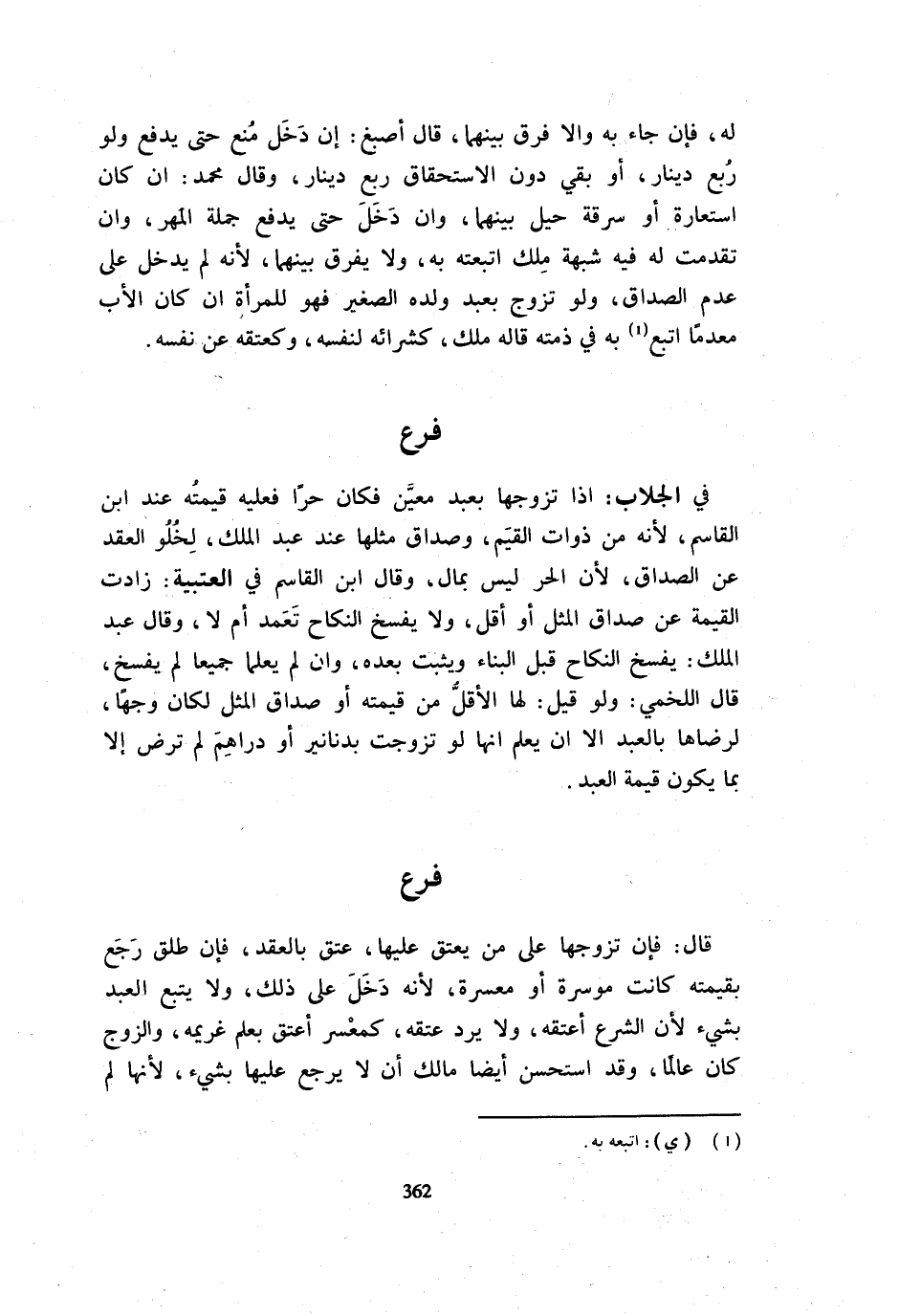 فِي الْجُلَّابِ إِذَا تَزَوَّجَهَا بِعَبْدٍ مُعَيَّنٍ فَكَانَ حُرًّا فَعَلَيْهِ قِيمَتُهُ عِنْدَ ابْنِ الْقَاسِمِ لِأَنَّهُ مِنْ ذَوَاتِ الْقِيَمِ وَصَدَاقُ مِثْلِهَا عِنْدَ عَبْدِ الْمِلْكِ لِخُلُوِّ الْعَقْدِ عَنِ الصَّدَاقِ لِأَنَّ الْحُرَّ لَيْسَ بِمَالٍ وَقَالَ ابْنُ الْقَاسِمِ فِي الْعُتْبِيَّةِ زَادَتِ الْقِيمَةُ عَنْ صَدَاقِ الْمِثْلِ أَوْ أَقَلَّ وَلَا يفْسخ النِّكَاح تعمد أَمْ لَا وَقَالَ عَبْدُ الْمَلِكِ يُفْسَخُ النِّكَاحُ قَبْلَ الْبِنَاءِ وَيَثْبُتُ بَعْدَهُ وَإِنْ لَمْ يَعْلَمَا جَمِيعًا لَمْ يُفْسَخْ قَالَ اللَّخْمِيُّ وَلَوْ قِيلَ لَهَا الْأَقَلُّ مِنْ قِيمَتِهِ أَوْ صَدَاقُ الْمِثْلِ لَكَانَ وَجْهًا لِرِضَاهَا بِالْعَبْدِ إِلَّا أَنْ يَعْلَمَ أَنَّهَا لَوْ تَزَوَّجَتْ بِدَنَانِيرَ أَوْ دَرَاهِمَ لَمْ تَرْضَ إِلَّا بِمَا يَكُونُ قِيمَةَ الْعَبْدِ