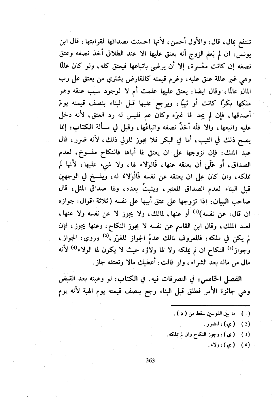 تَنْتَفِعْ بِمَالٍ قَالَ وَالْأَوَّلُ أَحْسَنُ لِأَنَّهَا أَحْسَنَتْ بِصَدَاقِهَا لِقَرَابَتِهَا قَالَ ابْنُ يُونُسَ إِنْ لَمْ يَعْلَمِ الزَّوْجُ أَنَّهُ يُعْتِقُ عَلَيْهَا إِلَّا عِنْدَ الطَّلَاقِ أَخَذَ نِصْفَهُ وَعَتَقَ نِصْفُهُ إِنْ كَانَتْ مُعْسِرَةً إِلَّا أَنْ يَرْضَى بِاتِّبَاعِهَا فَيُعْتِقَ كُلَّهُ وَلَوْ كَانَ عَالِمًا وَهِيَ غَيْرُ عَالِمَةٍ عَتَقَ عَلَيْهِ وَغَرِمَ قِيمَتَهُ كَالْمُقَارِضِ يَشْتَرِي مَنْ يُعْتِقُ عَلَى رَبِّ الْمَالِ عَالِمًا وَقَالَ أَيْضًا يُعْتِقُ عَلَيْهَا عَلِمَتْ أَمْ لَا لِوُجُودِ سَبَبِ عِتْقِهِ وَهُوَ مِلْكُهَا بِكْرًا كَانَتْ أَوْ ثَيِّبًا وَيَرْجِعُ عَلَيْهَا قَبْلَ الْبِنَاءِ بِنِصْفِ قِيمَتِهِ يَوْمَ أَصْدَقَهَا فَإِنْ لَمْ يَجِدْ لَهَا غَيْرَهُ وَكَانَ عَلِمَ فَلَيْسَ لَهُ رد الْعتْق لِأَنَّهُ دخل عَلَيْهِ وأتبَعَهَا وَإِلَّا فَلَهُ أَخْذُ نِصْفِهِ وإتبَاعها وَقِيلَ فِي مَسْأَلَةِ الْكِتَابِ إِنَّمَا يَصِحُّ ذَلِكَ فِي الثَّيِّبِ أَمَّا فِي الْبِكْرِ فَلَا يَجُوزُ لِلْوَلِيِّ ذَلِك لِأَنَّهُ ضَرَر قَالَ عبد الْملك فَإِن تَزَوَّجَهَا عَلَى أَنْ يُعْتِقَ لَهَا أَبَاهَا فَالنِّكَاحُ مَفْسُوخٌ لِعَدَمِ الصَّدَاقِ أَوْ عَلَى أَنْ يُعْتِقَهُ عَنْهَا فَالْوَلَاءُ لَهَا وَلَا شَيْءَ عَلَيْهَا لِأَنَّهَا لَمْ تَمْلِكْهُ وَإِنْ كَانَ عَلَى أَنْ يُعْتِقَهُ عَنْ نَفْسِهِ فَالْوَلَاءُ لَهُ وَيُفْسَخُ فِي الْوَجْهَيْنِ قَبْلَ الْبِنَاءِ لِعَدَمِ الصَّدَاقِ الْمُعْتَبَرِ وَيَثْبُتُ بَعْدَهُ وَلَهَا صَدَاقُ الْمِثْلِ قَالَ صَاحِبُ الْبَيَانِ إِذَا تَزَوَّجَهَا عَلَى عِتْقِ أَبِيهَا عَلَى نَفْسِهِ ثَلَاثَةُ أَقْوَالٍ جَوَازُهُ إِنْ قَالَ عَنْ نَفْسِهِ أَوْ عَنْهَا لِمَالِكٍ وَلَا يَجُوزُ لَا عَنْ نَفْسِهِ وَلَا عَنْهَا لِعَبْدِ الْمَلِكِ وَقَالَ ابْنُ الْقَاسِمِ عَنْ نَفْسِهِ لَا يَجُوزُ النِّكَاحُ وَعَنْهَا يَجُوزُ فَإِنْ لَمْ يَكُنْ فِي مِلْكِهِ فَالْمَعْرُوفُ لِمَالِكٍ عَدَمُ الْجَوَازِ لِلْغَرَرِ وَرُوِيَ الْجَوَازُ وَجَوَازُ النِّكَاحِ إِنْ لَمْ يَمْلِكْهُ وَلَا لَهَا وَلَاؤُهُ حَيْثُ لَا يَكُونُ لَهَا الْوَلَاءُ لِأَنَّهُ مَالٌ مِنْ مَاله بعد الشِّرَاء وَلَو قَالَت أَعطيتك مَالًا وَتُعْتِقُهُ جَازَ الْفَصْلُ الْخَامِسُ فِي التَّصَرُّفَاتِ فِيهِ فِي الْكِتَابِ لَوْ وَهَبَتْهُ بَعْدَ الْقَبْضِ وَهِيَ جَائِزَةُ الْأَمْرِ فَطَلَّقَ قَبْلَ الْبِنَاءِ رَجَعَ بِنِصْفِ قِيمَتِهِ يَوْمَ الْهِبَةِ لِأَنَّهُ يَوْمُ