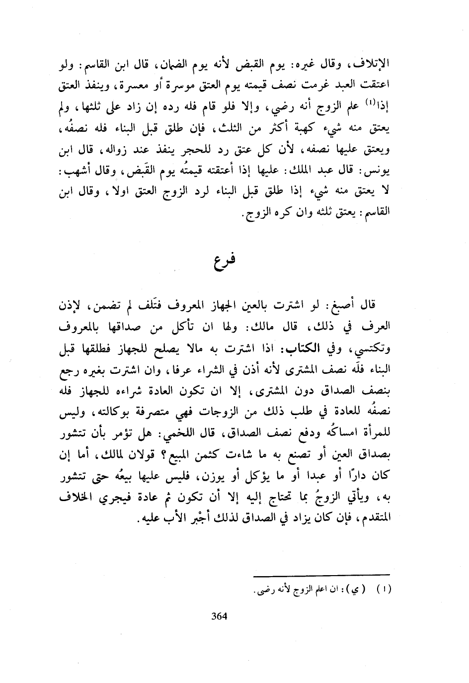 الْإِتْلَافِ وَقَالَ غَيْرُهُ يَوْمَ الْقَبْضِ لِأَنَّهُ يَوْمُ الضَّمَانُ قَالَ ابْنُ الْقَاسِمِ وَلَوْ أَعْتَقَتِ الْعَبْدَ غَرِمَتْ نِصْفَ قِيمَتِهِ يَوْمَ الْعِتْقِ مُوسِرَةً أَوْ معسرة وَينفذ الْعتْق إِذا علم الزَّوْج أَنه رَضِيَ وَإِلَّا فَلَوْ قَامَ فَلَهُ رَدُّهُ إِنْ زَادَ عَلَى ثُلُثِهَا وَلَمْ يُعْتَقْ مِنْهُ شَيْءٌ كَهِبَةِ أَكْثَرِ مِنَ الثُّلُثِ فَإِنْ طَلَّقَ قَبْلَ الْبِنَاءِ فَلَهُ نِصْفُهُ وَيُعْتَقُ عَلَيْهَا نِصْفُهُ لِأَنَّ كُلَّ عِتْقٍ رُدَّ لِلْحَجْرِ يُنَفَّذُ عِنْدَ زَوَالِهِ قَالَ ابْنُ يُونُسَ قَالَ عَبْدُ الْمَلِكِ عَلَيْهَا إِذَا أَعْتَقَتْهُ قِيمَتُهُ يَوْمَ الْقَبْضِ وَقَالَ أَشْهَبُ لَا يُعْتَقُ مِنْهُ شَيْءٌ إِذَا طَلَّقَ قَبْلَ الْبِنَاءِ لِرَدِّ الزَّوْجِ الْعِتْقَ أَوَّلًا وَقَالَ ابْنُ الْقَاسِمِ يُعْتَقُ ثُلُثُهُ وَإِنْ كَرِهَ الزَّوْجُ