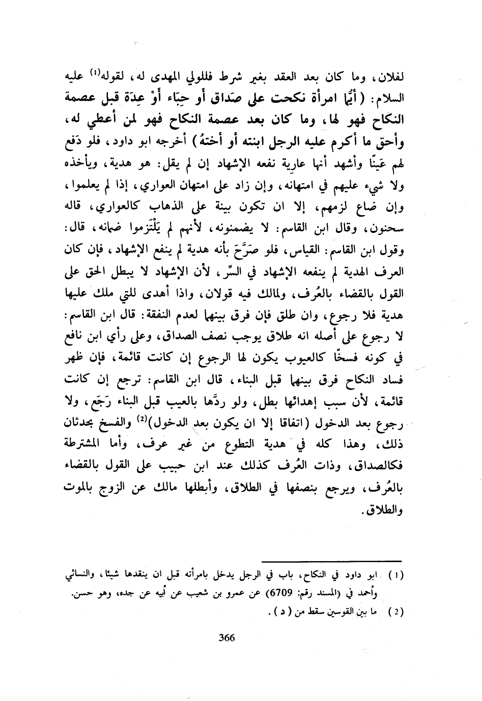 لِفُلَانٍ وَمَا كَانَ بَعْدَ الْعَقْدِ بِغَيْرِ شَرْطٍ فَلِلْوَلِيِّ الْمُهْدَى لَهُ لِقَوْلِهِ عَلَيْهِ السَّلَامُ أَيُّمَا امْرَأَةٍ نُكِحَتْ عَلَى صَدَاقٍ أَوْ حِبَاءٍ أَوْ عِدَةٍ قَبْلَ عِصْمَةِ النِّكَاحِ فَهُوَ لَهَا وَمَا كَانَ بَعْدَ عِصْمَةِ النِّكَاحِ فَهُوَ لِمَنْ أُعْطِيَ لَهُ وَأَحَقُّ مَا أُكْرِمَ عَلَيْهِ الرَّجُلُ ابْنَتُهُ أَو أُخْته أخرجه أَبُو دَاوُدَ فَلَوْ دَفَعَ لَهُمْ عَيْنًا وَأَشْهَدَ أَنَّهَا عَارِيَّةٌ نَفَعَهُ الْإِشْهَادُ إِنْ لَمْ يَقُلْ هُوَ هَدِيَّةٌ وَيَأْخُذُهُ وَلَا شَيْءَ عَلَيْهِمْ فِي امتهانه وَإِن زَاد على امتهان العواري إِذا لَمْ يَعْلَمُوا وَإِنْ ضَاعَ لَزِمَهُمْ إِلَّا أَنْ تَكُونَ بَيِّنَةٌ عَلَى الذَّهَابِ كَالْعَوَارِيِّ قَالَهُ سَحْنُونٌ وَقَالَ ابْنُ الْقَاسِمِ لَا يَضْمَنُونَهُ لِأَنَّهُمْ لَمْ يَلْتَزِمُوا ضَمَانَهُ قَالَ وَقَوْلُ ابْنِ الْقَاسِمِ الْقِيَاسُ فَلَوْ صَرَّحَ بِأَنَّهُ هَدِيَّةٌ لَمْ يَنْفَعِ الْإِشْهَادُ فَإِنْ كَانَ الْعُرْفُ الْهَدِيَّةَ لَمْ يَنْفَعْهُ الْإِشْهَادُ فِي السِّرِّ لِأَنَّ الْإِشْهَادَ لَا يُبْطِلُ الْحَقَّ على القَوْل بِالْقضَاءِ بِالْعرْفِ ولمالك فِيهِ قَولَانِ وَإِذَا أَهْدَى لِلَّتِي مَلَكَ عَلَيْهَا هَدِيَّةً فَلَا رُجُوعَ وَإِنْ طَلَّقَ فَإِنْ فُرِّقَ بَيْنَهُمَا لِعَدَمِ النَّفَقَةِ قَالَ ابْنُ الْقَاسِمِ لَا رُجُوعَ عَلَى أَصْلِهِ أَنَّهُ طَلَاقٌ يُوجِبُ نِصْفَ الصَّدَاقِ وَعَلَى رَأْيِ ابْنِ نَافِعٍ فِي كَوْنِهِ فَسْخًا كَالْعُيُوبِ يَكُونُ لَهَا الرُّجُوعُ إِنْ كَانَتْ قَائِمَةً فَإِنْ ظَهَرَ فَسَادُ النِّكَاحِ فُرِّقَ بَيْنَهُمَا قَبْلَ الْبِنَاءِ قَالَ ابْنُ الْقَاسِمِ تَرْجِعُ إِنْ كَانَتْ قَائِمَةً لِأَنَّ سَبَبَ إِهْدَائِهَا بَطَلَ وَلَوْ رَدَّهَا بِالْعَيْبِ قَبْلَ الْبِنَاءِ رَجَعَ وَلَا رُجُوعَ بَعْدَ الدُّخُولِ اتِّفَاقًا إِلَّا أَنْ يَكُونَ بَعْدَ الدُّخُولِ وَالْفَسْخُ بِحِدْثَانِ ذَلِكَ وَهَذَا كُلُّهُ فِي هَدِيَّةِ التَّطَوُّعِ مِنْ غَيْرِ عُرْفٍ وَأَمَّا الْمُشْتَرَطَةُ فَكَالصَّدَاقِ وَذَاتُ الْعُرْفِ كَذَلِكَ عِنْدَ ابْنِ حَبِيبٍ عَلَى الْقَوْلِ بِالْقَضَاءِ بِالْعُرْفِ وَيَرْجِعُ بِنِصْفِهَا فِي الطَّلَاقِ وَأَبْطَلَهَا مَالِكٌ عَنِ الزَّوْجِ بِالْمَوْتِ وَالطَّلَاقِ