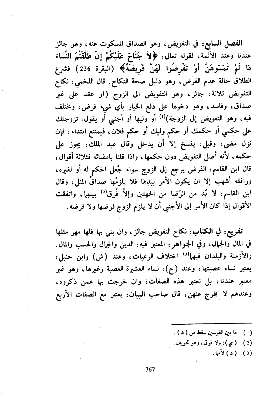 الْفَصْلُ السَّابِعُ فِي التَّفْوِيضِ وَهُوَ الصَّدَاقُ الْمَسْكُوتُ عَنْهُ وَهُوَ جَائِزٌ عِنْدَنَا وَعِنْدَ الْأَئِمَّةِ لِقَوْلِهِ تَعَالَى {لَا جُنَاحَ عَلَيْكُمْ إِنْ طَلَّقْتُمُ النِّسَاءَ مَا لَمْ تَمَسُّوهُنَّ أَوْ تَفْرِضُوا لَهُنَّ فَرِيضَةً} الْبَقَرَة 236 فَشَرَعَ الطَّلَاقَ حَالَةَ عَدَمِ الْفَرْضِ وَهُوَ دَلِيلُ صِحَّةِ النِّكَاحِ قَالَ اللَّخْمِيُّ نِكَاحُ التَّفْوِيضِ ثَلَاثَةٌ جَائِزٌ وَهُوَ التَّفْوِيضُ إِلَى الزَّوْجِ أَوْ عَقْدٌ عَلَى غَيْرِ صَدَاقٍ وَفَاسِدٌ وَهُوَ دُخُولُهَا على دفع الْخِيَار بِأَيّ شَيْء فرض ومختلف فِيهِ وَهُوَ التَّفْوِيضُ إِلَى الزَّوْجَةِ أَوْ وَلِيِّهَا أَو أَجْنَبِيٍّ أَوْ يَقُولَ تَزَوَّجْتُكِ عَلَى حُكْمِي أَوْ حُكْمِكِ أَوْ حُكْمِ وَلِيِّكِ أَوْ حُكْمِ فُلَانٍ فَيَمْتَنِعُ ابْتِدَاءً فَإِنْ نَزَلَ مَضَى وَقِيلَ يُفْسَخُ إِلَّا أَنْ يَدْخُلَ وَقَالَ عَبْدُ الْمَلِكِ يَجُوزُ عَلَى حُكْمِهِ لِأَنَّهُ أَصْلُ التَّفْوِيضِ دُونَ حُكْمِهَا وَإِذَا قُلْنَا بِإِمْضَائِهِ فَثَلَاثَةُ أَقْوَالٍ قَالَ ابْنُ الْقَاسِمِ الْفَرْضُ يَرْجِعُ إِلَى الزَّوْجِ سَوَاءٌ جُعِلَ الحكم لَهُ أَو لغيره ورافقه أَشْهَبُ إِلَّا أَنْ يَكُونَ الْأَمْرُ بِيَدِهَا فَلَا يَلْزَمُهَا صَدَاقُ الْمِثْلِ وَقَالَ ابْنُ الْقَاسِمِ لَا بُدَّ مِنَ الرِّضَا مِنِ الْجِهَتَيْنِ وَإِلَّا فُرِّقَ بَيْنَهُمَا وَاتَّفَقَتِ الْأَقْوَالُ إِذَا كَانَ الْأَمْرُ إِلَى الْأَجْنَبِيّ أَن لَا يَلْزَمَ الزَّوْجَ فَرْضُهَا وَلَا فَرْضُهُ تَفْرِيعٌ فِي الْكِتَابِ نِكَاحُ التَّفْوِيضِ جَائِزٌ وَإِنْ بَنَى بِهَا فَلَهَا مَهْرُ مِثْلِهَا فِي الْمَالِ وَالْجَمَالِ وَفِي الْجَوَاهِرِ الْمُعْتَبَرُ فِيهِ الدِّينُ وَالْجَمَالُ وَالْحَسَبُ وَالْمَالُ والأزمنة والبلدان فيهمَا اخْتِلَافُ الرَّغَبَاتِ وَعِنْدَ ش وَابْنِ حَنْبَلٍ يُعْتَبَرُ نسَاء عصبتها وَعند ح نِسَاءُ الْعَشِيرَةِ الْعَصَبَةِ وَغَيْرِهَا وَهُوَ غَيْرُ مُعْتَبَرٍ عِنْدَنَا بَلْ نَعْتَبِرُ هَذِهِ الصِّفَاتِ وَإِنْ خَرَجَتْ بِهَا عَمَّنْ ذَكَرُوهُ وَعِنْدَهُمْ لَا يَخْرُجُ عَنْهُنَّ قَالَ صَاحِبُ الْبَيَانِ يُعْتَبَرُ مَعَ الصِّفَاتِ الْأَرْبَعِ