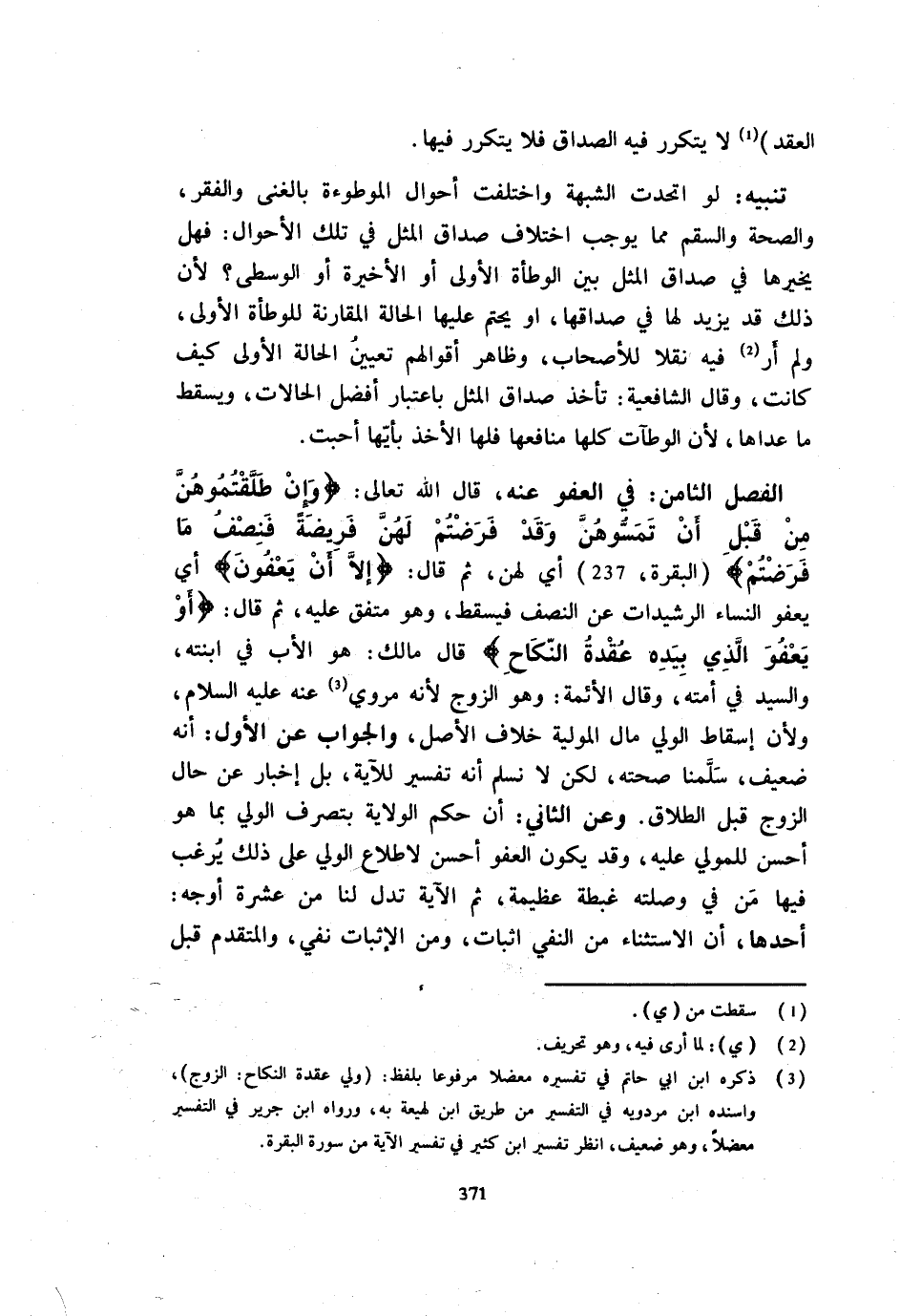 العقد لَا يَتَكَرَّرُ فِيهِ الصَّدَاقُ فَلَا يَتَكَرَّرُ فِيهَا تَنْبِيهٌ لَوِ اتَّحَدَتِ الشُّبْهَةُ وَاخْتَلَفَتْ أَحْوَالُ الْمَوْطُوءَةِ بِالْغِنَى وَالْفَقْرِ وَالصِّحَّةِ وَالسَّقَمِ مِمَّا يُوجِبُ اخْتِلَافَ صدَاق الْمثل فِي تِلْكَ الْأَحْوَال فَهَل يخيرها فِي صَدَاقِ الْمِثْلِ بَيْنَ الْوَطْأَةِ الْأُولَى أَوِ الْأَخِيرَةِ أَوِ الْوُسْطَى لِأَنَّ ذَلِكَ قَدْ يَزِيدُ لَهَا فِي صَدَاقهَا أَو يحتم عَلَيْهَا الْحَالَةَ الْمُقَارِنَةَ لِلْوَطْأَةِ الْأُولَى وَلَمْ أَرَ فِيهِ نقلا للأصحاب وَظَاهر أَقْوَالهم تَعْيِينُ الْحَالَةِ الْأُولَى كَيْفَ كَانَتْ وَقَالَ الشَّافِعِيَّةُ تَأْخُذ صدَاق الْمثل بِاعْتِبَار أفضل الْحَالَات وَيسْقط مَا عَدَاهَا لِأَنَّ الْوَطَآتِ كُلَّهَا مَنَافِعُهَا فَلَهَا الْأَخْذُ بِأَيِّهَا أَحَبَّتْ الْفَصْلُ الثَّامِنُ فِي الْعَفْوِ عَنْهُ قَالَ اللَّهُ تَعَالَى {وَإِنْ طَلَّقْتُمُوهُنَّ مِنْ قَبْلِ أَنْ تَمَسُّوهُنَّ وَقَدْ فَرَضْتُمْ لَهُنَّ فَرِيضَةً فَنِصْفُ مَا فَرَضْتُمْ الْبَقَرَة 237 أَيْ لَهُنَّ ثُمَّ قَالَ {إِلَّا أَن يعفون} أَيْ يَعْفُوَ النِّسَاءُ الرَّشِيدَاتُ عَنِ النِّصْفِ فَيَسْقُطَ وَهُوَ مُتَّفَقٌ عَلَيْهِ ثُمَّ قَالَ {أَوْ يَعْفُوَ الَّذِي بِيَدِهِ عقدَة النِّكَاح} قَالَ مَالِكٌ هُوَ الْأَبُ فِي ابْنَتِهِ وَالسَّيِّدُ فِي أَمَتِهِ وَقَالَ الْأَئِمَّةُ وَهُوَ الزَّوْجُ لِأَنَّهُ مَرْوِيٌّ عَنْهُ عَلَيْهِ السَّلَامُ وَلِأَنَّ إِسْقَاطَ الْوَلِيِّ مَال المولية خِلَافُ الْأَصْلِ وَالْجَوَابُ عَنِ الْأَوَّلِ أَنَّهُ ضَعِيفٌ سَلَّمْنَا صِحَّتَهُ لَكِنْ لَا نُسَلِّمُ أَنَّهُ تَفْسِيرٌ لِلْآيَةِ بَلْ إِخْبَارٌ عَنْ حَالِ الزَّوْجِ قَبْلَ الطَّلَاقِ وَعَنِ الثَّانِي أَنَّ حُكْمَ الْوِلَايَةِ بِتَصَرُّفِ الْوَلِيِّ بِمَا هُوَ أَحْسَنُ لِلْمُوَلَّى عَلَيْهِ وَقَدْ يَكُونُ الْعَفْوُ أَحْسَنَ لِاطِّلَاعِ الْوَلِيِّ عَلَى ذَلِكَ يرغب فِيهَا من فِي وصلته غِبْطَةٌ عَظِيمَةٌ ثُمَّ الْآيَةُ تَدُلُّ لَنَا مِنْ عَشْرَةِ أَوْجُهٍ أَحَدُهَا أَنَّ الِاسْتِثْنَاءَ مِنَ النَّفْيِ إِثْبَات وَمن الْإِثْبَات نفي والمتقدم قبل