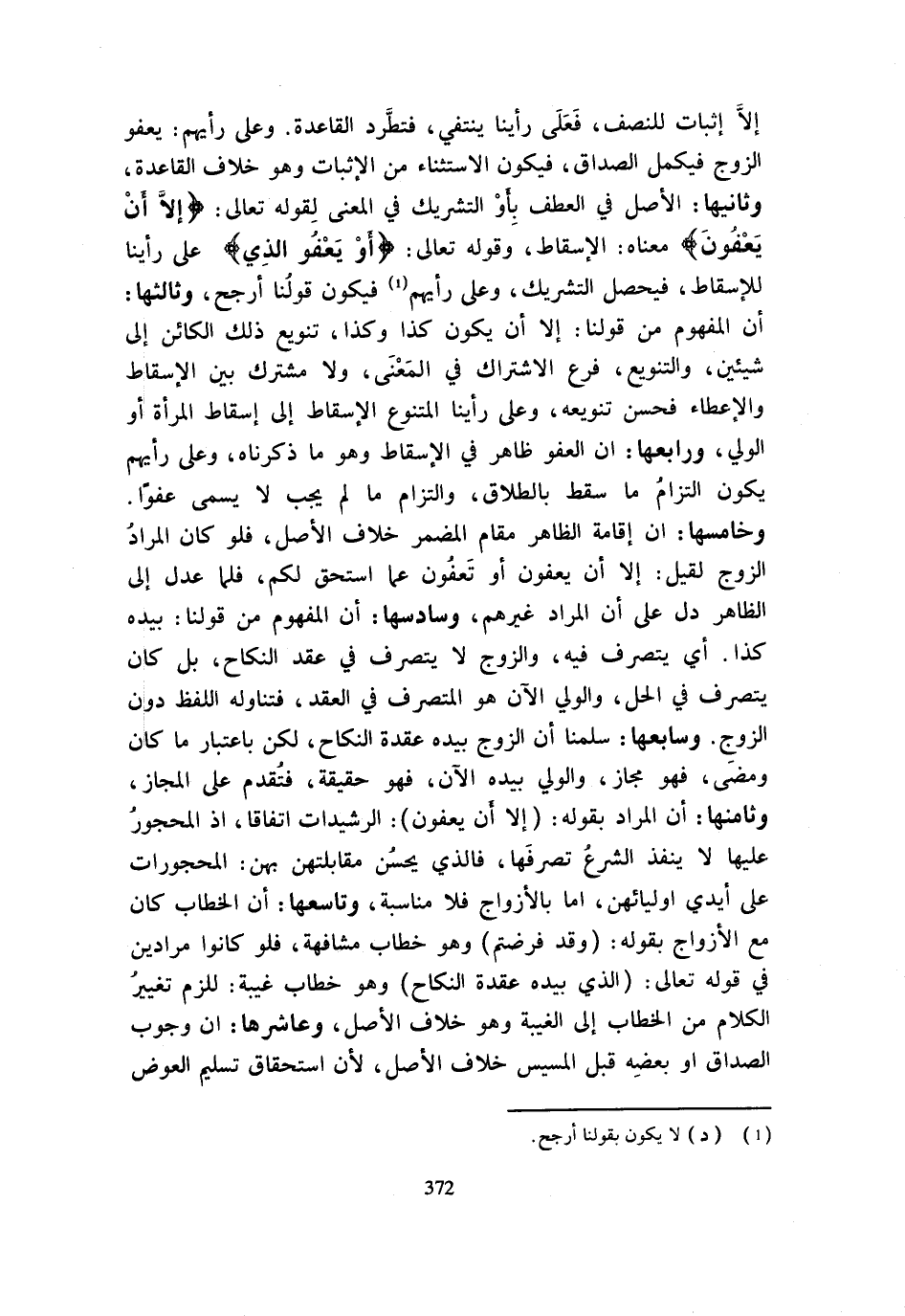 إِلَّا إِثْبَات لِلنِّصْفِ فَعَلَى رَأْيِنَا يَنْتَفِي فَتَطَّرِدُ الْقَاعِدَةُ وَعَلَى رَأْيِهِمْ يَعْفُو الزَّوْجُ فَيُكْمِلُ الصَّدَاقَ فَيَكُونُ الِاسْتِثْنَاءُ مِنَ الْإِثْبَاتِ وَهُوَ خِلَافُ الْقَاعِدَةِ وَثَانِيهَا الْأَصْلُ فِي الْعَطف بِأَو التَّشْرِيك فِي الْمَعْنى لقَوْله تَعَالَى {إِلَّا أَن يعفون} مَعْنَاهُ الْإِسْقَاطُ وقَوْله تَعَالَى {أَوْ يَعْفُوَ الَّذِي} عَلَى رَأْيِنَا لِلْإِسْقَاطِ فَيَحْصُلُ التَّشْرِيكُ وَعَلَى رَأْيِهِمْ فَيَكُونُ قَوْلُنَا أَرْجَحَ وَثَالِثُهَا أَنَّ الْمَفْهُومَ مِنْ قَوْلنَا إِلَّا أَن يكون كَذَا وَكَذَا تَنْوِيعُ ذَلِكَ الْكَائِنِ إِلَى شَيْئَيْنِ وَالتَّنْوِيعُ فَرْعُ الِاشْتِرَاك فِي الْمَعْنى وَلَا مُشْرك بَين الاسقاط والإعطاء فَحسن تَنْوِيعُهُ وَعَلَى رَأْيِنَا الْمُتَنَوِّعُ الْإِسْقَاطُ إِلَى إِسْقَاطِ الْمَرْأَةِ أَوِ الْوَلِيِّ وَرَابِعُهَا أَنَّ الْعَفْوَ ظَاهِرٌ فِي الْإِسْقَاطِ وَهُوَ مَا ذَكَرْنَاهُ وَعَلَى رَأْيِهِمْ يَكُونُ الْتِزَامُ مَا سَقَطَ بِالطَّلَاقِ وَالْتِزَامُ مَا لَمْ يَجِبْ لَا يُسَمَّى عَفْوًا وَخَامِسُهَا أَنَّ إِقَامَةَ الظَّاهِرِ مَقَامَ الْمُضْمَرِ خِلَافُ الْأَصْلِ فَلَوْ كَانَ الْمُرَادُ الزَّوْجَ لَقِيلَ إِلَّا أَنْ يَعْفُونَ أَوْ تَعْفُونَ عَمَّا اسْتُحِقَّ لَكُمْ فَلَمَّا عَدَلَ إِلَى الظَّاهِرِ دَلَّ عَلَى أَنَّ الْمُرَادَ غَيْرُهُمْ وَسَادِسُهَا أَنَّ الْمَفْهُومَ مِنْ قَوْلِنَا بِيَدِهِ كَذَا أَيْ يَتَصَرَّفُ فِيهِ وَالزَّوْجُ لَا يَتَصَرَّفُ فِي عَقْدِ النِّكَاحِ بَلْ كَانَ يَتَصَرَّفُ فِي الْحَلِّ وَالْوَلِيُّ الْآنَ هُوَ الْمُتَصَرِّفُ فِي الْعَقْدِ فَتَنَاوَلَهُ اللَّفْظُ دُونَ الزَّوْجِ وَسَابِعُهَا سَلَّمْنَا أَنَّ الزَّوْجَ بِيَدِهِ عُقْدَةُ النِّكَاحِ لَكِنْ بِاعْتِبَارِ مَا كَانَ وَمَضَى فَهُوَ مُجَازٌ وَالْوَلِيُّ بِيَدِهِ الْآنَ فَهُوَ حَقِيقَة فَتقدم عَلَى الْمَجَازِ وَثَامِنُهَا أَنَّ الْمُرَادَ بِقَوْلِهِ إِلا أَن يعفون الرشيدات اتِّفَاقًا إِذِ الْمَحْجُورُ عَلَيْهَا لَا يُنْفِذُ الشَّرْعُ تَصَرُّفَهَا فَالَّذِي يَحْسُنُ مُقَابَلَتُهُنَّ بِهِنَّ الْمَحْجُورَاتُ عَلَى أَيْدِي أَوْلِيَائِهِنَّ أَمَّا بِالْأَزْوَاجِ فَلَا مُنَاسَبَةَ وَتَاسِعُهَا أَنَّ الْخِطَابَ كَانَ مَعَ الْأَزْوَاجِ بِقَوْلِهِ وَقَدْ فرضتم وَهُوَ خِطَابُ مُشَافَهَةٍ فَلَوْ كَانُوا مُرَادِينَ فِي قَوْله تَعَالَى {الَّذِي بِيَدِهِ عقدَة النِّكَاح} وَهُوَ خِطَابُ غَيْبَةٍ لَلَزِمَ تَغْيِيرُ الْكَلَامِ مِنِ الْخِطَابِ إِلَى الْغَيْبَةِ وَهُوَ خِلَافُ الْأَصْلِ وَعَاشِرُهَا أَنَّ وُجُوبَ الصَّدَاقِ أَوْ بَعْضِهِ قَبْلَ الْمَسِيسِ خِلَافُ الْأَصْلِ لِأَنَّ اسْتِحْقَاقَ تَسْلِيمِ الْعِوَضِ