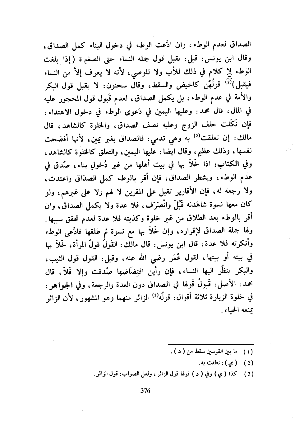 الصَّدَاقِ لِعَدَمِ الْوَطْءِ وَإِنِ ادَّعَتِ الْوَطْءَ فِي دُخُولِ الْبِنَاءِ كَمُلَ الصَّدَاقُ وَقَالَ ابْنُ يُونُسَ قِيلَ يُقْبَلُ قَوْلُ جُمْلَةِ النِّسَاءِ حَتَّى الصَّغِيرَةِ إِذَا بَلَغَتِ الْوَطْءَ لَا كَلَامَ فِي ذَلِكَ لِلْأَبِ وَلَا لِلْوَصِيِّ لِأَنَّهُ لَا يُعْرَفُ إِلَّا مِنَ النِّسَاءِ فَيُقْبَلَ قَوْلُهُنَّ كَالْحَيْضِ وَالسَّقْطِ وَقَالَ سَحْنُونٌ لَا يُقْبَلُ قَوْلُ الْبِكْرِ وَالْأَمَةِ فِي عَدَمِ الْوَطْءِ بَلْ يَكْمُلُ الصَّدَاقُ لِعَدَمِ قَبُولِ قَوْلِ الْمَحْجُورِ عَلَيْهِ فِي الْمَالِ قَالَ مُحَمَّدٌ وَعَلَيْهَا الْيَمِينُ فِي دَعْوَى الْوَطْءِ فِي دُخُولِ الِاهْتِدَاءِ فَإِنْ نَكَلَتْ حَلَفَ الزَّوْجُ وَعَلَيْهِ نِصْفُ الصَّدَاقِ وَالْخَلْوَةُ كَالشَّاهِدِ قَالَ مَالِكٌ إِنْ تَعَلَّقَتْ بِهِ وَهِيَ تُدْمِي فَالصَّدَاقُ بِغَيْرِ يَمِينٍ لِأَنَّهَا أفضحت نَفْسَهَا وَذَلِكَ عَظِيمٌ وَقَالَ أَيْضًا عَلَيْهَا الْيَمِينُ والتعلق كالخلوة كَالشَّاهِدِ وَفِي الْكِتَابِ إِذَا خَلَا بِهَا فِي بَيْتِ أَهْلِهَا مِنْ غَيْرِ دُخُولِ بِنَاءٍ صَدَقَ فِي عدم الْوَطْء ويشطر الصَّدَاقُ فَإِنْ أَقَرَّ بِالْوَطْءِ كَمُلَ الصَّدَاقُ وَاعْتَدَّتْ وَلَا رَجْعَةَ لَهُ فَإِنَّ الْأَقَارِيرَ تُقْبَلُ عَلَى الْمُقِرِّينِ لَا لَهُمْ وَلَا عَلَى غَيْرِهِمْ وَلَوْ كَانَ مَعَهَا نِسْوَةٌ شَاهَدْنَهُ قَبْلُ وَانْصَرَفَ فَلَا عِدَّةَ وَلَا يَكْمُلُ الصَّدَاقُ وَإِنْ أَقَرَّ بِالْوَطْءِ بَعْدَ الطَّلَاقِ مِنْ غَيْرِ خَلْوَةٍ وَكَذَّبَتْهُ فَلَا عِدَّةَ لِعَدَمِ تَحَقُّقِ سَبَبِهَا وَلَهَا جُمْلَةُ الصَّدَاقِ لِإِقْرَارِهِ وَإِنْ خَلَا بِهَا مَعَ نِسْوَةٍ ثُمَّ طَلَّقَهَا فَادَّعَى الْوَطْءَ وَأَنْكَرَتْهُ فَلَا عِدَّةَ قَالَ ابْنُ يُونُسَ قَالَ مَالِكٌ الْقَوْلُ قَوْلُ الْمَرْأَةِ خَلَا بِهَا فِي بَيْتِهِ أَوْ بَيْتِهَا لِقَوْلِ عُمَرَ رَضِيَ اللَّهُ عَنْهُ وَقِيلَ الْقَوْلُ قَوْلُ الثَّيِّبِ وَالْبِكْرُ يَنْظُرُ إِلَيْهَا النِّسَاءُ فَإِنْ رَأَيْنَ افْتِضَاضَهَا صُدِّقَتْ وَإِلَّا فَلَا قَالَ مُحَمَّدٌ الْأَصْلُ قَبُولُ قَوْلِهَا فِي الصَّدَاقِ دُونَ الْعِدَّةِ وَالرَّجْعَةِ وَفِي الْجَوَاهِرِ فِي خَلْوَةِ الزِّيَارَةِ ثَلَاثَةُ أَقْوَالٍ قَوْله الزَّائِرُ مِنْهُمَا وَهُوَ الْمَشْهُورُ لِأَنَّ الزَّائِرَ يَمْنَعُهُ الْحيَاء