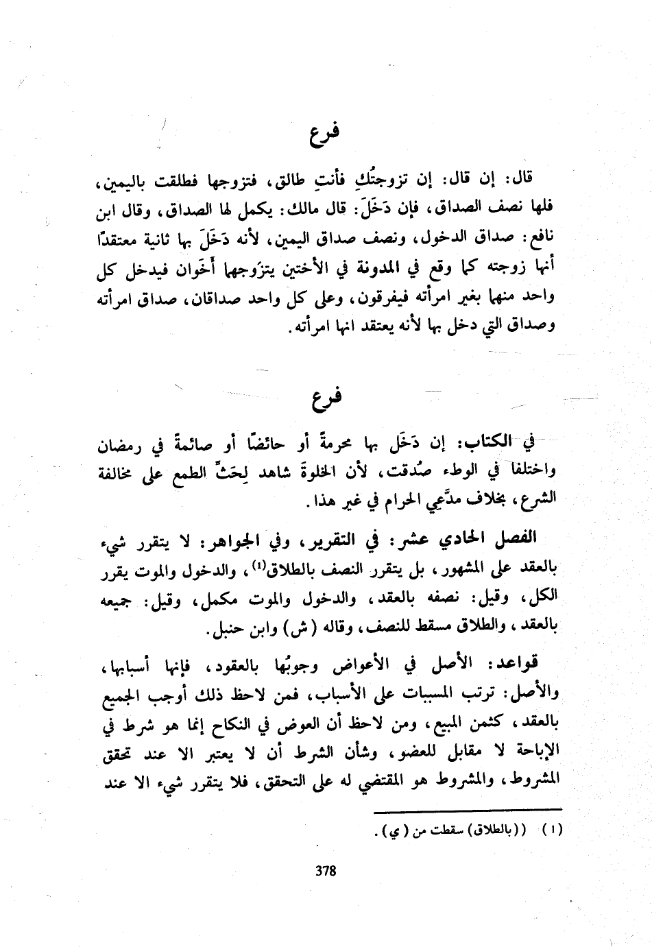 فِي الْكِتَابِ إِن دَخَلَ بِهَا مُحْرِمَةً أَوْ حَائِضًا أَوْ صَائِمَةً فِي رَمَضَانَ وَاخْتَلَفَا فِي الْوَطْءِ صُدِّقَتْ لِأَنَّ الْخَلْوَةَ شَاهِدٌ لِحَثِّ الطَّمَعِ عَلَى مُخَالَفَةِ الشَّرْعِ بِخِلَافِ مُدَّعِي الْحَرَامِ فِي غَيْرِ هَذَا الْفَصْلُ الْحَادِي عَشَرَ فِي التَّقْرِيرِ وَفِي الْجَوَاهِرِ لَا يَتَقَرَّرُ شَيْءٌ بِالْعَقْدِ عَلَى الْمَشْهُورِ بَلْ يَتَقَرَّرُ النِّصْفُ بِالطَّلَاقِ وَالدُّخُولِ وَالْمَوْتُ يُقَرِّرُ الْكُلَّ وَقِيلَ نِصْفُهُ بِالْعَقْدِ وَالدُّخُولِ وَالْمَوْتُ مُكَمِّلٌ وَقِيلَ جَمِيعُهُ بِالْعقدِ وَالطَّلَاق مسْقط لِلنِّصْفِ وَقَالَهُ ش وَابْنُ حَنْبَلٍ قَوَاعِدُ الْأَصْلُ فِي الْأَعْوَاضِ وُجُوبُهَا بِالْعُقُودِ فَإِنَّهَا أَسْبَابُهَا وَالْأَصْلُ تَرَتُّبُ الْمُسَبَّبَاتِ عَلَى الْأَسْبَابِ فَمَنْ لَاحَظَ ذَلِكَ أَوْجَبَ الْجَمِيع بِالْعقدِ كَثمن الْمَبِيع وَمَنْ لَاحَظَ أَنَّ الْعِوَضَ فِي النِّكَاحِ إِنَّمَا هُوَ شَرْطٌ فِي الْإِبَاحَةِ لَا مُقَابِلٌ لِلْعُضْوِ وشأن الشَّرْط أَن لَا يُعْتَبَرَ إِلَّا عِنْدَ تَحَقُّقِ الْمَشْرُوطِ وَالْمَشْرُوطُ هُوَ الْمُقْتَضِي لَهُ عَلَى التَّحَقُّقُ فَلَا يَتَقَرَّرُ شَيْءٌ إِلَّا عِنْد