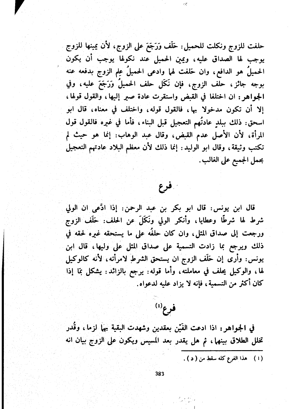 حَلَفَتْ لِلزَّوْجِ وَنَكَلَتْ لِلْحَمِيلِ حَلَفَ وَرَجَعَ عَلَى الزَّوْجِ لِأَنَّ يَمِينَهَا لِلزَّوْجِ يُوجِبُ لَهَا الصَّدَاقَ عَلَيْهِ وَيَمِينُ الْحَمِيلِ عِنْدَ نُكُولِهَا يُوجِبُ أَنْ يَكُونَ الْحَمِيلُ هُوَ الدَّافِعَ وَإِنْ حَلَفَتْ لَهُمَا وَادَّعَى الْحَمِيلُ عِلْمَ الزَّوْجِ بِدَفْعِهِ عَنْهُ بِوَجْهٍ جَائِزٍ حَلَفَ الزَّوْجُ فَإِنْ نَكَلَ حَلَفَ الْحَمِيلُ وَرَجَعَ عَلَيْهِ وَفِي الْجَوَاهِرِ إِنِ اخْتَلَفَا فِي الْقَبْضِ وَاسْتَقَرَّتْ عَادَةٌ صِيرَ إِلَيْهَا وَالْقَوْلُ قَوْلُهَا إِلَّا أَنْ تَكُونَ مَدْخُولًا بِهَا فَالْقَوْلُ قَوْلُهُ وَاخْتلف فِي مَعْنَاهُ قَالَ أَبُو اسحق ذَلِكَ بِبَلَدٍ عَادَتُهُمُ التَّعْجِيلُ قَبْلَ الْبِنَاءِ فَأَمَّا فِي غَيْرِهِ فَالْقَوْلُ قَوْلُ الْمَرْأَةِ لِأَنَّ الْأَصْلَ عَدَمُ الْقَبْضِ وَقَالَ عَبْدُ الْوَهَّابِ إِنَّمَا هُوَ حَيْثُ لَمْ تُكْتَبْ وَثِيقَةٌ وَقَالَ أَبُو الْوَلِيدِ إِنَّمَا ذَلِكَ لِأَنَّ مُعْظَمَ الْبِلَادِ عَادَتُهُمُ التَّعْجِيلُ بِحَمْلِ الْجَمِيعِ عَلَى الْغَالِبِ