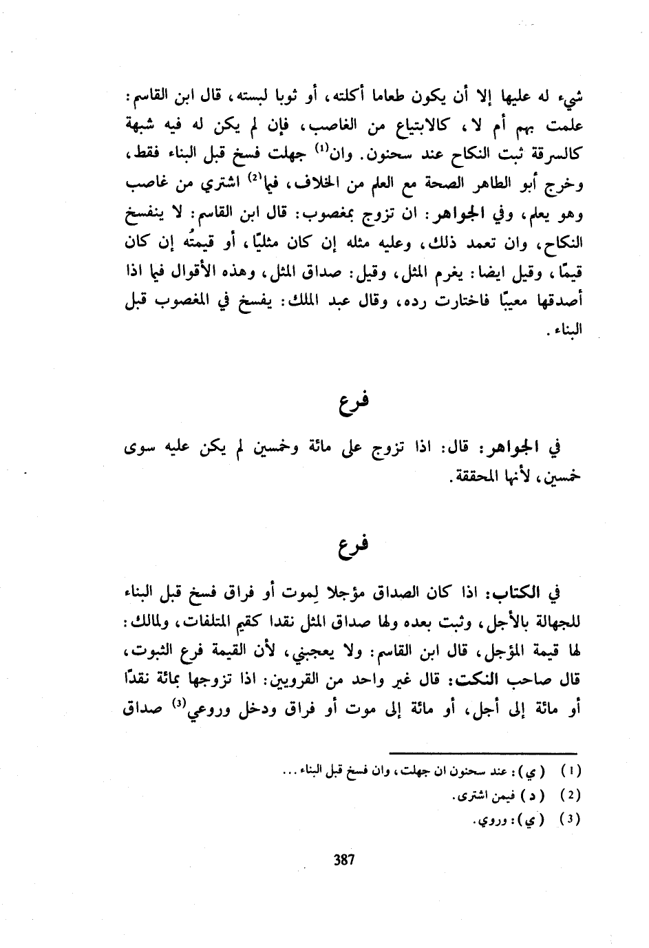 شَيْءَ لَهُ عَلَيْهَا إِلَّا أَنْ يَكُونَ طَعَامًا أَكَلَتْهُ أَوْ ثَوْبًا لَبِسَتْهُ قَالَ ابْنُ الْقَاسِمِ عَلِمَتْ بِهِمْ أَمْ لَا كَالِابْتِيَاعِ مِنَ الْغَاصِبِ فَإِن لم يكن لَهُ فِيهِ شُبْهَةٌ كَالسَّرِقَةِ ثَبَتَ النِّكَاحُ عِنْدَ سَحْنُونٍ وَإِنْ جَهِلَتْ فُسِخَ قَبْلَ الْبِنَاءِ فَقَطْ وَخَرَّجَ أَبُو الطَّاهِرِ الصِّحَّةَ مَعَ الْعِلْمِ مِنَ الْخِلَافِ فِيمَا اشْترى مِنْ غَاصِبٍ وَهُوَ يَعْلَمُ وَفِي الْجَوَاهِرِ إِنْ تَزَوَّجَ بِمَغْصُوبٍ قَالَ ابْنُ الْقَاسِمِ لَا يَنْفَسِخُ النِّكَاحُ وَإِنْ تَعَمَّدَ ذَلِكَ وَعَلَيْهِ مِثْلُهُ إِنْ كَانَ مِثْلِيًّا أَوْ قِيمَتُهُ إِنْ كَانَ قيمًا وَقيل أَيْضا يغرم الْمِثْلَ وَقِيلَ صَدَاقَ الْمِثْلِ وَهَذِهِ الْأَقْوَالُ فِيمَا إِذَا أَصْدَقَهَا مَعِيبًا فَاخْتَارَتْ رَدَّهُ وَقَالَ عَبْدُ الْمَلِكِ يُفْسَخُ فِي الْمَغْصُوبِ قَبْلَ الْبِنَاءِ