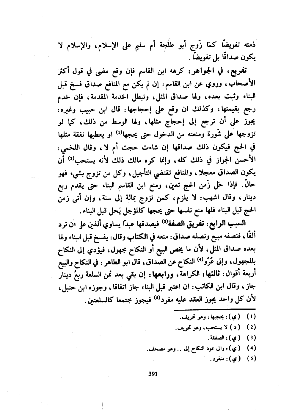 ذمَّته تفويضا كَمَا زوج أَبُو طَلْحَةَ أُمَّ سُلَيْمٍ عَلَى الْإِسْلَامِ وَالْإِسْلَامُ لَا يَكُونُ صَدَاقًا بَلْ تَفْوِيضًا تَفْرِيعٌ فِي الْجَوَاهِرِ كَرِهَهُ ابْنُ الْقَاسِمِ فَإِنْ وَقَعَ مَضَى فِي قَوْلِ أَكْثَرِ الْأَصْحَابِ وَرُوِيَ عَنِ ابْنِ الْقَاسِمِ إِنْ لَمْ يَكُنْ مَعَ الْمَنَافِعِ صَدَاقٌ فُسِخَ قَبْلَ الْبِنَاءِ وَثَبَتَ بَعْدَهُ وَلَهَا صَدَاقُ الْمِثْلِ وَتَبْطُلُ الْخِدْمَةُ الْمُقَدَّمَةُ فَإِنْ خَدَمَ رَجَعَ بِقِيمَتِهَا وَكَذَلِكَ إِن وَقع على إحجاجها قَالَ ابْنُ حَبِيبٍ وَغَيْرُهُ يَجُوزُ عَلَى أَنْ تَرْجِعَ إِلَى إِحْجَاجِ مِثْلِهَا وَلَهَا الْوَسَطُ مِنْ ذَلِكَ كَمَا لَوْ تَزَوَّجَهَا عَلَى شَوْرَةٍ وَمَنَعَتْهُ مِنَ الدُّخُول حَتَّى يحجها أَوْ يُعْطِيَهَا نَفَقَةَ مِثْلِهَا فِي الْحَجِّ فَيَكُونَ ذَلِكَ صَدَاقَهَا إِنْ شَاءَتْ حَجَّتْ أَمْ لَا وَقَالَ اللَّخْمِيُّ الْأَحْسَنُ الْجَوَازُ فِي ذَلِكَ كُلِّهِ وَإِنَّمَا كَرِهَ مَالِكٌ ذَلِكَ لِأَنَّهُ يَسْتَحِبُّ أَنْ يَكُونَ الصَّدَاقُ مُعَجَّلًا وَالْمَنَافِعُ تَقْتَضِي التَّأْجِيلَ وَكُلُّ من تزوج بِشَيْء فَهُوَ حَال فَإِذا حل زَمَنُ الْحَجِّ تَعَيَّنَ وَمَنَعَ ابْنُ الْقَاسِمِ الْبِنَاءَ حَتَّى يُقَدِّمَ رُبُعَ دِينَارٍ وَقَالَ أَشْهَبُ لَا يَلْزَمُ كَمَنْ تَزَوَّجَ بِمِائَةٍ إِلَى سَنَةٍ وَإِنْ أَتَى زَمَنُ الْحَجِّ قَبْلَ الْبِنَاءِ فَلَهَا مَنْعُ نَفْسِهَا حَتَّى يُحِجَّهَا كَالْمُؤَجَّلِ يَحِلُّ قَبْلَ الْبِنَاءِ السَّبَبُ الرَّابِعُ تَفْرِيقُ الصِّفَةِ فَيُصْدِقُهَا عَبْدًا يُسَاوِي أَلْفَيْنِ عَلَى أَنْ تَرُدَّ أَلْفًا فَنِصْفُهُ مَبِيعٌ وَنِصْفُهُ صَدَاقٌ مَنَعَهُ فِي الْكِتَابِ وَقَالَ يُفْسَخُ قَبْلَ الْبِنَاءِ وَلَهَا بَعْدَهُ صَدَاقُ الْمِثْلِ لِأَنَّ مَا يَخُصُّ الْبَيْعَ أَوِ النِّكَاحَ مَجْهُولٌ فَيُؤَدِّي إِلَى النِّكَاحِ بِالْمَجْهُولِ وَإِلَى عُرُوِّ النِّكَاحِ عَنِ الصَّدَاقِ قَالَ أَبُو الطَّاهِرِ فِي النِّكَاحِ وَالْبَيْعِ أَرْبَعَةُ أَقْوَالٍ ثَالِثُهَا الْكَرَاهَةُ وَرَابِعُهَا إِنْ بَقِيَ بعد ثمن السَّبْعَة رُبُعُ دِينَارٍ جَازَ وَقَالَ ابْنُ الْكَاتِبِ إِنِ اعْتُبِرَ قَبْلَ الْبِنَاءِ جَازَ اتِّفَاقًا وَجَوَّزَهُ ابْنُ حَنْبَلٍ لِأَنَّ كُلَّ وَاحِدٍ يَجُوزُ الْعَقْدُ عَلَيْهِ مُفْرد فَيَجُوزُ مُجْتَمِعًا كَالسِّلْعَتَيْنِ
