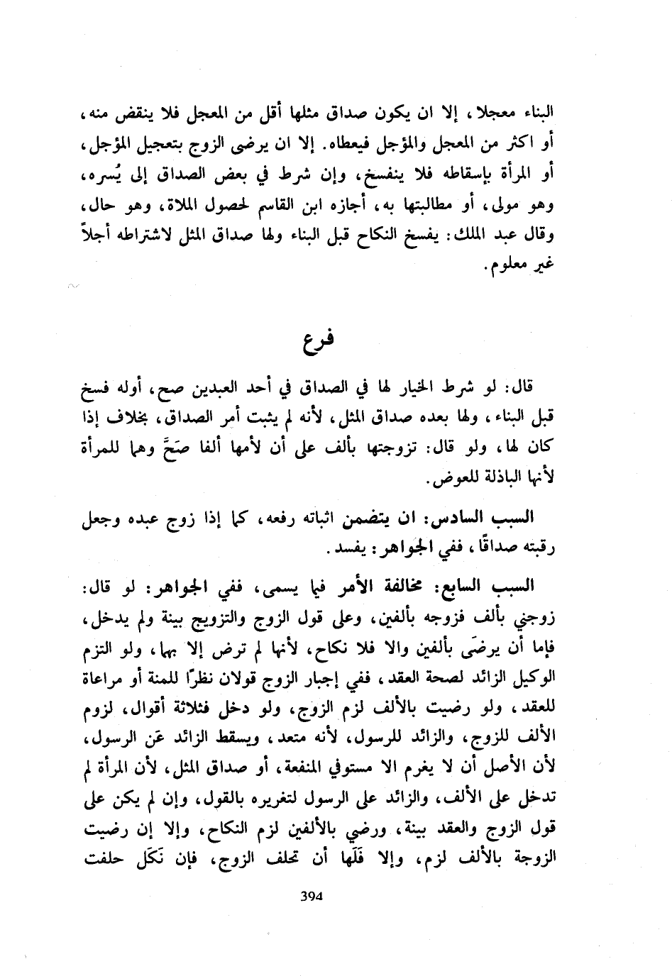 قَالَ لَوْ شَرَطَ الْخِيَارَ لَهَا فِي الصَّدَاقِ فِي أَحَدِ الْعَبْدَيْنِ صَحَّ أَوله فَسْخٌ قَبْلَ الْبِنَاءِ وَلَهَا بَعْدَهُ صَدَاقُ الْمِثْلِ لِأَنَّهُ لَمْ يَثْبُتْ أَمْرُ الصَّدَاقِ بِخِلَافِ إِذَا كَانَ لَهَا وَلَوْ قَالَ تَزَوَّجْتُهَا بِأَلْفٍ عَلَى أَنَّ لِأُمِّهَا أَلْفًا صَحَّ وَهُمَا لِلْمَرْأَةِ لِأَنَّهَا الْبَاذِلَةُ لِلْعِوَضِ السَّبَبُ السَّادِسُ أَنْ يَتَضَمَّنَ إِثْبَاتُهُ رَفَعَهُ كَمَا إِذَا زَوَّجَ عَبَدَهُ وَجَعَلَ رَقَبَتَهُ صَدَاقًا فَفِي الْجَوَاهِرِ يَفْسُدُ السَّبَبُ السَّابِعُ مُخَالَفَةُ الْأَمْرِ فِيمَا يُسَمَّى فَفِي الْجَوَاهِرِ لَوْ قَالَ زَوِّجْنِي بِأَلْفٍ فَزَوَّجَهُ بِأَلْفَيْنِ وَعَلَى قَوْلِ الزَّوْجِ وَالتَّزْوِيجُ بَيِّنَةٌ وَلَمْ يَدْخُلْ فَإِمَّا أَنْ يَرْضَى بِأَلْفَيْنِ وَإِلَّا فَلَا نِكَاحَ لِأَنَّهَا لَمْ تَرْضَ إِلَّا بِهِمَا وَلَوِ الْتَزَمَ الْوَكِيلُ الزَّائِدَ لِصِحَّةِ الْعَقْدِ فَفِي إِجْبَارِ الزَّوْجِ قَوْلَانِ نَظَرًا لِلْمِنَّةِ أَو مُرَاعَاة للْعقد وَلَو رضيت بِالْألف لَزِمَ الزَّوْجَ وَلَوْ دَخَلَ فَثَلَاثَةُ أَقْوَالٍ لُزُومُ الْأَلْفِ لِلزَّوْجِ وَالزَّائِدُ لِلرَّسُولِ لِأَنَّهُ مُتَعَدٍّ وَيَسْقُطُ الزَّائِدُ عَنِ الرَّسُولِ لِأَنَّ الْأَصْلَ أَنْ لَا يُغَرَّمَ إِلَّا مُسْتَوْفِي الْمَنْفَعَةِ أَوْ صَدَاقِ الْمِثْلِ لِأَنَّ الْمَرْأَةَ لَمْ تَدْخُلْ عَلَى الْأَلْفِ وَالزَّائِدُ عَلَى الرَّسُولِ لِتَغْرِيرِهِ بِالْقَوْلِ وَإِنْ لَمْ يَكُنْ عَلَى قَوْلِ الزَّوْجِ وَالْعَقْدِ بَيِّنَةٌ وَرَضِيَ بِالْأَلْفَيْنِ لَزِمَ النِّكَاحُ وَإِلَّا إِنْ رَضِيَتِ الزَّوْجَةُ بِالْأَلْفِ لَزِمَ وَإِلَّا فَلَهَا أَنْ تُحَلِّفَ الزَّوْجَ فَإِنْ نكل حَلَفت