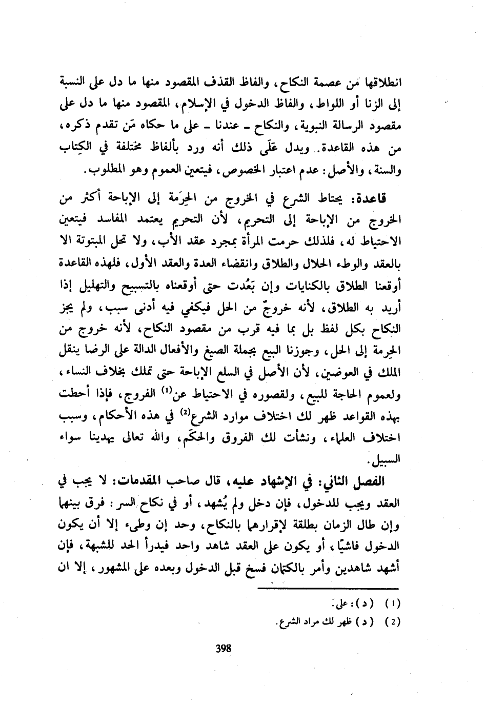 انْطِلَاقِهَا مِنْ عِصْمَةِ النِّكَاحِ وَأَلْفَاظُ الْقَذْفِ الْمَقْصُودُ مِنْهَا مَا دَلَّ عَلَى النِّسْبَةِ إِلَى الزِّنَا أَوِ اللِّوَاطِ وَأَلْفَاظُ الدُّخُولِ فِي الْإِسْلَامِ الْمَقْصُودُ مِنْهَا مَا دَلَّ عَلَى مَقْصُودِ الرِّسَالَةِ النَّبَوِيَّةِ وَالنِّكَاحُ عِنْدَنَا عَلَى مَا حَكَاهُ مَنْ تَقَدَّمَ ذِكْرُهُ مِنْ هَذِهِ الْقَاعِدَةِ وَيَدُلُّ عَلَى ذَلِكَ أَنَّهُ وَرَدَ بِأَلْفَاظٍ مُخْتَلِفَةٍ فِي الْكِتَابِ وَالسُّنَّةِ وَالْأَصْلُ عَدَمُ اعْتِبَارِ الْخُصُوصِ فَيَتَعَيَّنُ الْعُمُومُ وَهُوَ الْمَطْلُوبُ قَاعِدَةٌ يَحْتَاطُ الشَّرْعُ فِي الْخُرُوجِ مِنَ الْحُرْمَةِ إِلَى الْإِبَاحَةِ أَكْثَرَ مِنَ الْخُرُوجِ مِنِ الْإِبَاحَةِ إِلَى التَّحْرِيمِ لِأَنَّ التَّحْرِيمَ يَعْتَمِدُ الْمَفَاسِدَ فَيتَعَيَّن الِاحْتِيَاط لَهُ فَلذَلِك حُرِّمَتِ الْمَرْأَةُ بِمُجَرَّدِ عَقْدِ الْأَبِ وَلَا تَحِلُّ الْمَبْتُوتَةُ إِلَّا بِالْعَقْدِ وَالْوَطْءِ الْحَلَالِ وَالطَّلَاقِ وَانْقِضَاءِ الْعدة وَالْعقد الْأَوَّلِ فَلِهَذِهِ الْقَاعِدَةِ أَوْقَعَنَا الطَّلَاقَ بِالْكِنَايَاتِ وَإِنْ بَعُدَتْ حَتَّى أَوْقَعْنَاهُ بِالتَّسْبِيحِ وَالتَّهْلِيلِ إِذَا أُرِيدَ بِهِ الطَّلَاقُ لِأَنَّهُ خُرُوجٌ مِنَ الْحِلِّ فَيَكْفِي فِيهِ أَدْنَى سَبَبٍ وَلَمْ يَجُزِ النِّكَاحُ بِكُلِّ لَفْظٍ بَلْ بِمَا فِيهِ قُرْبٌ مِنْ مَقْصُودِ النِّكَاحِ لِأَنَّهُ خُرُوجٌ مِنَ الْحُرْمَةِ إِلَى الْحِلِّ وَجَوَّزْنَا الْبَيْعَ بِجُمْلَةِ الصِّيَغِ وَالْأَفْعَالِ الدَّالَّةِ عَلَى الرِّضَا ينْقل الْمِلْكِ فِي الْعِوَضَيْنِ لِأَنَّ الْأَصْلَ فِي السِّلَعِ الْإِبَاحَة حَتَّى تملك بِخِلَاف النِّسَاء ولعموم الْحَاجة للْبيع ولقصوره فِي الِاحْتِيَاط عَن الْفُرُوجِ فَإِذَا أَحَطْتَ بِهَذِهِ الْقَوَاعِدِ ظَهَرَ لَكَ اخْتِلَاف موارد الشَّرْعِ فِي هَذِهِ الْأَحْكَامِ وَسَبَبُ اخْتِلَافِ الْعُلَمَاءِ وَنَشَأَتْ لَكَ الْفُرُوقُ وَالْحِكَمُ وَاللَّهُ تَعَالَى يَهْدِينَا سَوَاء السَّبِيل الْفَصْلُ الثَّانِي فِي الْإِشْهَادِ عَلَيْهِ قَالَ صَاحِبُ الْمُقدمَات لَا يجب فِي العقد وَيجب للدخول فَإِنْ دَخَلَ وَلَمْ يُشْهِدْ أَوْ فِي نِكَاحِ السِّرّ فُرِّقَ بَيْنَهُمَا وَإِنْ طَالَ الزَّمَانُ بِطَلْقَةٍ لِإِقْرَارِهِمَا بِالنِّكَاحِ وَحُدَّ إِنْ وَطِئَ إِلَّا أَنْ يَكُونَ الدُّخُولُ فَاشِيًا أَوْ يَكُونَ عَلَى الْعَقْدِ شَاهِدٌ وَاحِدٌ فَيُدْرَأَ الْحَدُّ لِلشُّبْهَةِ فَإِنْ أَشْهَدَ شَاهِدَيْنِ وَأَمَرَ بِالْكِتْمَانِ فُسِخَ قَبْلَ الدُّخُولِ وَبَعْدَهُ عَلَى الْمَشْهُورِ إِلَّا أَنْ