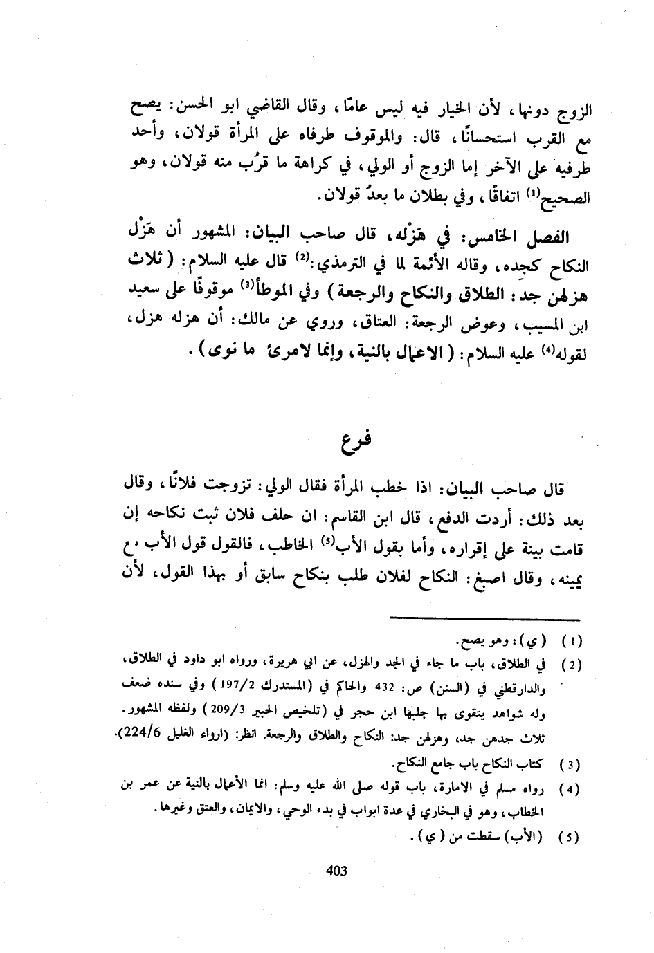 الزَّوْجِ دُونَهَا لِأَنَّ الْخِيَارَ فِيهِ لَيْسَ عَامًّا وَقَالَ الْقَاضِي أَبُو الْحَسَنِ يَصِحُّ مَعَ الْقُرْبِ اسْتِحْسَانًا قَالَ وَالْمَوْقُوفُ طَرَفَاهُ عَلَى الْمَرْأَةِ قَوْلَانِ وَأَحَدُ طَرَفَيْهِ عَلَى الْآخَرِ إِمَّا الزَّوْجُ أَوِ الْوَلِيّ فِي كَرَاهَةِ مَا قَرُبَ مِنْهُ قَوْلَانِ وَهُوَ الصَّحِيحُ اتِّفَاقًا وَفِي بُطْلَانِ مَا بَعْدُ قَوْلَانِ الْفَصْلُ الْخَامِسُ فِي هَزْلِهِ قَالَ صَاحِبُ الْبَيَانِ الْمَشْهُورُ أَنْ هَزْلَ النِّكَاحِ كَجِدِّهِ وَقَالَهُ الْأَئِمَّةُ لِمَا فِي التِّرْمِذِيِّ قَالَ عَلَيْهِ السَّلَامُ ثَلَاثٌ هَزْلُهُنَّ جِدٌّ الطَّلَاقُ وَالنِّكَاحُ وَالرَّجْعَةُ وَفِي الْمُوَطَّأِ مَوْقُوفًا على سعيد ابْن الْمُسَيِّبِ وَعِوَضُ الرَّجْعَةِ الْعِتَاقُ وَرُوِيَ عَنْ مَالِكٍ أَنَّ هَزْلَهُ هَزْلٌ لِقَوْلِهِ عَلَيْهِ السَّلَامُ الْأَعْمَالُ بِالنِّيَّةِ وَإِنَّمَا لامرئ مَا نَوَى