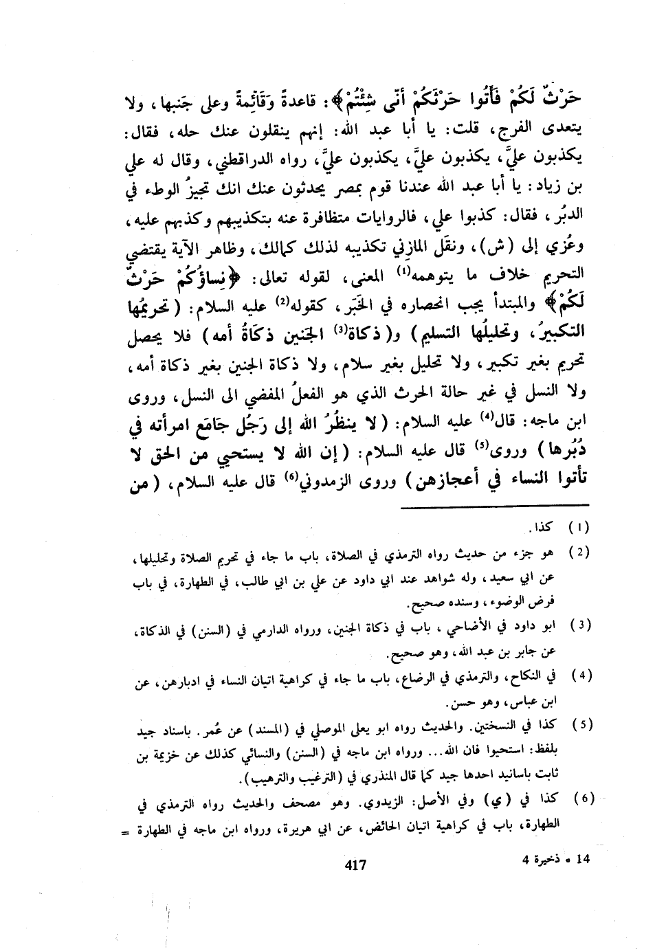 حرث لكم فَأتوا حَرْثكُمْ أَنى شِئْتُم} قَاعِدَة وقائمة وعَلى جنبها وَلَا يَتَعَدَّى الْفَرْجَ قُلْتُ يَا أَبَا عَبْدِ اللَّهِ إِنَّهُمْ يَنْقُلُونَ عَنْكَ حِلَّهُ فَقَالَ يَكْذِبُونَ عَلَيَّ يَكْذِبُونَ عَلَيَّ يَكْذِبُونَ عَلَيَّ رَوَاهُ الدَّارَقُطْنِيُّ وَقَالَ لَهُ عَلِيُّ بْنُ زِيَادٍ يَا أَبَا عَبْدِ اللَّهِ عِنْدَنَا قَوْمٌ بِمِصْرَ يُحَدِّثُونَ عَنْكَ أَنَّكَ تُجِيزُ الْوَطْءَ فِي الدُّبُرِ فَقَالَ كَذَبُوا عَلَيَّ فَالرِّوَايَاتُ مُتَظَافِرَةٌ عَنْهُ بِتَكْذِيبِهِمْ وَكَذِبِهِمْ عَلَيْهِ وَعُزِيَ إِلَى ش وَنَقَلَ الْمَازِنِيُّ تَكْذِيبَهُ لِذَلِكَ كَمَالِكٍ وَظَاهِرُ الْآيَةِ يَقْتَضِي التَّحْرِيمَ خِلَافَ مَا يَتَوَهَّمُهُ الْمَعْنَى لِقَوْلِهِ تَعَالَى {نِسَاؤُكُمْ حَرْثٌ لَكُمْ} وَالْمُبْتَدَأُ يَجِبُ انْحِصَارُهُ فِي الْخَبَرِ كَقَوْلِهِ عَلَيْهِ السَّلَام تَحْرِيمهَا التَّكْبِير وتحليلها التَّسْلِيم وذكاة الْجَنِينِ ذَكَاةُ أُمِّهِ فَلَا يَحْصُلُ تَحْرِيمٌ بِغَيْرِ تَكْبِيرٍ وَلَا تَحْلِيلٌ بِغَيْرِ سَلَامٍ وَلَا ذَكَاةُ الْجَنِينِ بِغَيْرِ ذَكَاةِ أُمِّهِ وَلَا النَّسْلُ فِي غَيْرِ حَالَةِ الْحَرْثِ الَّذِي هُوَ الْفِعْلُ الْمُفْضِي إِلَى النَّسْلِ وَرَوَى ابْنُ مَاجَهْ قَالَ عَلَيْهِ السَّلَامُ لَا يَنْظُرُ اللَّهُ إِلَى رَجُلٍ جَامَعَ امْرَأَتَهُ فِي دُبُرِهَا وَرُوِيَ قَالَ عَلَيْهِ السَّلَامُ إِن الله لايستحي مِنَ الْحَقِّ لَا تَأْتُوا النِّسَاءَ فِي أَعْجَازِهِنَّ وروى الزمدوني قَالَ عَلَيْهِ السَّلَامُ مَنْ