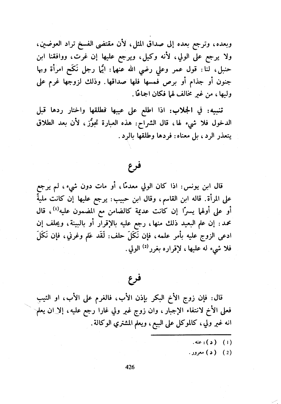 وَبَعْدَهُ وَتَرْجِعُ بَعْدَهُ إِلَى صَدَاقِ الْمِثْلِ لِأَنَّ مُقْتَضَى الْفَسْخِ تَرَادُّ الْعِوَضَيْنِ وَلَا يَرْجِعُ عَلَى الْوَلِيِّ لِأَنَّهُ وَكِيلٌ وَيَرْجِعُ عَلَيْهَا إِنْ غَرَّتْ وَوَافَقَنَا ابْنُ حَنْبَلٍ لَنَا قَوْلُ عُمَرَ وَعَلِيٍّ رَضِيَ اللَّهُ عَنْهُمَا أَيُّمَا رَجُلٍ نَكَحَ امْرَأَةً وَبِهَا جُنُونٌ أَوْ جُذَامٌ أَوْ بَرَصٌ فَمَسَّهَا فَلَهَا صَدَاقُهَا وَذَلِكَ لِزَوْجِهَا غُرْمٌ عَلَى وَلِيِّهَا مِنْ غَيْرِ مُخَالِفٍ لَهُمَا فَكَانَ إِجْمَاعًا تَنْبِيهٌ فِي الْجُلَّابِ إِذَا اطَّلَعَ عَلَى عَيْبِهَا فَطَلَّقَهَا وَاخْتَارَ رَدَّهَا قَبْلَ الدُّخُولِ فَلَا شَيْءَ لَهَا قَالَ الشُّرَّاحُ هَذِهِ الْعِبَارَةُ تَجُوزُ لِأَنَّ بَعْدَ الطَّلَاقِ يَتَعَذَّرُ الرَّدُّ بَلْ مَعْنَاهُ فَرَدَّهَا وَطَلَّقَهَا بِالرَّدِّ