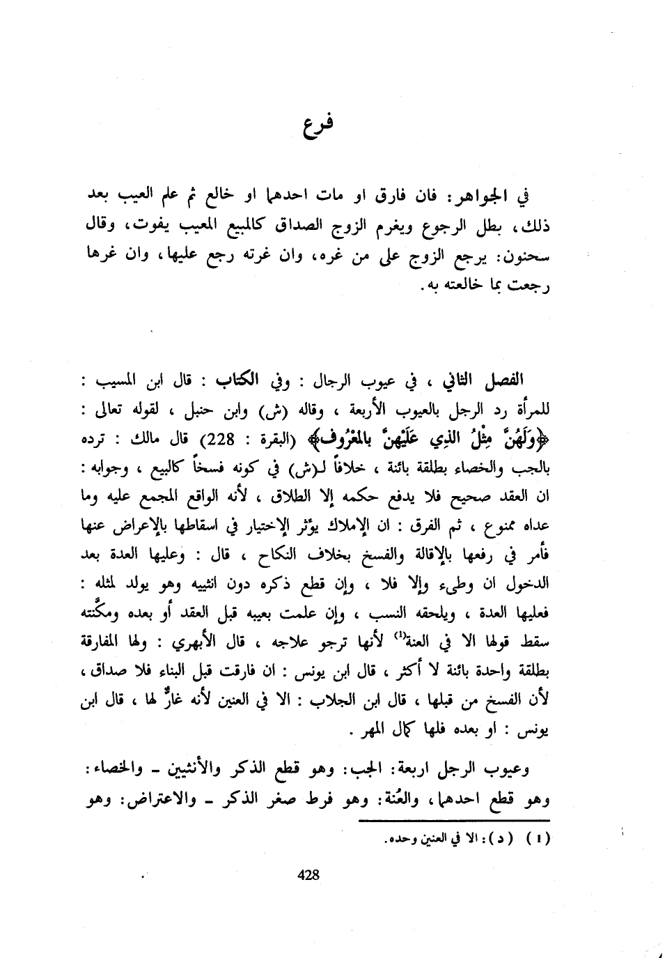 فِي الْجَوَاهِرِ فَإِنْ فَارَقَ أَوْ مَاتَ أَحَدُهُمَا أَوْ خَالَعَ ثُمَّ عُلِمَ الْعَيْبُ بَعْدَ ذَلِكَ بَطَلَ الرُّجُوعُ وَيُغَرَّمُ الزَّوْجُ الصَّدَاقَ كَالْمَبِيعِ الْمَعِيب يَفُوتُ وَقَالَ سَحْنُونٌ يَرْجِعُ الزَّوْجُ عَلَى مَنْ غَرَّهُ وَإِنْ غَرَّتْهُ رَجَعَ عَلَيْهَا وَإِنْ غَرَّهَا رجعت بِمَا خَالَعَتْهُ بِهِ الْفَصْلُ الثَّانِي فِي عُيُوبِ الرِّجَالِ وَفِي الْكِتَابِ قَالَ ابْنُ الْمُسَيِّبِ لِلْمَرْأَةِ رَدُّ الرَّجُلِ بِالْعُيُوبِ الْأَرْبَعَةِ وَقَالَهُ ش وَابْنُ حَنْبَلٍ لِقَوْلِهِ تَعَالَى {وَلَهُنَّ مِثْلُ الَّذِي عَلَيْهِنَّ بِالْمَعْرُوفِ} الْبَقَرَة 228 قَالَ مَالِكٌ تَرُدُّهُ بِالْجَبِّ وَالْخِصَاءِ بِطَلْقَةٍ بَائِنَةٍ خِلَافًا لِ ش فِي كَوْنِهِ فَسْخًا كَالْبَيْعِ وَجَوَابُهُ أَنَّ الْعَقْدَ صَحِيحٌ فَلَا يدْفع حكمه إِلَّا الطَّلَاق لِأَنَّهُ الْوَاقِع الْمُجْمَعُ عَلَيْهِ وَمَا عَدَاهُ مَمْنُوعٌ ثُمَّ الْفَرْقُ أَنَّ الْأمْلَاكَ يُؤْثِرُ الِاخْتِيَارَ فِي إِسْقَاطِهَا بِالْإِعْرَاضِ عَنْهَا فَأُمِرَ فِي رَفْعِهَا بِالْإِقَالَةِ وَالْفَسْخِ بِخِلَافِ النِّكَاحِ قَالَ وَعَلَيْهَا الْعِدَّةُ بَعْدَ الدُّخُولِ إِنْ وَطِئَ وَإِلَّا فَلَا وَإِنْ قَطَعَ ذَكَرَهُ دُونَ أُنْثَيَيْهِ وَهُوَ يُولَدُ لِمِثْلِهِ فَعَلَيْهَا الْعِدَّةُ وَيَلْحَقُهُ النَّسَبُ وَإِنْ عَلِمَتْ بِعَيْبِهِ قَبْلَ الْعَقْدِ أَوْ بعده ومكنته سقط قَوْلهَا إِلَّا فِي الْعنَّة لِأَنَّهَا تَرْجُو عِلَاجَهُ قَالَ الْأَبْهَرَيُّ وَلَهَا الْمُفَارَقَةُ بِطَلْقَةٍ وَاحِدَةٍ بَائِنَةٍ لَا أَكْثَرَ قَالَ ابْنُ يُونُسَ إِنْ فَارَقَتْ قَبْلَ الْبِنَاءِ فَلَا صَدَاقَ لِأَنَّ الْفَسْخَ مِنْ قِبَلِهَا قَالَ ابْنُ الْجَلَّابِ إِلَّا فِي الْعِنِّينِ لِأَنَّهُ غَارٌّ لَهَا قَالَ ابْنُ يُونُسَ أَوْ بَعْدَهُ فَلَهَا كَمَالُ الْمَهْرِ وَعُيُوبُ الرَّجُلِ أَرْبَعَةٌ الْجَبُّ وَهُوَ قَطْعُ الذَّكَرِ والأنثيين والخصاء وَهُوَ قطع أَحدهمَا وَالْعُنَّةُ وَهُوَ فَرْطُ صِغَرِ الذَّكَرِ وَالِاعْتِرَاضُ وَهُوَ