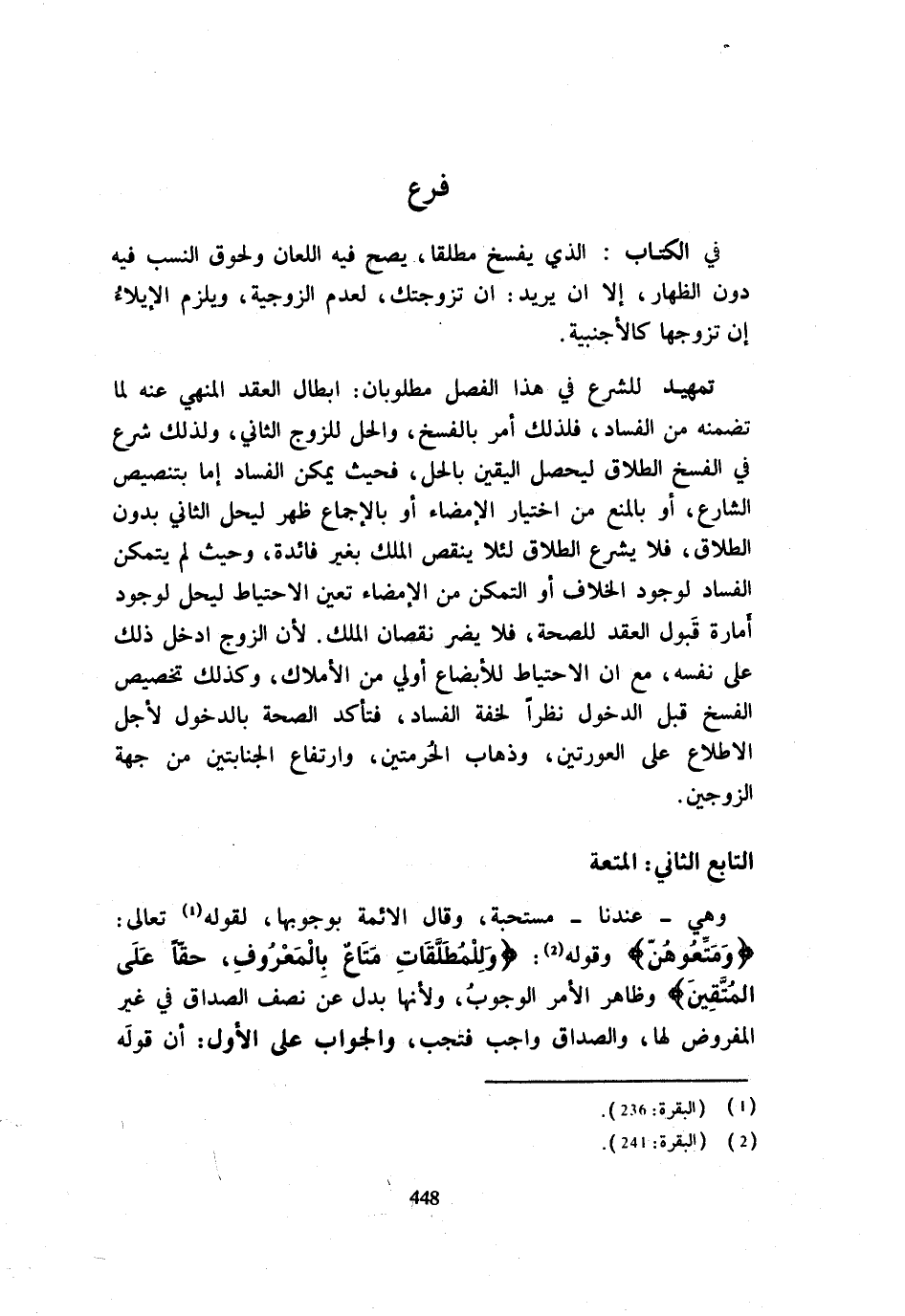 فِي الْكِتَابِ الَّذِي يُفْسَخُ مُطْلَقًا يَصِحُّ فِيهِ اللِّعَانُ وَلُحُوقُ النَّسَبِ فِيهِ دُونَ الظِّهَارِ إِلَّا أَنْ يُرِيدَ إِنْ تَزَوَّجْتُكِ لِعَدَمِ الزَّوْجِيَّةِ وَيَلْزَمُ الْإِيلَاءُ إِنْ تَزَوَّجَهَا كَالْأَجْنَبِيَّةِ تَمْهِيدٌ لِلشَّرْعِ فِي هَذَا الْفَصْلِ مَطْلُوبَانِ إِبْطَالُ الْعَقْدِ الْمَنْهِيِّ عَنْهُ لِمَا تَضَمَّنَهُ مِنَ الْفَسَادِ فَلِذَلِكَ أُمِرَ بِالْفَسْخِ وَالْحِلُّ لِلزَّوْجِ الثَّانِي وَلِذَلِكَ شُرِعَ فِي الْفَسْخِ الطَّلَاقُ لِيَحْصُلَ الْيَقِينُ بِالْحِلِّ فَحَيْثُ يُمْكِنُ الْفَسَادُ إِمَّا بِتَنْصِيصِ الشَّارِعِ أَوْ بِالْمَنْعِ مِنِ اخْتِيَارِ الْإِمْضَاءِ أَوْ بِالْإِجْمَاعِ ظَهَرَ لِيَحِلَّ الثَّانِي بِدُونِ الطَّلَاقِ فَلَا يُشْرَعُ الطَّلَاقُ لِئَلَّا يَنْقُصَ الْمِلْكُ بِغَيْرِ فَائِدَةٍ وَحَيْثُ لَمْ يَتَمَكَّنِ الْفَسَادُ لِوُجُودِ الْخِلَافِ أَوِ التَّمَكُّنِ مِنَ الْإِمْضَاءِ تَعَيَّنَ الِاحْتِيَاطُ لِيَحِلَّ لِوُجُودِ أَمَارَةِ قَبُولِ الْعَقْدِ لِلصِّحَّةِ فَلَا يَضُرُّ نُقْصَانُ الْمِلْكِ لِأَنَّ الزَّوْجَ أَدْخَلَ ذَلِكَ عَلَى نَفْسِهِ مَعَ أَنَّ الِاحْتِيَاطَ لِلأبْضَاعِ أَوْلَى مِنَ الْأَمْلَاكِ وَكَذَلِكَ تَخْصِيصُ الْفَسْخِ قَبْلَ الدُّخُولِ نَظَرًا لِخِفَّةِ الْفَسَادِ فَتَأَكَّدَ الصِّحَّةُ بِالدُّخُولِ لِأَجْلِ الِاطِّلَاعِ عَلَى الْعَوْرَتَيْنِ وَذَهَابِ الْحُرْمَتَيْنِ وَارْتِفَاعِ الْجَنَابَتَيْنِ مِنْ جِهَةِ الزَّوْجَيْنِ