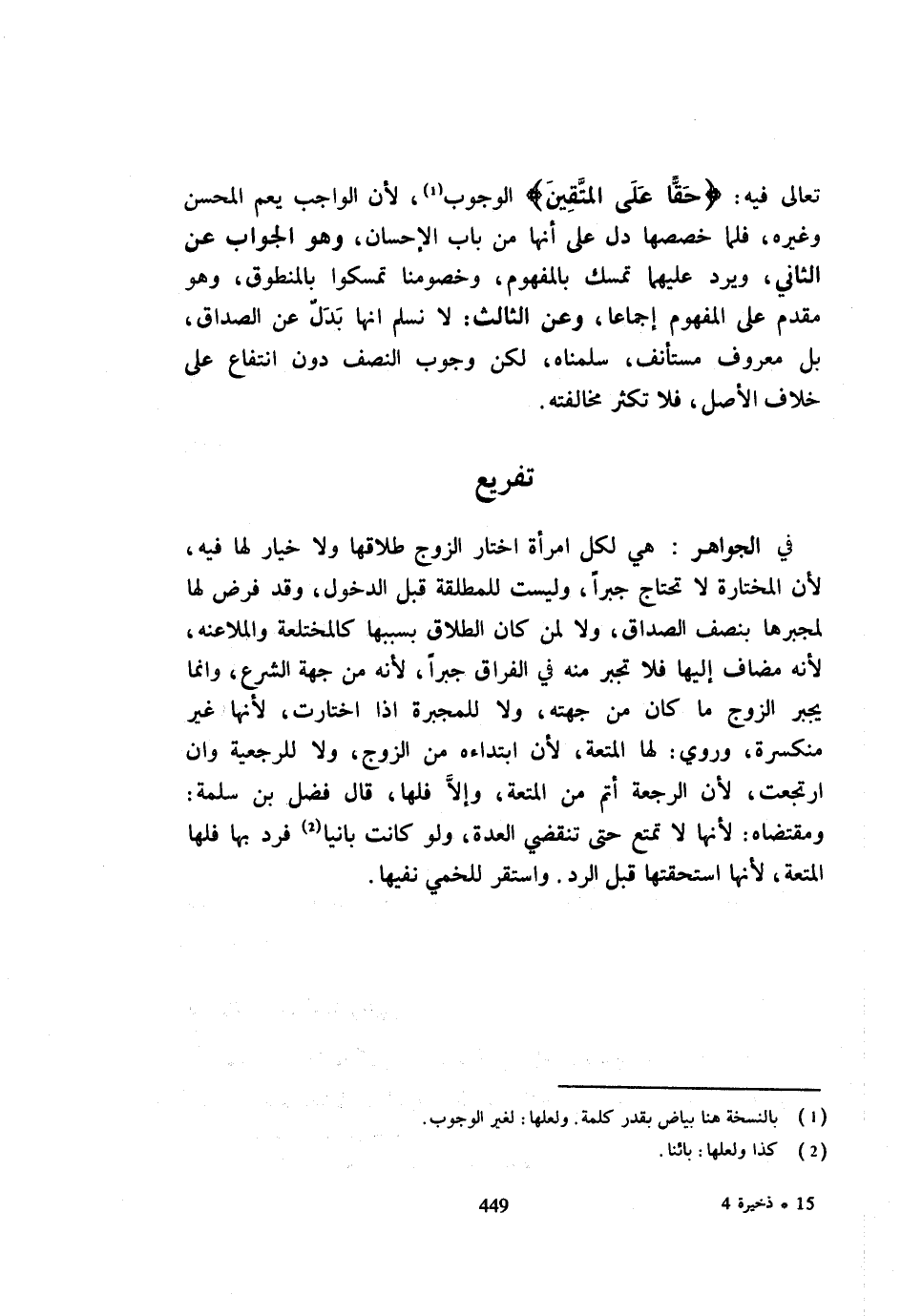 تَعَالَى فِيهِ {حَقًا على الْمُتَّقِينَ} الْوُجُوبُ لِأَنَّ الْوَاجِبَ يَعُمُّ الْمُحْسِنَ وَغَيْرَهُ فَلَمَّا خَصَّصَهَا دَلَّ عَلَى أَنَّهَا مِنْ بَابِ الْإِحْسَانِ وَهُوَ الْجَوَابُ عَنِ الثَّانِي وَيَرِدُ عَلَيْهِمَا تَمَسُّكٌ بِالْمَفْهُومِ وَخُصُومُنَا تَمَسَّكُوا بِالْمَنْطُوقِ وَهُوَ مُقَدَّمٌ عَلَى الْمَفْهُومِ إِجْمَاعًا وَعَنِ الثَّالِثِ لَا نُسَلِّمُ أَنَّهَا بَدَلٌ عَنِ الصَّدَاقِ بَلْ مَعْرُوفٌ مُسْتَأْنَفٌ سَلَّمْنَاهُ لَكِنَّ وُجُوبَ النِّصْفِ دُونَ انْتِفَاعٍ عَلَى خِلَافِ الْأَصْلِ فَلَا تَكْثُرُ مُخَالَفَتُهُ