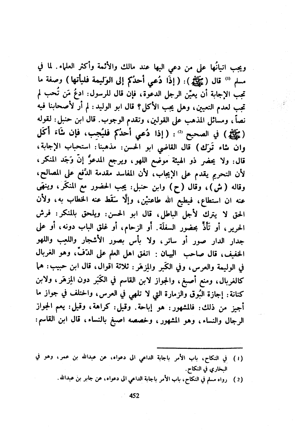 وَيَجِبُ إِتْيَانُهَا عَلَى مَنْ دُعِيَ إِلَيْهَا عِنْدَ مَالِكٍ وَالْأَئِمَّةِ وَأَكْثَرِ الْعُلَمَاءِ لِمَا فِي مُسْلِمٍ قَالَ - صَلَّى اللَّهُ عَلَيْهِ وَسَلَّم َ - إِذَا دُعِيَ أَحَدُكُمْ إِلَى الْوَلِيمَةِ فَلْيَأْتِهَا وَصِفَةُ مَا تَجِبُ الْإِجَابَةُ أَنْ يُعَيِّنَ الرَّجُلُ الدَّعْوَةَ فَإِنْ قَالَ لِلرَّسُولِ ادْعُ مَنْ تُحِبُّ لَمْ تَجِبْ لِعَدَمِ التَّعْيِينِ وَهَلْ يَجِبُ الْأَكْلُ قَالَ أَبُو الْوَلِيدِ لَمْ أَرَ لِأَصْحَابِنَا فِيهِ نَصًّا وَمَسَائِلُ الْمَذْهَبِ عَلَى الْقَوْلَيْنِ وَتَقَدَّمَ الْوُجُوبُ قَالَ ابْنُ حَنْبَلٍ لِقَوْلِهِ - صَلَّى اللَّهُ عَلَيْهِ وَسَلَّم َ - فِي الصَّحِيحِ إِذَا دُعِيَ أَحَدُكُمْ فَلْيُجِبْ فَإِنْ شَاءَ أَكَلَ وَإِنْ شَاءَ تَرَكَ قَالَ الْقَاضِي أَبُو الْحَسَنِ مَذْهَبُنَا اسْتِحْبَابُ الْإِجَابَةِ قَالَ وَلَا يَحْضُرُ ذُو الْهَيْئَةِ مَوْضِعَ اللَّهْوِ وَيَرْجِعُ الْمَدْعُوُّ إِنْ وَجَدَ الْمُنْكَرَ لِأَنَّ التَّحْرِيمَ يُقَدَّمُ عَلَى الْإِيجَابِ لِأَنَّ الْمَفَاسِدَ مُقَدَّمَةُ الدَّفْعِ عَلَى الْمَصَالِحِ وَقَالَهُ ش وَقَالَ ح وَابْنُ حَنْبَلٍ يَجِبُ الْحُضُورُ مَعَ الْمُنْكَرِ وَيَنْهَى عَنْهُ إِنِ اسْتَطَاعَ فَيُطِيعُ اللَّهَ طَاعَتَيْنِ وَإِلَّا سَقَطَ عَنْهُ الْخِطَابُ بِهِ وَلِأَنَّ الْحَقَّ لَا يُتْرَكُ لِأَجْلِ الْبَاطِلِ قَالَ أَبُو الْحَسَنِ وَيَلْحَقُ بِالْمُنْكَرِ فَرْشُ الْحَرِيرِ أَوْ تَأَذٍّ بِحُضُورِ السِّفْلَةِ أَوِ الزِّحَامُ أَوْ غَلْقُ الْبَابِ دُونَهُ أَوْ عَلَى جِدَارِ الدَّارِ صُوَرٌ أَوْ سَاتِرٌ وَلَا بَأْسَ بِصُوَرِ الْأَشْجَارِ وَاللَّعِبِ وَاللَّهْوِ الْخَفِيفِ قَالَ صَاحِبُ الْبَيَانِ اتَّفَقَ أَهْلُ الْعِلْمِ عَلَى الدُّفِّ وَهُوَ الْغِرْبَالُ فِي الْوَلِيمَةِ وَالْعُرْسِ وَفِي الْكَبَرِ وَالْمِزْهَرِ ثَلَاثَةُ أَقْوَالٍ قَالَ ابْنُ حَبِيبٍ هُمَا كَالْغِرْبَالِ وَمَنَعَ أَصْبَغُ وَالْجَوَازُ لِابْنِ الْقَاسِمِ فِي الْكَبَرِ دُونَ الْمِزْهَرِ وَلِابْنِ كِنَانَةَ إِجَازَةُ الْبُوقِ وَالزِّمَارَةِ الَّتِي لَا تُلْهِي فِي الْعُرْسِ وَاخْتُلِفَ فِي جَوَازِ مَا أُجِيزَ مِنْ ذَلِكَ فَالْمَشْهُورُ هُوَ إِبَاحَةٌ وَقِيلَ كَرَاهَةٌ وَقِيلَ يَعُمُّ الْجَوَازُ الرِّجَالَ وَالنِّسَاءَ وَهُوَ الْمَشْهُورُ وَخَصَّصَهُ أَصْبَغُ بِالنِّسَاءِ قَالَ ابْنُ الْقَاسِمِ