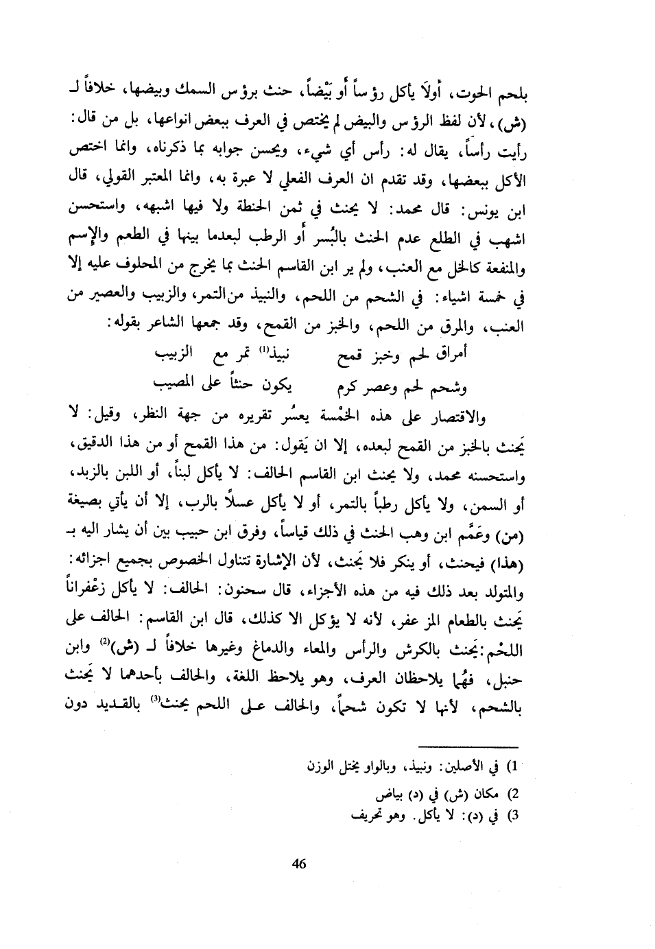 (وَشَحْمُ لَحْمٍ وَعَصْرُ كَرْمٍ ... يَكُونُ حِنْثًا عَلَى الْمُصِيبِ)