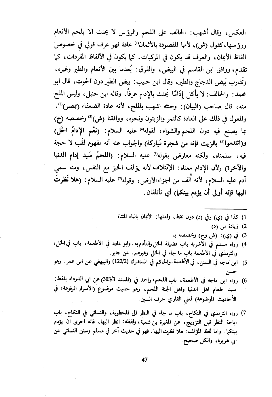 الْعَكْس وَقَالَ أَشهب الْحَالِف على اللَّحْم والرؤس لَا يَحْنَث إِلَّا بِلَحْم الْأَنْعَام ورؤسها كَقَوْلِ ش لِأَنَّهَا الْمَقْصُودَةُ بِالْأَثْمَانِ عَادَةً فَهُوَ عُرْفٌ قَوْلِيٌّ فِي خُصُوصِ أَلْفَاظِ الْأَيْمَانِ وَالْعُرْفُ قَدْ يَكُونُ فِي الْمُرَكَّبَاتِ كَمَا يَكُونُ فِي الْأَلْفَاظِ الْمُفْرَدَاتِ كَمَا تَقَدَّمَ وَوَافَقَ ابْنَ الْقَاسِمِ فِي الْبيض وَالْفرق بَعْدَمَا بَيْنَ الْأَنْعَامِ وَالطَّيْرِ وَغَيْرِهِ وَتَقَارُبُ بَيْضِ الدَّجَاجِ وَالطَّيْرِ وَقَالَ ابْنُ حَبِيبٍ بَيْضُ الطَّيْرِ دُونَ الْحُوتِ قَالَ أَبُو مُحَمَّدٍ وَالْحَالِفُ لَا يَأْكُلُ إِدَامًا يَحْنَثُ بِالْإِدَامِ عُرْفًا وَقَالَهُ ابْنُ حَنْبَلٍ وَلَيْسَ الْمِلْحُ مِنْهُ قَالَ صَاحِبُ الْبَيَانِ وَحَنَّثَهُ أَشْهَبُ بِالْمِلْحِ لِأَنَّهُ عَادَةُ الضُّعَفَاءِ بِمِصْرَ وَالْمُعَوَّلُ فِي ذَلِكَ عَلَى الْعَادَةِ كَالتَّمْرِ وَالزَّيْتُونِ وَنَحْوِهِ وَوَافَقَنَا ش وَخَصَّصَهُ ح بِمَا يُصْنَعُ فِيهِ دُونَ اللَّحْمِ وَالشِّوَاءِ لِقَوْلِهِ عَلَيْهِ السَّلَامُ نِعْمَ الإدام الْخلّ وائتدموا بِالزَّيْتِ فَإِنَّهُ مِنْ شَجَرَةٍ مُبَارَكَةٍ وَالْجَوَابُ عَنْهُ أَنه مَفْهُوم لقب لَا حجَّة فِيهِ سلمناه وَلكنه معَارض بقوله عَلَيْهِ السَّلَام الحم سَيِّدُ إِدَامِ الدُّنْيَا وَالْآخِرَةِ وَلِأَنَّ الْإِدَامَ مَعْنَاهُ الِائْتِلَافُ لِأَنَّهُ يُؤَلِّفُ الْخُبْزَ مَعَ النَّفْسِ وَمِنْهُ سُمِّيَ آدَمُ عَلَيْهِ السَّلَامُ لِأَنَّهُ أُلِّفَ مِنْ أَجْزَاءِ الْأَرْضِ وَقَوْلُهُ عَلَيْهِ السَّلَامُ هَلَّا نَظَرْتَ إِلَيْهَا فَإِنَّهُ أَوْلَى أَنْ يُؤْدَمَ بَيْنَكُمَا أَيْ تأتلفان