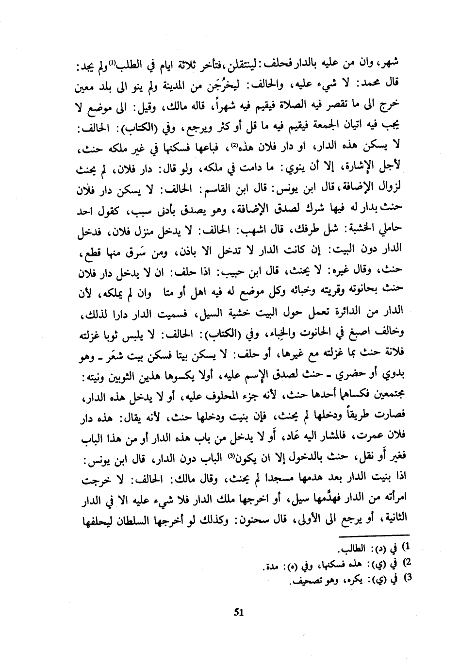 شَهْرٍ وَإِنْ مَنَّ عَلَيْهِ بِالدَّارِ فَحَلَفَ لَيَنْتَقِلَنَّ فَتَأَخَّرَ ثَلَاثَةَ أَيَّامٍ فِي الطَّلَبِ وَلَمْ يَجِدْ قَالَ مُحَمَّدٌ لَا شَيْءَ عَلَيْهِ وَالْحَالِفُ لَيَخْرُجَنَّ من الْمَدِينَة وَلم ينْو إِلَى بلد معِين خَرَجَ إِلَى مَا تُقْصَرُ فِيهِ الصَّلَاةُ فَيُقِيمُ فِيهِ شهرا قَالَ مَالِكٌ وَقِيلَ إِلَى مَوْضِعٍ لَا يَجِبُ فِيهِ إِتْيَانُ الْجُمُعَةِ فَيُقِيمُ فِيهِ مَا قَلَّ أَوْ كَثُرَ وَيَرْجِعُ وَفِي الْكِتَابِ الْحَالِفُ لَا يَسْكُنُ هَذِهِ الدَّارَ أَوْ دَارَ فُلَانٍ هَذِهِ فَبَاعَهَا فَسَكَنَهَا فِي غَيْرِ مِلْكِهِ حَنِثَ لِأَجْلِ الْإِشَارَةِ إِلَّا أَنْ يَنْوِيَ مَا دَامَتْ فِي مِلْكِهِ وَلَوْ قَالَ دَارَ فُلَانٍ لَمْ يَحْنَثْ لِزَوَالِ الْإِضَافَةِ قَالَ ابْنُ يُونُسَ قَالَ ابْنُ الْقَاسِمِ الْحَالِفُ لَا يَسْكُنُ دَارَ فُلَانٍ حَنِثَ بِدَارٍ لَهُ فِيهَا شِرْكٌ لِصِدْقِ الْإِضَافَةِ وَهُوَ يَصْدُقُ بِأَدْنَى سَبَبٍ كَقَوْلِ أَحَدِ حَامِلَيِ الْخَشَبَةِ شُلَّ طَرَفُكَ قَالَ أَشْهَبُ الْحَالِفُ لَا يَدْخُلُ مَنْزِلَ فُلَانٍ فَدَخَلَ الدَّارَ دُونَ الْبَيْتِ إِنْ كَانَتِ الدَّارُ لَا تُدْخَلُ إِلَّا بِإِذْنٍ وَمَنْ سَرَقَ مِنْهَا قُطِعَ حَنِثَ وَقَالَ غَيْرُهُ لَا يَحْنَثُ قَالَ ابْنُ حَبِيبٍ إِذَا حَلَفَ أَنْ لَا يَدْخُلَ دَارَ فُلَانٍ حَنِثَ بِحَانُوتِهِ وَقَرْيَتِهِ وَخِبَائِهِ وكل مَوضِع لَهُ فِيهِ أهل أَو متا وَإِنْ لَمْ يَمْلِكْهُ لِأَنَّ الدَّارَ مِنَ الدَّائِرَةِ تُعْمَلُ حَوْلَ الْبَيْتِ خَشْيَةَ السَّيْلِ فَسُمِّيَتِ الدَّارُ دَارًا لِذَلِكَ وَخَالَفَ أَصْبَغُ فِي الْحَانُوتِ وَالْخِبَاءِ وَفِي الْكِتَابِ الْحَالِفُ لَا يَلْبَسُ ثَوْبًا غَزَلَتْهُ فُلَانَةٌ حَنِثَ بِمَا غَزَلَتْهُ مَعَ غَيْرِهَا أَوْ حَلَفَ لَا يَسْكُنُ بَيْتًا فَسَكَنَ بَيْتَ شَعْرٍ وَهُوَ بَدَوِيٌّ أَوْ حَضَرِيٌّ حَنِثَ لِصِدْقِ الِاسْمِ عَلَيْهِ أَولا يَكْسُوهَا هذَيْن الثَّوْبَيْنِ وَنِيَّته مُجْتَمعين فكساهما أَحدهَا حنث لِأَنَّهُ جُزْء الْمَحْلُوف عَلَيْهِ أَو لَا يَدْخُلُ هَذِهِ الدَّارَ فَصَارَتْ طَرِيقًا وَدَخَلَهَا لَمْ يَحْنَثْ فَإِنْ بُنِيَتْ وَدَخَلَهَا حَنِثَ لِأَنَّهُ يُقَالُ هَذِهِ دَارُ فُلَانٍ عُمِّرَتْ فَالْمُشَارُ إِلَيْهِ عَادَ أَوْ لَا يَدْخُلُ مِنْ بَابِ هَذِهِ الدَّارِ أَوْ مِنْ هَذَا الْبَابِ فَغُيِّرَ أَوْ نُقِلَ حَنِثَ بِالدُّخُولِ إِلَّا أَنْ يَكُونَ الْبَابُ دُونَ الدَّارِ قَالَ ابْنُ يُونُسَ إِذَا بُنِيَتِ الدَّار بعد هدمها مَسْجِدا لم يَحْنَث وَقَالَ مَالِكٌ الْحَالِفُ لَا خَرَجَتِ امْرَأَتُهُ مِنَ الدَّارِ فَهَدمهَا سيل أَو أخرجهَا ملك الدَّارِ فَلَا شَيْءَ عَلَيْهِ إِلَّا فِي الدَّارِ الثَّانِيَةِ أَوْ يَرْجِعُ إِلَى الْأُولَى قَالَ سَحْنُونٌ وَكَذَلِكَ لَوْ أَخْرَجَهَا السُّلْطَانُ لِيُحْلِفَهَا