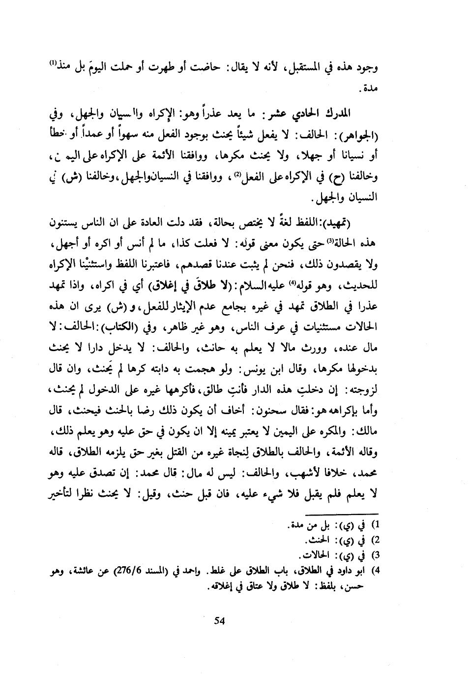 وُجُودِ هَذِهِ فِي الْمُسْتَقْبَلِ لِأَنَّهُ لَا يُقَالُ حَاضَتْ أَوْ طَهُرَتْ أَوْ حَمَلَتِ الْيَوْمَ بَلْ مُنْذُ مُدَّةٍ الْمَدْرَكُ الْحَادِي عَشَرَ مَا يُعَدُّ عذرا وَهُوَ الْإِكْرَاه والسيان وَالْجَهْلُ وَفِي الْجَوَاهِرِ الْحَالِفُ لَا يَفْعَلُ شَيْئًا يَحْنَثُ بِوُجُودِ الْفِعْلِ مِنْهُ سَهْوًا أَوْ عَمْدًا أَوْ خَطَأً أَوْ نِسْيَانًا أَوْ جَهْلًا وَلَا يَحْنَثُ مُكْرَهًا وَوَافَقَنَا الْأَئِمَّةُ عَلَى الْإِكْرَاهِ عَلَى الْيَمين وَخَالَفنَا ح فِي الْإِكْرَاهِ عَلَى الْفِعْلِ وَوَافَقَنَا فِي النِّسْيَانِ وَالْجَهْلِ وَخَالَفَنَا ش فِي النِّسْيَانِ وَالْجَهْلِ تَمْهِيدٌ اللَّفْظ لُغَة لَا يخْتَص بِحَالَة فقد دلّت الْعَادة على أَن النَّاس يستنون هَذِهِ الْحَالَةَ حَتَّى يَكُونَ مَعْنَى قَوْلِهِ لَا فَعَلْتُ كَذَا مَا لَمْ أَنْسَ أَوْ أُكْرَهْ أَوْ أَجْهَلْ وَلَا يَقْصِدُونَ ذَلِكَ فَنَحْنُ لَمْ يَثْبُتْ عِنْدَنَا قَصْدُهُمْ فَاعْتَبَرْنَا اللَّفْظَ وَاسْتَثْنَيْنَا الْإِكْرَاهَ لِلْحَدِيثِ وَهُوَ قَوْلُهُ عَلَيْهِ السَّلَامُ لَا طَلَاقَ فِي إِغْلَاقٍ أَيْ فِي إِكْرَاهٍ وَإِذَا تَمَهَّدَ عذرا فِي الطَّلَاقِ تَمَهَّدَ فِي غَيْرِهِ بِجَامِعِ عَدَمِ الإيثار للْفِعْل وش يَرَى أَنَّ هَذِهِ الْحَالَاتِ مُسْتَثْنَيَاتٌ فِي عُرْفِ النَّاسِ وَهُوَ غَيْرُ ظَاهِرٍ وَفِي الْكِتَابِ الْحَالِفُ لَا مَالَ عِنْدَهُ وَوَرِثَ مَالًا لَا يَعْلَمُ بِهِ حَانِثٌ وَالْحَالِفُ لَا يَدْخُلُ دَارًا لَا يَحْنَثُ بِدُخُولِهَا مُكْرَهًا وَقَالَ ابْنُ يُونُسَ وَلَوْ هَجَمَتْ بِهِ دَابَّتُهُ كُرْهًا لَمْ يَحْنَثْ وَإِنْ قَالَ لِزَوْجَتِهِ إِنْ دَخَلْتِ هَذِهِ الدَّارَ فَأَنْتِ طَالِقٌ فَأَكْرَهَهَا غَيْرُهُ عَلَى الدُّخُولِ لَمْ يَحْنَثْ وَأَمَّا بِإِكْرَاهِهِ هُوَ فَقَالَ سَحْنُونٌ أَخَافُ أَنْ يَكُونَ ذَلِكَ رِضًا بِالْحِنْثِ فَيَحْنَثَ قَالَ مَالِكٌ وَالْمُكْرَهُ عَلَى الْيَمِينِ لَا يُعْتَبَرُ يَمِينُهُ إِلَّا أَنْ يَكُونَ فِي حَقٍّ عَلَيْهِ وَهُوَ يَعْلَمُ ذَلِك وَقَالَ الْأَئِمَّةُ وَالْحَالِفُ بِالطَّلَاقِ لِنَجَاةِ غَيْرِهِ مِنَ الْقَتْلِ بِغَيْرِ حَقٍّ يَلْزَمُهُ الطَّلَاقُ قَالَهُ مُحَمَّدٌ خِلَافًا لِأَشْهَبَ وَالْحَالِفُ لَيْسَ لَهُ مَالٌ قَالَ مُحَمَّدٌ إِنْ تُصُدِّقْ عَلَيْهِ وَهُوَ لَا يَعْلَمُ فَلَمْ يَقْبَلْ فَلَا شَيْءَ عَلَيْهِ فَإِنْ قَبِلَ حَنِثَ وَقِيلَ لَا يَحْنَثُ نَظَرًا لِتَأْخِيرِ