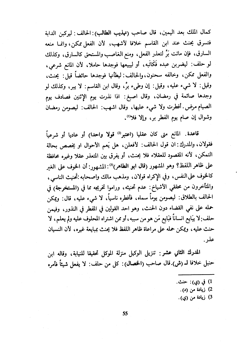 كَمَالِ الْمِلْكِ بَعْدَ الْيَمِينِ قَالَ صَاحِبُ تَهْذِيبِ الطَّالِبِ الْحَالِفُ لَيَرْكَبَنَّ الدَّابَّةَ فَتُسْرَقُ يَحْنَثُ عِنْدَ ابْنِ الْقَاسِمِ خِلَافًا لِأَشْهَبَ لِأَنَّ الْفِعْلَ مُمْكِنٌ وَإِنَّمَا مَنَعَهُ السَّارِقُ فَإِنْ مَاتَتْ بَرَّ لِتَعَذُّرِ الْفِعْل وَمنع الغاضب وَالْمُسْتَحِقِّ كَالسَّارِقِ وَكَذَلِكَ لَوْ حَلَفَ لَيَضْرِبَنَّ عَبْدَهُ فَكَاتَبَهُ أَوْ لَيَبِيعَهَا فَوَجَدَهَا حَامِلًا لِأَنَّ الْمَانِعَ شَرْعِيٌّ وَالْفِعْلَ مُمْكِنٌ وَخَالَفَهُ سَحْنُونٌ وَالْحَالِفُ لَيَطَأَنَّهَا فَوَجَدَهَا حَائِضًا قِيلَ يَحْنَثُ وَقِيلَ لَا شَيْءَ عَلَيْهِ وَقيل إِن وطىء بَرَّ وَقَالَ ابْنُ الْقَاسِمِ لَا يَبَرُّ وَكَذَلِكَ لَوْ وَجَدَهَا صَائِمَةً فِي رَمَضَانَ وَقَالَ أَصْبَغُ إِذَا نَذَرَتْ يَوْمَ الِاثْنَيْنِ فَصَادَفَ يَوْمَ الصِّيَامِ مَرَضٌ أَفْطَرَتْ وَلَا شَيْءَ عَلَيْهَا وَقَالَ أَشْهَبُ الْحَالِفُ لَيَصُومَنَّ رَمَضَانَ وَشَوَّالَ إِنْ صَامَ يَوْمَ الْفِطْرِ بَرَّ وَإِلَّا فَلَا قَاعِدَةٌ الْمَانِعُ مَتَى كَانَ عَقْلِيًّا اعْتُبِرَ قَوْلًا وَاحِدًا أَوْ عَادِيًّا أَوْ شَرْعِيًّا فَقَوْلَانِ وَالْمَدْرَكُ أَنَّ قَوْلَ الْحَالِفِ لَأَفْعَلَنَّ هَلْ يَعُمُّ الْأَحْوَالَ أَوْ يُخَصَّصُ بِحَالَةِ التَّمَكُّنِ لِأَنَّهُ الْمَقْصُودُ لِلْعُقَلَاءِ فَلَا يَحْنَثُ أَوْ يُفَرَّقُ بَيْنَ الْمُتَعَذِّرِ عَقْلًا وَغَيْرِهِ مُحَافَظَةً عَلَى ظَاهِرِ اللَّفْظِ وَهُوَ الْمَشْهُورُ قَالَ أَبُو الطَّاهِرِ الْمَشْهُورُ أَنَّ الْخَوْفَ عَلَى الْغَيْرِ كَالْخَوْفِ عَلَى النَّفْسِ وَفِي الْإِكْرَاهِ قَوْلَانِ وَمَذْهَبُ مَالِكٍ وَأَصْحَابِهِ تَحْنِيثُ النَّاسِي وَالْمُتَأَخِّرُونَ مِنْ مُحَقِّقِي الْأَشْيَاخِ عَدَمُ تَحْنِيثِهِ وَرَامُوا تَخْرِيجَهُ مِمَّا فِي الْمُسْتَخْرَجَةِ فِي الْحَالِفِ بِالطَّلَاقِ لَيَصُومَنَّ يَوْمًا سَمَّاهُ فَأَفْطَرَهُ نَاسِيًا لَا شَيْءَ عَلَيْهِ قَالَ وَيُمْكِنُ حَمْلُهُ عَلَى نَفْيِ الْقَضَاءِ دُونَ الْحِنْثِ وَهُوَ أَحَدُ الْقَوْلَيْنِ فِي الْمُفطر فِي النذور وفيمن حَلَفَ لَا يُبَايِعُ إِنْسَانًا فَبَايَعَ مَنْ هُوَ مِنْ سَبَبِهِ أَوْ مِمَّنِ اشْتَرَاهُ الْمَحْلُوفُ عَلَيْهِ وَلم يعلم وَلَا حِنْثَ عَلَيْهِ وَيُمْكِنُ حَمْلُهُ عَلَى مُرَاعَاةِ ظَاهِرِ اللَّفْظِ فَلَا يَحْنَثُ بِمُبَايَعَةِ غَيْرِهِ لِأَنَّ النِّسْيَانَ عُذْرٌ الْمَدْرَكُ الثَّانِي عَشَرَ تَنْزِيلُ الْوَكِيلِ مَنْزِلَةَ الْمُوكل تَحْقِيقًا لِلنِّيَابَةِ وَقَالَهُ ابْنُ حَنْبَلٍ خِلَافًا لِ ش وَقَالَ صَاحِبُ الْخِصَالِ كُلُّ مَنْ حَلَفَ لَا يَفْعَلُ شَيْئا فَأمره