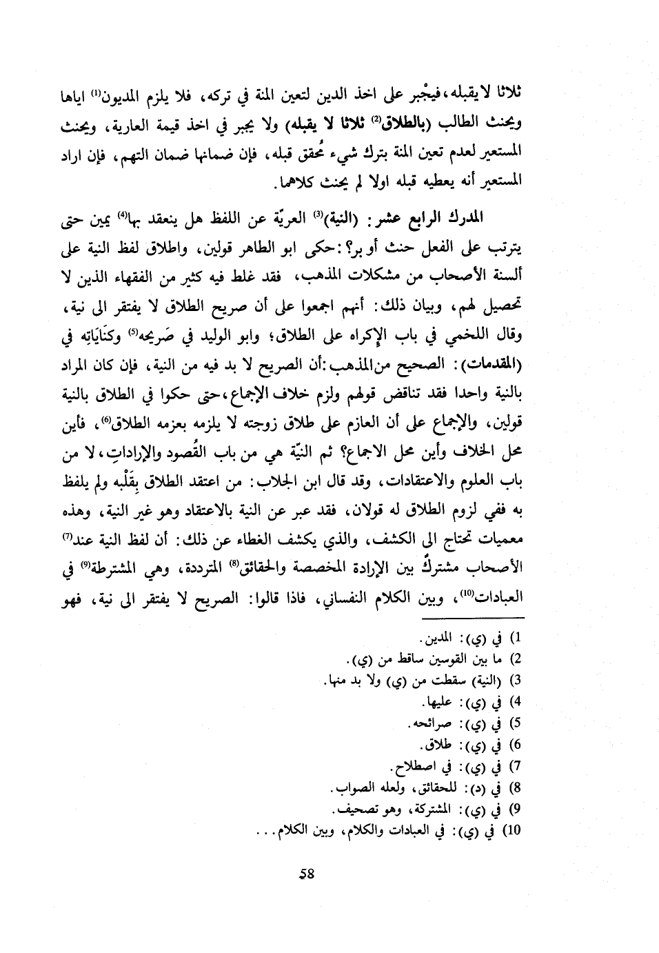 ثَلَاثًا لَا يَقْبَلُهُ فَيُجْبَرُ عَلَى أَخْذِ الدَّيْنِ لِتَعَيُّنِ الْمِنَّةِ فِي تَرْكِهِ فَلَا يَلْزَمُ الْمَدْيُونَ إِيَّاهَا وَيَحْنَثُ الطَّالِبُ بِالطَّلَاقِ ثَلَاثًا لَا يَقْبَلُهُ وَلَا يُجْبَرُ فِي أَخْذِ قِيمَةِ الْعَارِيَةِ وَيَحْنَثُ الْمُسْتَعِير لعدم تعْيين الْمِنَّةِ بِتَرْكِ شَيْءٍ مُحَقَّقٍ قَبْلَهُ فَإِنَّ ضَمَانَهَا ضَمَانُ التُّهَمِ فَإِنْ أَرَادَ الْمُسْتَعِيرُ أَنَّهُ يُعْطِيهِ قبله أَولا لَمْ يَحْنَثْ كِلَاهُمَا الْمَدْرَكُ الرَّابِعَ عَشَرَ النِّيَّةُ الْعرية عَن اللَّفْظ هَلْ يَنْعَقِدُ بِهَا يَمِينٌ حَتَّى يَتَرَتَّبَ عَلَى الْفِعْل حنث أَو بر حَكَى أَبُو الطَّاهِرِ قَوْلَيْنِ وَإِطْلَاقُ لَفْظِ النِّيَّةِ على أَلْسِنَة الْأَصْحَاب من مشكلات الْمَذْهَب فَقَط غَلِطَ فِيهِ كَثِيرٌ مِنَ الْفُقَهَاءِ الَّذِينَ لَا تَحْصِيلَ لَهُمْ وَبَيَانُ ذَلِكَ أَنَّهُمْ أَجْمَعُوا عَلَى أَنَّ صَرِيحَ الطَّلَاقِ لَا يَفْتَقِرُ إِلَى نِيَّةٍ وَقَالَ اللَّخْمِيُّ فِي بَابِ الْإِكْرَاهِ عَلَى الطَّلَاقِ وَأَبُو الْوَلِيد فِي صَرِيحه وكناياته فِي الْمُقَدَّمَاتِ الصَّحِيحُ مِنَ الْمَذْهَبِ أَنَّ الصَّرِيحَ لَا بُدَّ فِيهِ مِنَ النِّيَّةِ فَإِنْ كَانَ الْمُرَادُ بِالنِّيَّةِ وَاحِدًا فَقَدْ تَنَاقَضَ قَوْلُهُمْ وَلَزِمَ خِلَافُ الْإِجْمَاعِ حَتَّى حَكَوْا فِي الطَّلَاقِ بِالنِّيَّةِ قَوْلَيْنِ وَالْإِجْمَاعُ عَلَى أَنَّ الْعَازِمَ عَلَى طَلَاقِ زَوْجَتِهِ لَا يلْزمه بعزمه الطَّلَاق فَأَيْنَ مَحَلُّ الْخِلَافِ وَأَيْنَ مَحَلُّ الْإِجْمَاعِ ثُمَّ النِّيَّةَ هِيَ مِنْ بَابِ الْقُصُودِ وَالْإِرَادَاتِ لَا مِنْ بَابِ الْعُلُومِ وَالِاعْتِقَادَاتِ وَقَدْ قَالَ ابْنُ الْجَلَّابِ مَنِ اعْتَقَدَ الطَّلَاقَ بِقَلْبِهِ وَلَمْ يَلْفِظْ بِهِ فَفِي لُزُومِ الطَّلَاقِ لَهُ قَوْلَانِ فَقَدْ عَبَّرَ عَنِ النِّيَّةِ بِالِاعْتِقَادِ وَهُوَ غَيْرُ النِّيَّةِ وَهَذِهِ مُعَمَّيَاتٌ تَحْتَاجُ إِلَى الْكَشْفِ وَالَّذِي يَكْشِفُ الْغِطَاءَ عَنْ ذَلِكَ أَنَّ لَفْظَ النِّيَّةِ عِنْدَ الْأَصْحَاب مُشْتَرك بَين الْإِرَادَة المخصصة والحقائق الْمُتَرَدِّدَةِ وَهِيَ الْمُشْتَرَطَةُ فِي الْعِبَادَاتِ وَبَيْنَ الْكَلَامِ النَّفْسَانِيِّ فَإِذَا قَالُوا الصَّرِيحُ لَا يَفْتَقِرُ إِلَى نِيَّة فَهُوَ